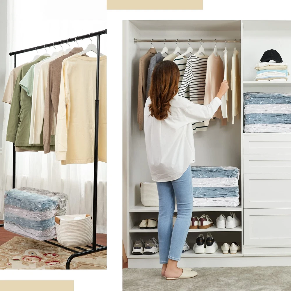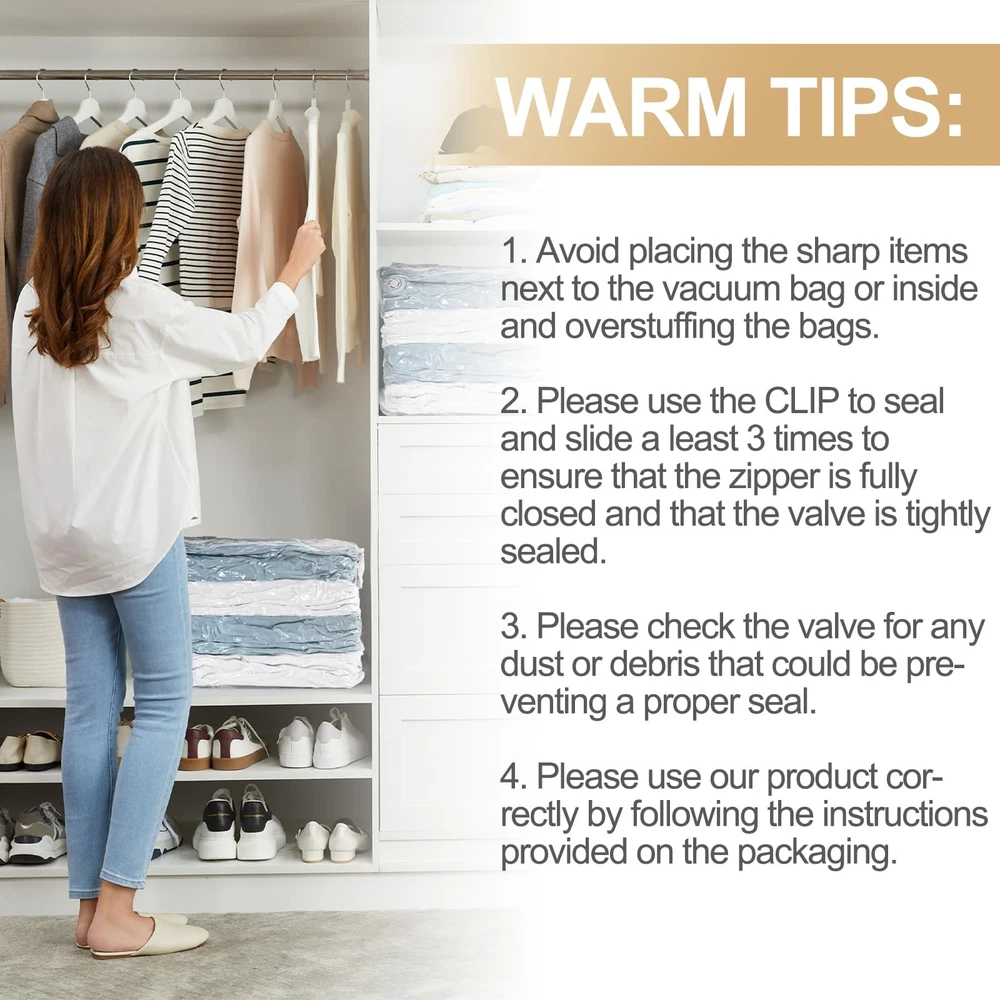is a corporation dedicating to produce household organization products such as space saver bags and suction cup organizers. We have 20 years of experience and are also a supplier to many famous brands. We aim to provide you with cozy and convenient home life! As your private closet organizer, our bags are strong and durable, designed to be used over and over again. Simply open the bag, fill, fold and vac it, and save 80% of the space of your home immediately. Works with any regular vacuum cleaner: upgraded valve makes exhaust faster. space saver bags are so spacious that it can store 3-5 quilts, blankets, comforters, duvets with additional bottom surface. The bags don't lose shape it can stand upright all by itself. Our storage bags are easy to use when you are alone. One cube vacuum bag is equal to 4 ordinary bags. These space saver bags protects your bedding's and clothing from dust and water. Our jumbo cube vacuum storage bags are waterproof and airtight and save more space in wardrobes, closets, garages, basements, storeroom, checkroom, lofts and suitcases. Our bags are made of strong material to meet various purpose such as bedroom storage, moving storage, college dorm room essentials storage closet organizers and storage. 6 Pack Huge Cube Vacuum Storage Bags: space saver bags are so spacious that it can store 3-5 quilts, blankets, comforters, duvets with additional bottom surface. The bags don't lose shape it can stand upright all by itself. Our vacuum storage bags are easy to use when you are alone. One cube vacuum bag is equal to 4 ordinary bags Meets Different Requirements: Our jumbo vacuum storage bags are made of strong material to meet various purpose such as bedroom storage, moving storage, college dorm room essentials storage closet organizers and storage. It will be more convenient to seal the space saver vacuum storage bags by using the CLIP in the bags Upgraded Cap-free Air Valve: Now you can compress these space saving bags by any regular vacuum cleaner. You don't need to take a hand pump for travel or camping. It is 3 times faster than traditional valve which saves time and space while at home or traveling Better Protection: These vacuum sealer bags protect your bedding and clothing from dust and water. Our jumbo cube vacuum storage bags are waterproof and airtight and save more space in wardrobes, closets, garages, basements, storeroom, checkroom, lofts and suitcases Save More Space: Our cube vacuum storage bags give you better storage solutions and help you save more in less space. We focus on providing you with cozy and better home life by better organizing your clothes and sorting your bedding's. Keep your life clean, tidy and convient all year round