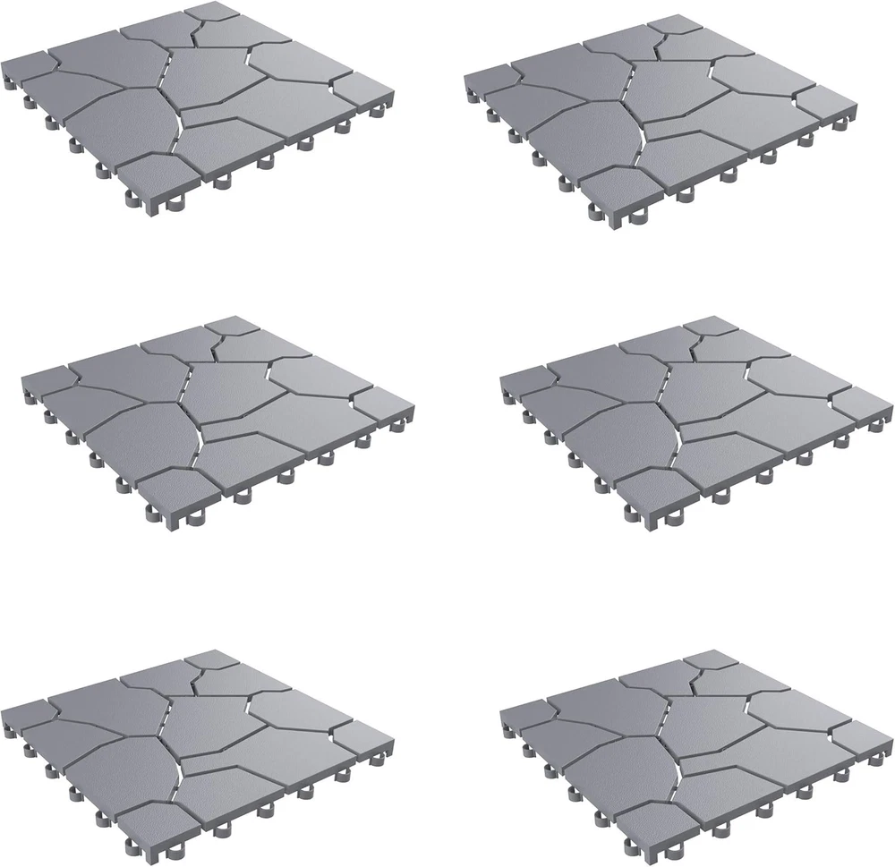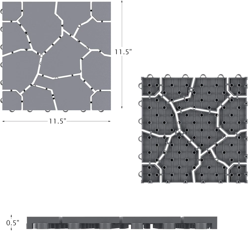 6-PACK OF OUTDOOR PAVERS - This 6-pack of balcony flooring pavers allow airflow and water drainage for durability. Constructed from weather- and fade-resistant materials, these floor tiles won't swell or decay and work well in direct sunlight. FUSS-FREE INSTALLATION - Install the patio deck tiles quickly and easily without using any tools. Before starting the installation of the campsite flooring, make sure that the installation area is properly leveled and flat and cleared of any debris. AMPLE COVERAGE - Plan DIY home improvement projects with these patio floor tiles to change the look and feel of your space. Each deck tile measures 11.5-inches and covers 5.5-square-feet in total, so you know how many you need to fit your space. VERSATILE USE - Use the outdoor tile as balcony décor, garage flooring, or patio accessories. An alternative to vinyl or wood floor tiles, the outdoor patio flooring has a stylish design that will enhance the look of any indoor or outdoor space. PRODUCT DETAILS - Materials: Polypropylene. Dimensions: Individual Tiles: (L) 11.5" x (W) 11.5" x (H) 0.5"; Coverage Area: 5.5-square-feet. Includes: 6 Tiles per Carton. Color: Stone Gray.