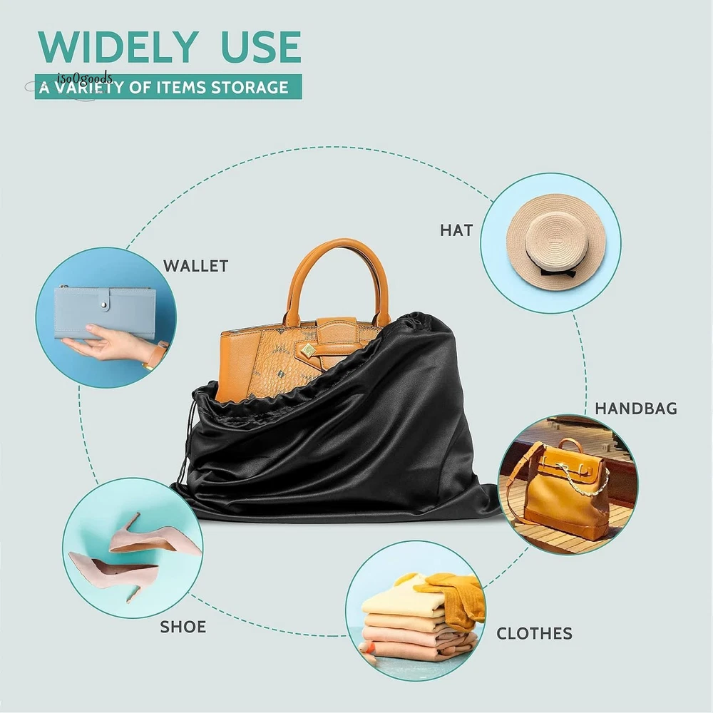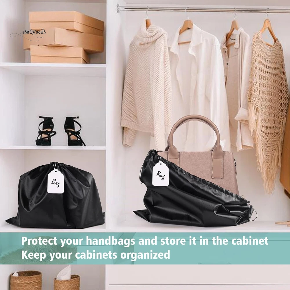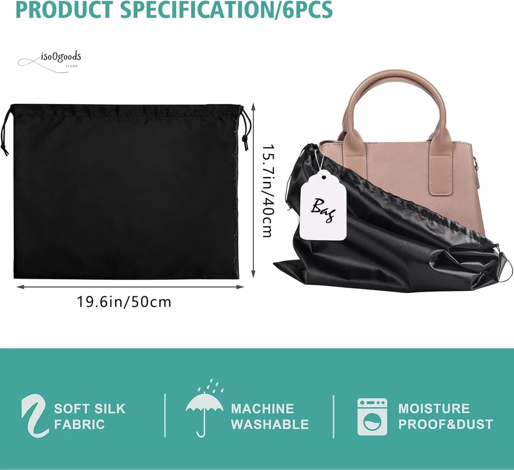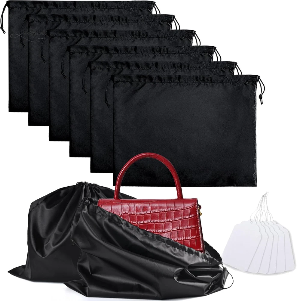 Protect Your Valuables in Style with These Premium Dust Bags! Perfect Fit for All Your Essentials: Measuring 19.6 x 15.7 inches, this 6-pack of black dust bags is ideal for handbags, purses, shoes, boots, toiletries, and cosmetics. Keep your items dust-free, organized, and ready to go! Premium Silk Material: Crafted from soft, breathable silk fabric, these bags are gentle on your items. The smooth texture prevents scratches, sticking, or fabric marks, ensuring your valuables stay pristine. Convenient Drawstring Closure: Each bag features dual drawstrings for a secure, adjustable closure. Easy to pull and tightly seal, keeping your items safe from spills and dust. Folds flat for storage when not in use. Washable and Reusable: Designed for long-term use, these dust bags are easy to clean. Machine-washable on a gentle cycle or hand-wash for quick refreshes. Hang to dry and reuse endlessly! Stay Organized with Labels: Includes paper tags for quick identification—write down which bag holds which item to avoid confusion and save time. Why Choose These Dust Bags? Versatile Protection: Perfect for travel, closet storage, or daily organization. Space-Saving Design: Compact and foldable, these bags won’t clutter your space. Durable and Lightweight: Built to last without adding bulk to your storage. Keep your items in top condition while staying effortlessly organized. Order now to upgrade your storage game with these stylish and functional dust bags!