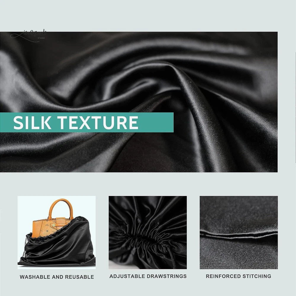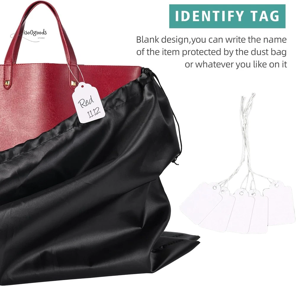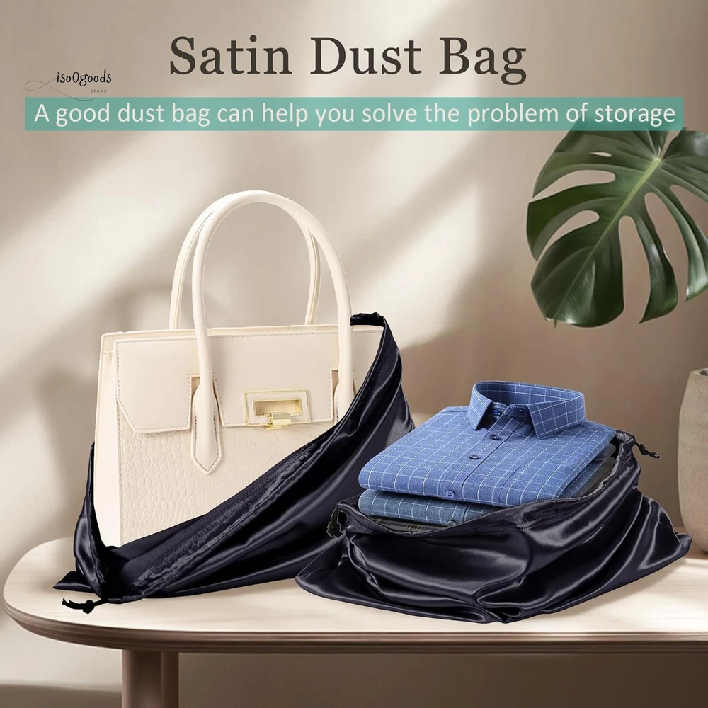 Protect Your Valuables in Style with These Premium Dust Bags! Perfect Fit for All Your Essentials: Measuring 19.6 x 15.7 inches, this 6-pack of black dust bags is ideal for handbags, purses, shoes, boots, toiletries, and cosmetics. Keep your items dust-free, organized, and ready to go! Premium Silk Material: Crafted from soft, breathable silk fabric, these bags are gentle on your items. The smooth texture prevents scratches, sticking, or fabric marks, ensuring your valuables stay pristine. Convenient Drawstring Closure: Each bag features dual drawstrings for a secure, adjustable closure. Easy to pull and tightly seal, keeping your items safe from spills and dust. Folds flat for storage when not in use. Washable and Reusable: Designed for long-term use, these dust bags are easy to clean. Machine-washable on a gentle cycle or hand-wash for quick refreshes. Hang to dry and reuse endlessly! Stay Organized with Labels: Includes paper tags for quick identification—write down which bag holds which item to avoid confusion and save time. Why Choose These Dust Bags? Versatile Protection: Perfect for travel, closet storage, or daily organization. Space-Saving Design: Compact and foldable, these bags won’t clutter your space. Durable and Lightweight: Built to last without adding bulk to your storage. Keep your items in top condition while staying effortlessly organized. Order now to upgrade your storage game with these stylish and functional dust bags!