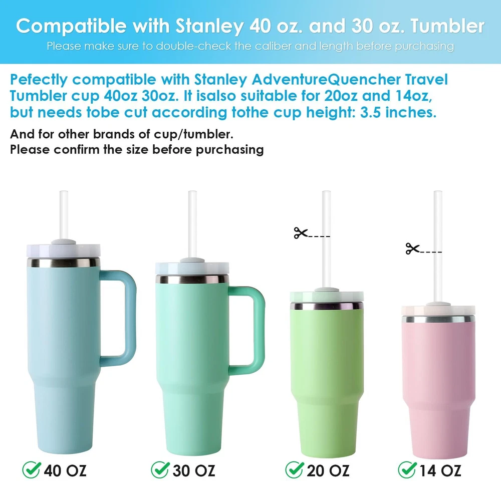 【Perfect Fit, Zero Leaks】 6 pack stanley straws including 3 Straight,3 Bent and 2 Cleaning Brushes. The size is 12 inch long and 0.39 inch wide diameter.Designed to fit Stanley Quencher H2.0 FlowState 40oz Tumbler and Stanley Adventure Quencher Travel Tumbler 30oz & 40oz. Silicone straws offer a perfect fit and a leak-proof experience. No more spills or messy mishaps – just hassle-free sipping and savoring your favorite beverages wherever you go. 【Adjustable Length for Various Cups】 The extra long silicone straws can be easily cut to accommodate cups of different heights, ensuring a perfect fit for your beverages in any size of cup or glass. 【Eco-Friendly and Reusable】 Join the eco-conscious movement and say goodbye to single-use plastics! Our stanley cup straws are the perfect alternative to disposable options, reducing waste and environmental impact. Made from premium food-grade silicone, they are durable, flexible, and built to last, making them your go-to reusable straws. 【Easy to Clean and Maintain】 Cleaning up after a refreshing sip has never been easier. Our stanley silicone straws 40 oz replacement set includes a cleaning brush, making cleanup a breeze. Rinse them under running water or pop them in the dishwasher – it's that simple! Spend more time sipping and less time on tedious cleanup. 【Great Gifts & Reliable Customer Service】For any quality-related issues( such as damaged ),please contact us immediately, we will send you a replacement for free! Great gifts choice for your families and friends who have a Stanley 40oz & 30oz Adventure Quencher Travel Tumbler.