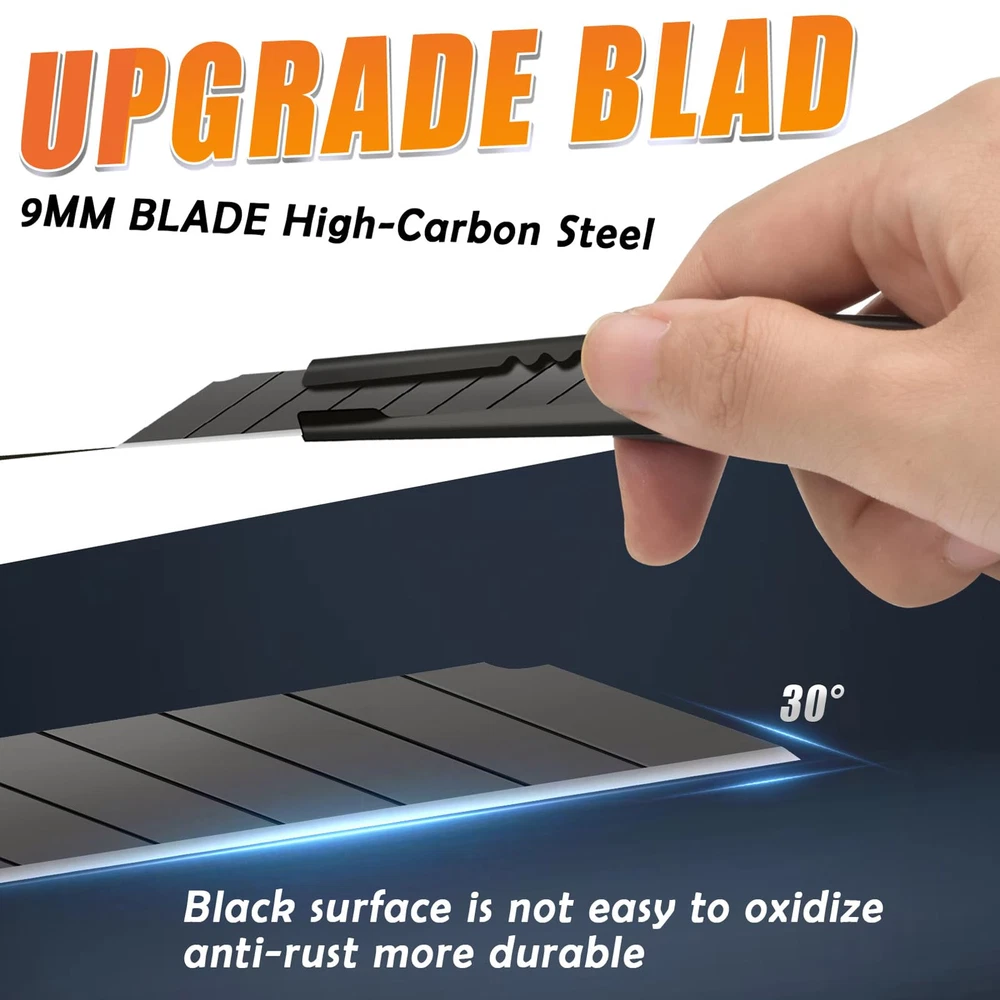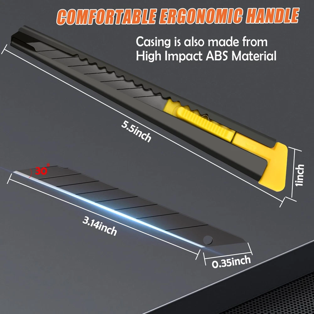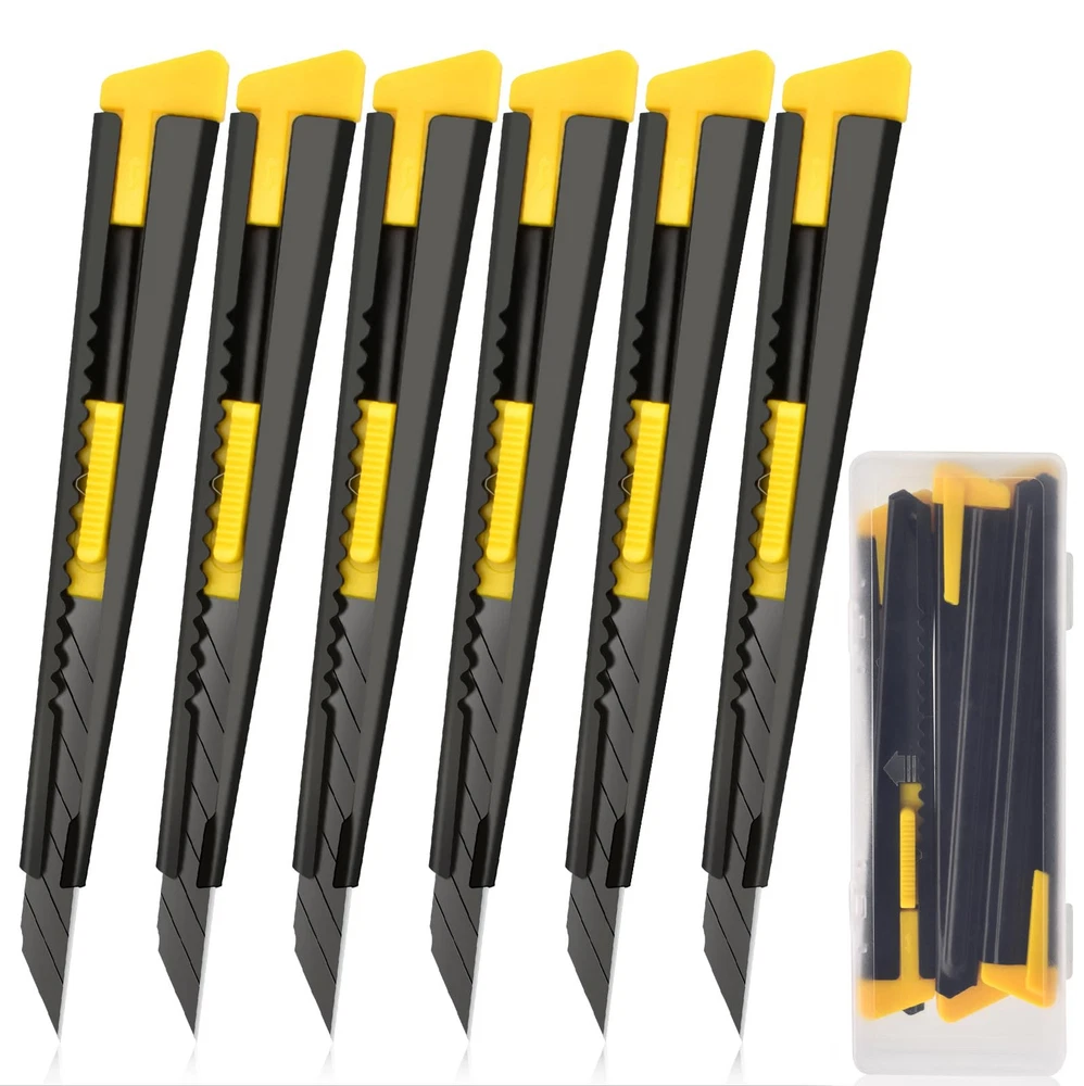 Upgrade Blade: The utility knife blade is made of high grade carbon steel, The upgraded blade angle has been designed with a larger bevel, which is better for cutting and also improves blade durability and cutting accuracy. The 9mm blade has 8 razor-sharp snap-off segments, and in addition, the black blade provides additional corrosion resistance over the regular blade, which extends the life of the blade. Upgrade Metal Handle: The box knife handle is made of metal casing material and thickened, Provides a comfortable feel and grip for stability and comfort when using the box cutter, as well as some protection from damage or loss of the internal blade. Box Cutter Retractable: The retractable design is easy to use and store, you can press the slide to control the retraction of the blade, and the locking function allows you to operate even with one hand, making your work easier. Multipurpose Tool: Utility knife retractable can be used for cardboard, foam board, paper, plastic, box, tape, crafts, vinyl, leather, PVC materials, etc. Practicality making it an home office essentials too, Can also be used as a spare utility knife in the garage Package Contains: You will receive 6 sets of utility knives retractable, Box packaging makes storage more convenient.