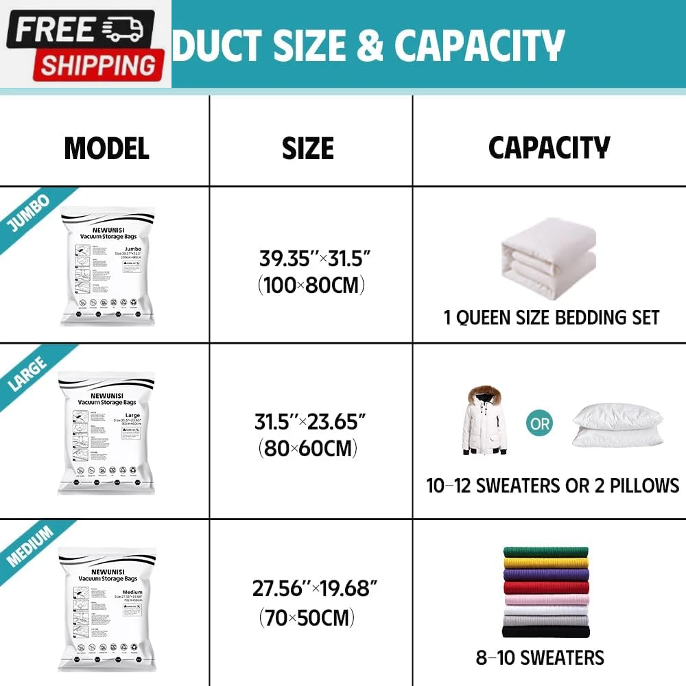 6 Pack Vacuum Storage Bags, Vacuum Seal Bags for Clothing, Comforters, Blankets, Space Saver Compression Bags with Hand Pump. (2×Jumbo, 2×Large, 2×Medium) Vacuum Seal Storage Bags: Variety sizes space saver vacuum storage bags for multiple sizes of items including clothes, comforters, pillows, and bedding. Volume reduction of 80%. Hand Pump Included for Easy Use: Works with a standard vacuum cleaner. Put the items in our storage vacuum bag, seal the zipper, suck out the air, and close the lid. 1 hand pump is included in the combo, which can be used during your trips. PA & PE: The compression bag is made of extra thick PA+PE, With a triple-seal turbo valve & double zipper seal design. Don’t worry about the long-term effects of storage in compression bags. Multi-use: Our vacuum storage bags are essentials for saving household space and organizing travel. It functions as a storage bag for clothes, comforters, and blankets. Package Included: 2×Jumbo(39.37” X27.5”); 2×Large: (31.5” X 26.65”); 2×Medium: (27.56” X 19.68”); 1×Hand Pump. Product Description Our vacuum storage bags combination is a must-have for you to save storage space! The compression bag is made of PA+PE material, which is highly flexible, durable, not easy to leak, and can be reused. Use our space-saver bags and store away various items including clothes, bedding clothes, blankets, pillows, plush toys, and more. What's more: you can use our compression bags to reduce larger and fluffier items such as vests and winter coats to minimal sizes with ease giving your clothing full protection and keeping your outfit dry. The package has vacuum storage bags of different sizes, suitable for various purposes: storage, travel, camping, moving, etc. 6 Pack Includes 2× Jumbo: 39.37” X 31.5”(100cm X 80cm) 2× Large: 31.5” X 23.65”(80cm X 60cm) 2× Medium: 27.56”X 19.68”(70cm X 50cm) 1× Hand Pump How To Use a Vacuum Storage Bag: PACK: Put the items inside our vacuum storage bag SEAL: Zip along the dual-zip 2-3 times and ensure the zipper is fully sealed VACUUM: Suck all the air out with a vacuum cleaner/hand pump included STORE: Close and secure the valve cap Usage Tips : Dehydrate all items before putting them away and storing them in vacuum bags. Avoid over-stuffing beyond the max volume line, use multiple bags instead. Double-check the zippers for full closure, and avoid stuff with sharp corners. Check leaking holes if there is a "hiss" sound, sticky tape should fix this problem. Re-vacuum the bags every 3-4 months for long-term storage. Vacuum storage is not suitable for down fibers and leather items. Shipping Fast shipping is very important for us. Our standard US shipping service is FREE. Your order will be shipped within 2-3 business days upon full payment received. Your order will be delivered within 2-3 business days after the handling time. We only ship to the confirmed PayPal address. We reserve the right to cancel any order for any reason at any time. We are not responsible for undeliverable addresses. Returns and payment We offer a 30 days return policy from checkout winning date. We allow only PayPal as payment method FeedBack Your feedback very important to us, after you get your package and you are satisfied with our service please leave us positive feedback If you have any problem with your order / any questions please before leave any type of feedback For any questions, using eBay contact system Please visit our eBay store to check out other items for sale! Thank you for shopping at our store.