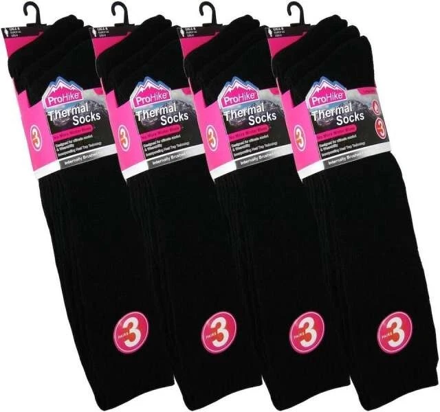 Ladies Long Hose Thick Brushed Insulated Maximum Warmth Thermal Socks by ProHike These Ladies quality long hose thermal socks in a 3 pair cascade hanger pack feature an 80% acrylic mixture with brushed inner fibres for ultimate softness, extra warmth and protection from the cold, as well a soft gentle welt top for comfort. The perfect socks for lots of outdoor activities including camping, gardening, hiking, skiing, sports, walking and many more. Size: UK 4/8 (Eu 37/42) Colour: Black Comfort features: Heat trap technology Contents: 80% acrylic, 20% polyester