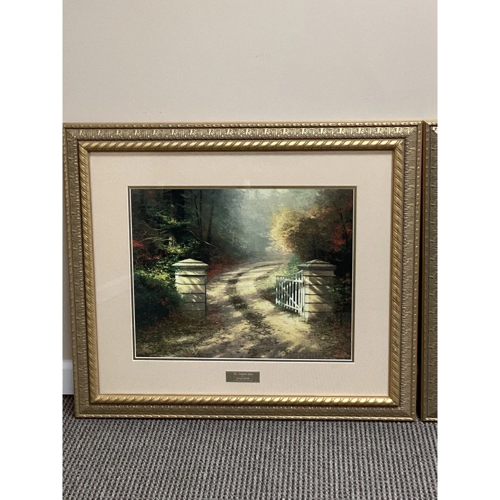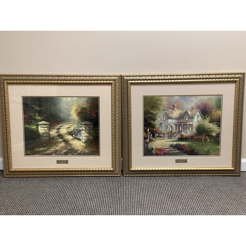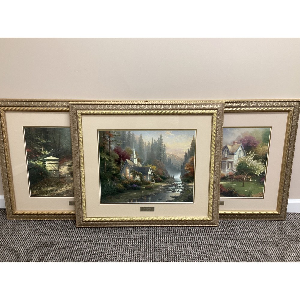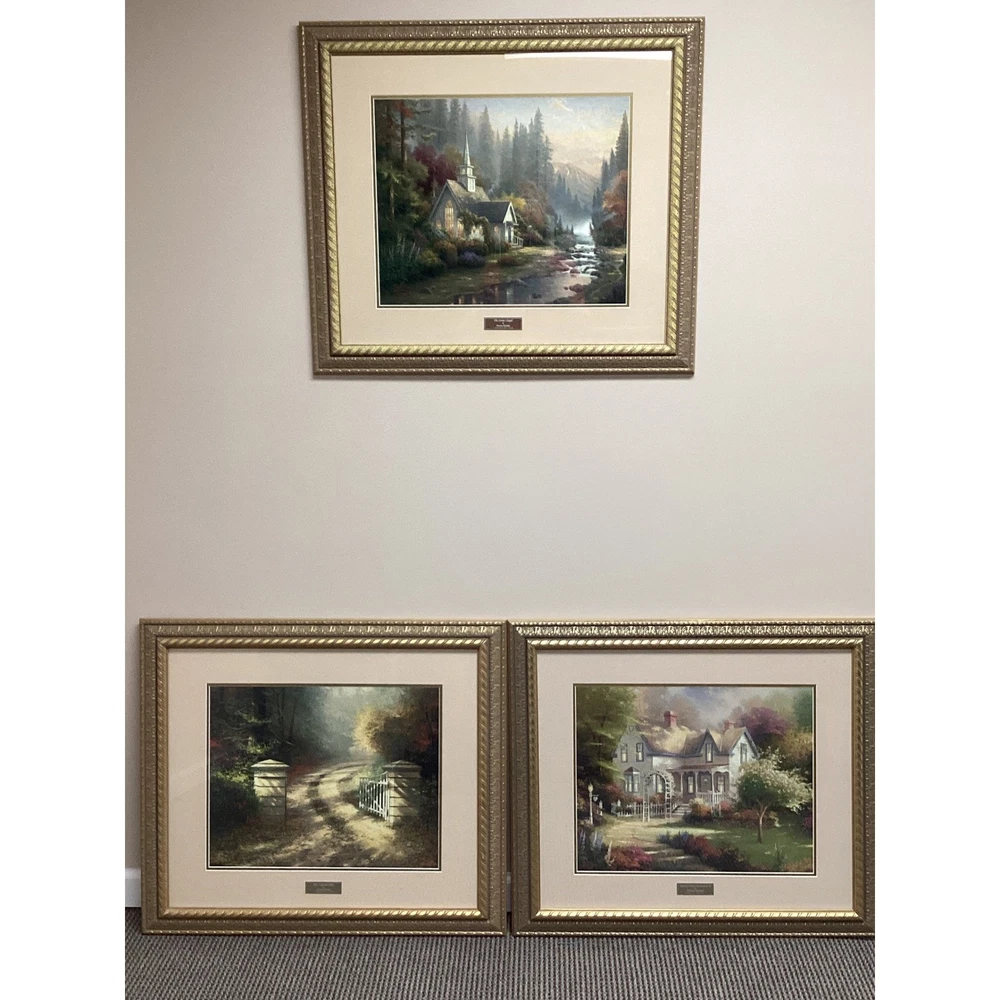 Tranquility radiates from this captivating collection of three Thomas Kinkade framed prints, ready to infuse your home with the Painter of Light's signature warmth. Transport yourself to idyllic scenes: A serene chapel nestled beside a flowing stream, a welcoming cottage embraced by blossoming gardens, and a rustic gate leading to a sun-dappled path. Type: Print Subject: Cottage Landscape Material: Paper Style: Cottagecore Features: Framed, Ready To Hang, Decorative Character Family: Thomas Kinkade Room: Living Room, Bedroom, Office, Study, Any Room Color: Gold Character: Cottage, Chapel, Stream, Garden, Gate Department: Adults, Teens, Kids Keywords: Thomas Kinkade, framed art, cottage art, landscape art, home decor, wall art, vintage art, gift idea, art print, gold frame, pictures, paintings