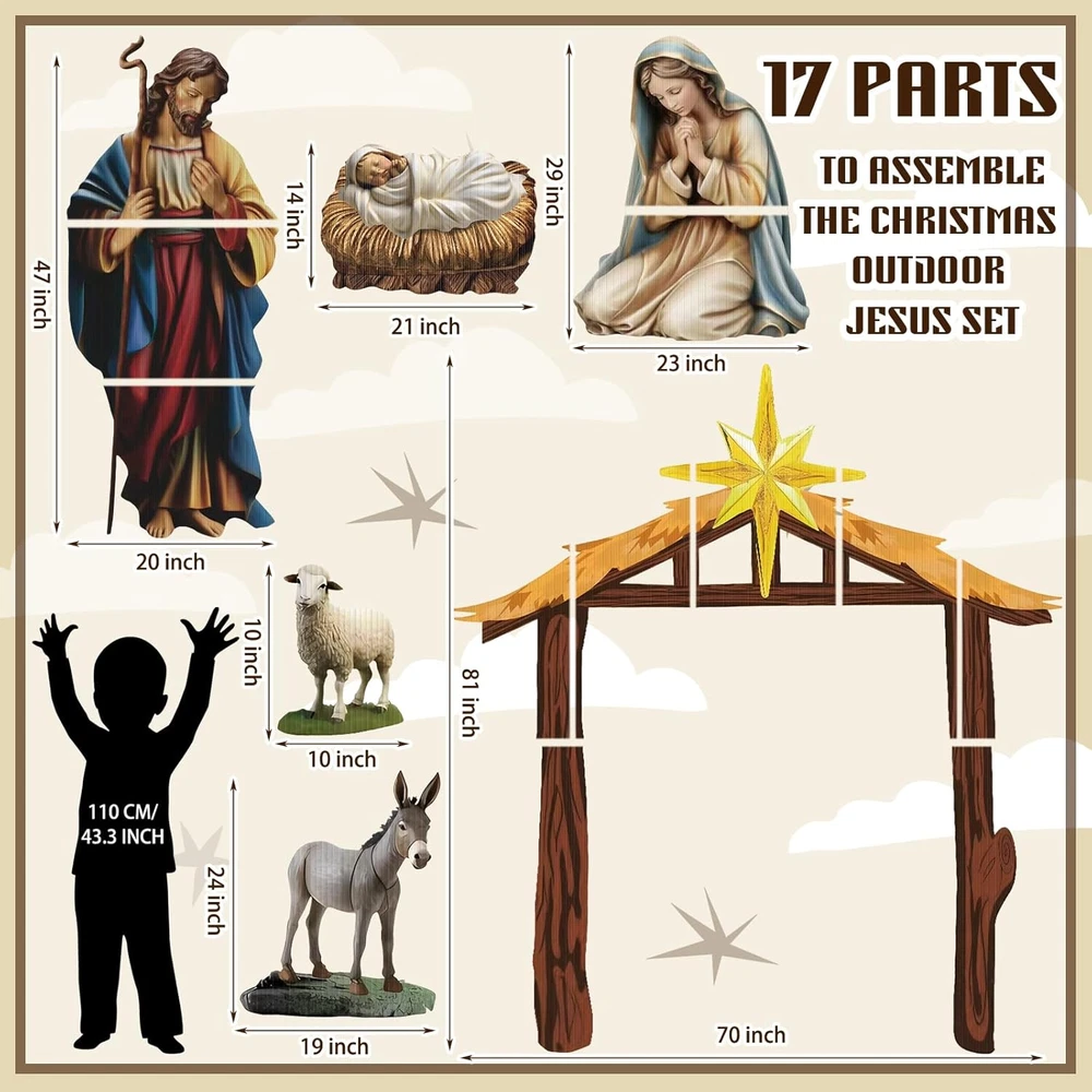 Menu Other Items Feedbacks About Us Contact Us Add To Favorites 6 Pcs Christmas Outdoor Nativity Set 6.7Ft Large Manger Christmas Yard Signs Nativity Outdoor Christmas Decorations Religious Holy Jesus Birth Manger Scene Supplies with Stake for Xmas Lawn Christmas Outdoor Nativity Set: you will receive a complete nativity outdoor grounding set including the Holy Family, stable, donkeys and sheep,packaged with 17 parts for convenient transportation;This outdoor nativity scene can show your religious beliefs and support,realistic and bright,ensuring to provide a well rounded and robust aesthetic effect on your christmas outdoor decoration Reliable Material to Support Your Usage: with Christmas outdoor yard signs stakes made from corrugated plastic cardboard signs and metal stakes, our outdoor nativity sets are not just visually pleasing but also highly sturdy, these strong and solid materials ensure the longevity of our product and enhance its performance even in outdoor conditions Large Sizes and Diverse Decorative: our Christmas decorations outdoor yard come in various sizes, the size of the horse trough is 70 x 81 inches, the size of the Virgin Mary is 29 x 23 inches, the size of the baby is 21 x 14 inches, the size of the donkey is 19 x 24 inches, the size of the sheep is 10 x 10 inches, and the size of the man is 20 x 47 inches; This variety in size creates a beautiful tiers effect when displayed together, enhancing the space they are applied in Easy to Install and Use: our Christmas yard stakes, each with 2 metal stakes, are lightweight and easy to install; You just need to compare the pictures, assemble them together, splice them together with plastic pipes, and then insert the metal piles underground; It's simple and safe, whether you're setting it up for holidays or religious occasions, our Nativity kit is easy to use Various Applicable to Occasions: our Xmas outdoor nativity sets are fitting for diverse occasions, whether you are celebrating Christmas, Easter, or looking for an attractive year round landscape addition, including anniversaries, weddings, baptisms, baby showers and more; Their neutral colors blend seamlessly with different settings and themes Product Description Item Specification Item Weight 7.68 pounds Country of Origin China Package Dimensions 25 x 18 x 4 inches Dimensions Shipping Returns Additional Info Product Dimensions: 18.0 inches x 25.0 inches x 4.0 inches. Weight: 7.68 lb Fast shipping is very important for us. Our standard shipping service is FREE. Your order will be shipped within 1-3 business days upon full payment received. Most items are delivered within 3-5 business days, however, please allow 3-10 business days. We are shipping only to USA. We only ship to the confirmed Paypal address. We reserve the right to cancel any order for any reason at any time. We are not responsible for undeliverable addresses. We offer a 30 day return policy from checkout winning date. Your satisfaction is guaranteed! If for any reason you are unhappy with your item, just return it within 30 days for a full refund, minus shipping cost. Please contact us prior to initiating a return so that we can issue you a refund authorization. Items defective upon receipt must be packaged in their retail packaging as if new and returned with a detailed description of the problem. Return shipping fees are not refundable. We reserve the right to decline any returns if the above guidelines are not followed. All of our items, unless otherwise stated, will only run on 120 volts. Please check to make sure your country complies with these specifications. If you have a problem or question regarding your transaction please contact us before leaving any type of feedback. We will work with you to resolve any problem you may have.
