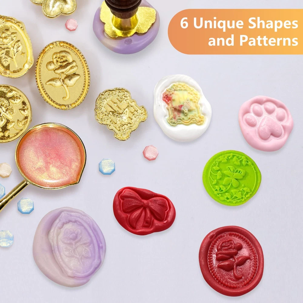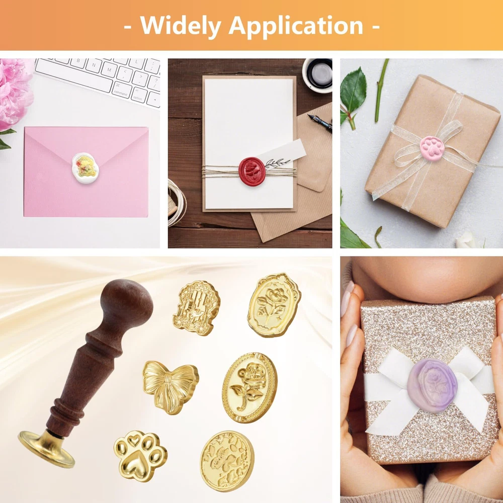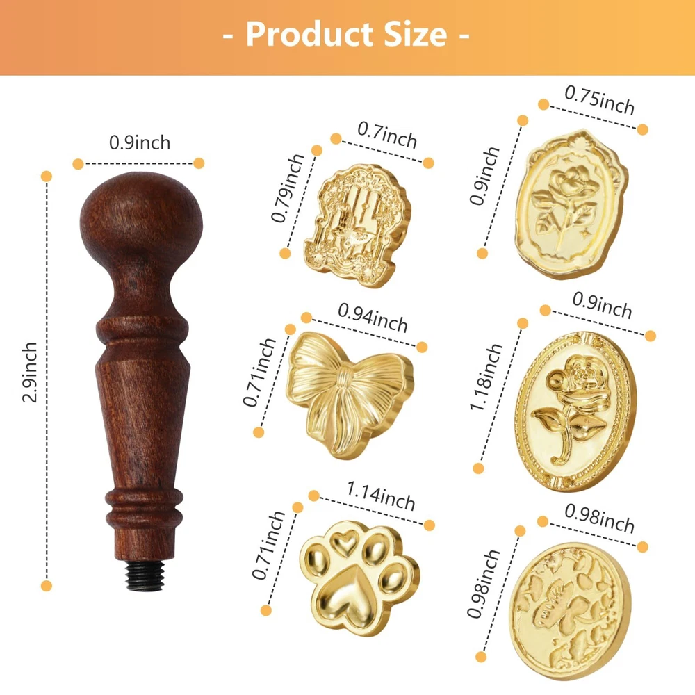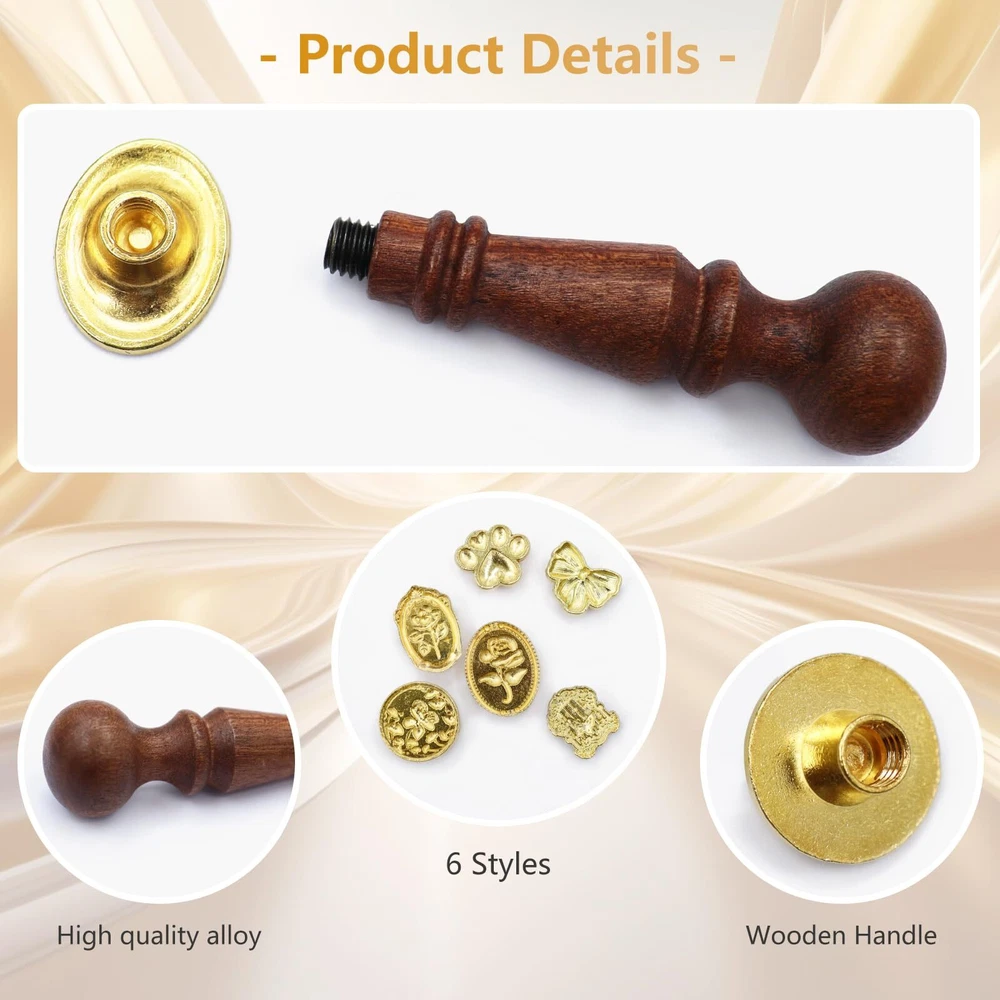 Package Includes: You will get 1 wooden handle and 6 different shapes wax seal stamp. Different retro classic designs on the stamp can be easily applied to many occasions. Material: The detachable wax seal stamp head is made of metal, and the pattern is exquisite and clear. The handle is made of lotus wood, which is comfortable to touch. Style and Size: The wax stamp seal head has different patterns and shapes, and the length of the wooden handle is 2.9 inches. Multiple Styles: The wax seal is not a traditional circular style, and the patterns are also innovative, including bows, cat claws, oval roses, vintage roses, window views, and circular butterfly flowers. Wide Application: This wax seal stamp kit can be used to seal a variety of different types of invitations or present packages, such as envelopes, wedding invitations, wine packaging, perfume packaging, packages, etc.