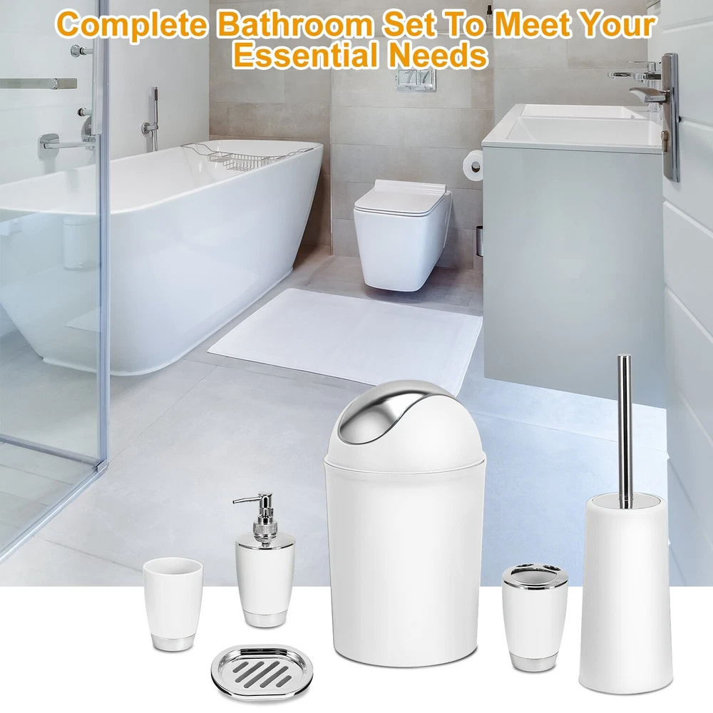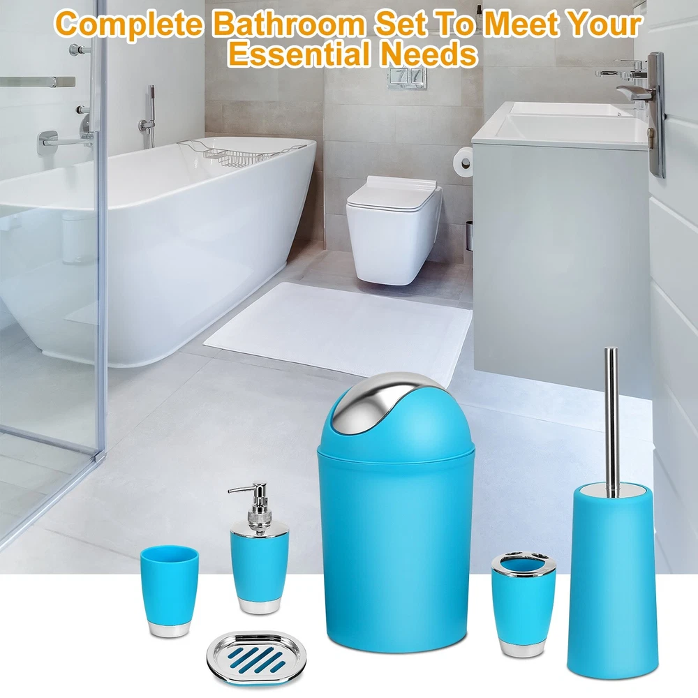 eBay 6Piece Bathroom Accessories Set Toothbrush Cup,Soap Dispenser Soap Dish Toilet Brush Holder Trash Can Product Detail Image Gallery Product Description Features: Reliable and Durable Made: Adopting high-grade PP materials and premium electroplating surface finish,our bathroom accessories set is hardness,toughness,lightweight,non-toxic,odorless and safe. Comparing to breakable glass-made one,it is more durable and secure to use. Complete Bathroom Set to Meet Your Essential Needs: 6 Pcs Bathroom Set,including 1pcs soap dispenser,1pcs soap dish,1pcs toilet trash can,1pcs toilet cleaning brush with holder,1pcs toothbrush holder and 1pcs tumbler. User-Friendly Design: The 360° cleanable toilet cleaning brush comes with a particular holder to hold it after use,the toothbrush holder adopts a smile face design to hold at least two brushes as well as toothpaste,at the bottom of the tumbler adopts anti-slipping design to make it stand steadier and at the middle of the soap dish adopts hollowed-out design to help dry the water on the soap,etc.. Excellent Bathroom Decorator: Adopting classic and elegant black as its main color and embellishing with sleek electroplating silver color,our bathroom accessories can match various styles of bathrooms. Great Gift: Our useful,practical and economical 6pcs bathroom essential accessories are a great gift for your families,friends and yourself. Specifications: Brand: New Home Product Type: Bathroom Accessories Set Material: PP Color Available: Black/White/Blue/Aqua/Pink/Purple Item Size: As the Picture Show Item Weight: 779g/1.72lbs Packaging Size: 19.5cm x 19.5cm x 26cm/7.68in x 7.68in x 10.24in (L x W x H) Packaging Weight: 926g/2.04lbs Package Contents: 1 x Bathroom Accessories Set (Totally includes 6 pieces) 1 x User Manual Terms & Conditions Thank you for your business !