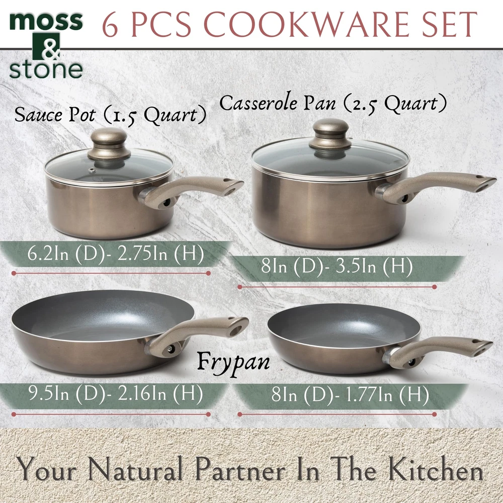 A Maximum Comfort: The pot and pan set is lightweight aluminum. It has a much more protective layer than metal pots and pans, corrosion and scratch-resistant. Bakelite's ergonomic handle can stay cool to prevent heat. Healthy Coating: Our pots and pans set nonstick with durable ceramic-tech coating, which allows you to use them without butter or olive oil to cook your favorite foods without worrying about your children's . Our home kitchen pots set is non-and free from PTFE & PFOA. Dishwasher safe. With All Heat Sources: Our cooking set is the solution for all kitchen cooking needs and can be used on all stoves, gas, , halogen, and induction. The bottom of the pot and pans use induction technology, which allows equal heat transfer throughout the pot for proper cooking. Complete Kitchen Set: The kitchen pots and pans set includes 1pc saucepot 1.5 quart, 1pc casserole pan 2.5 quart, 1pc frypan 8", 1pc frying pan 9.5", and 2 high-tempered see-through glass lids that are precisely the nonstick cookware sets that you need for your day-to-day cooking. Customer Support: pot sets for cooking nonstick are covered under a 1-year for our kitchen cookware sets or kitchen sets.