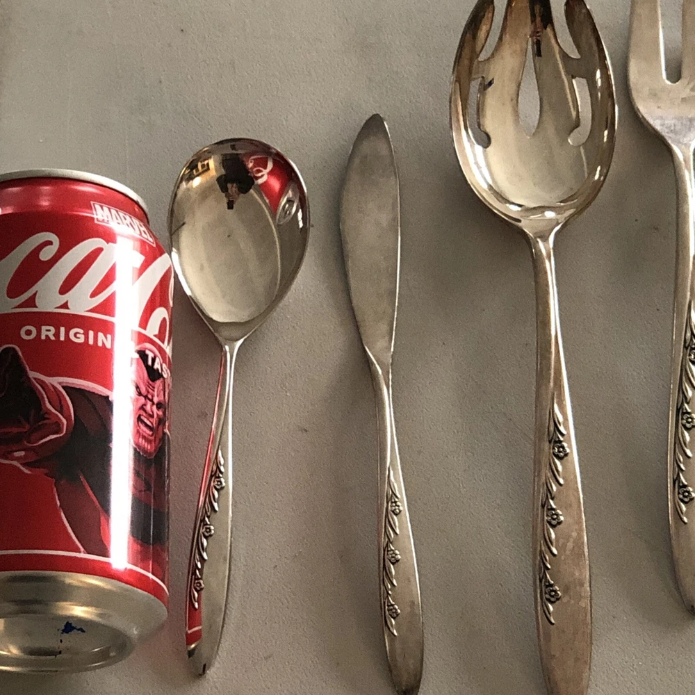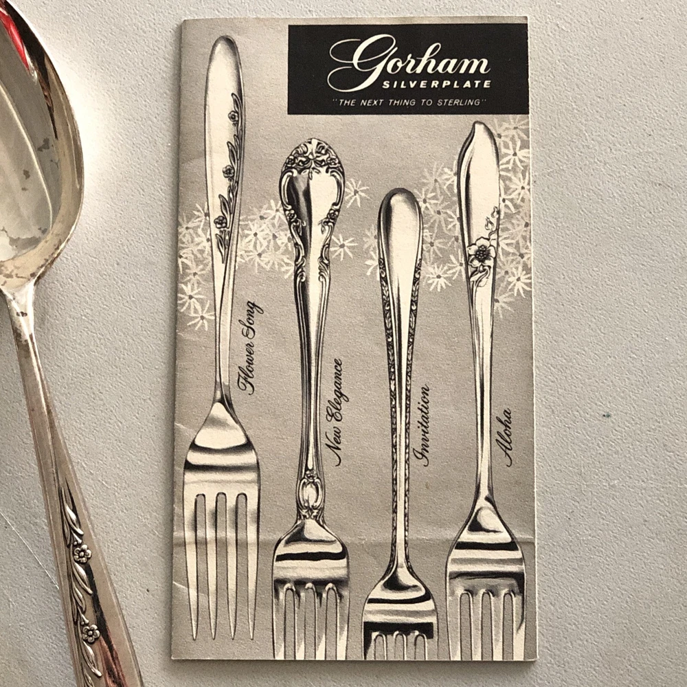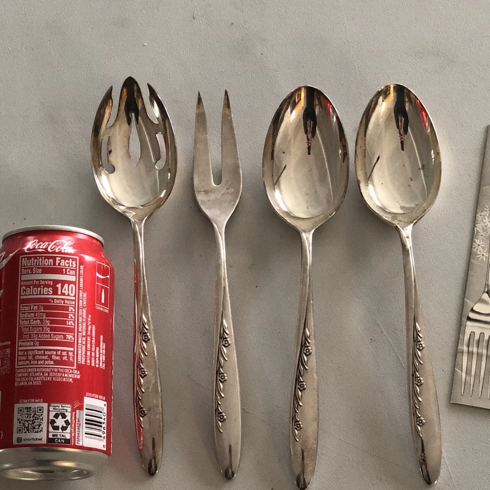 Gorham Silverplate Flower Song design 2 serving spoons 1 slotted spoon 1 meat fork 1 butter knife 1 jelly spoon Estate purchase from a couple who had been married over 60 years.