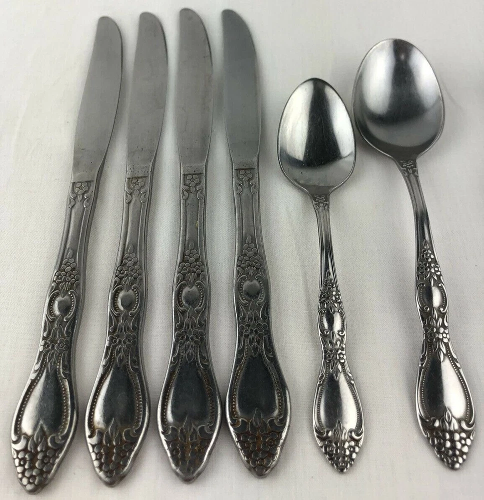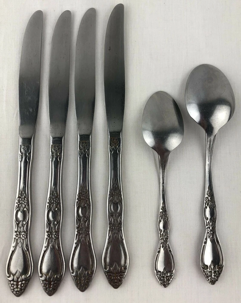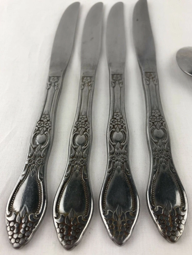 Wm A Rogers Oneida Flatware Lot includes: 4 dinner knives, 1 teaspoon and 1 tablespoons. Shows signs of light use and may need additional cleaning. Little spotting in places but no dishwasher or disposal damage. Overall very nice condition. Please see pictures for details as this is part of my description. Feel free to ask if you have any questions.