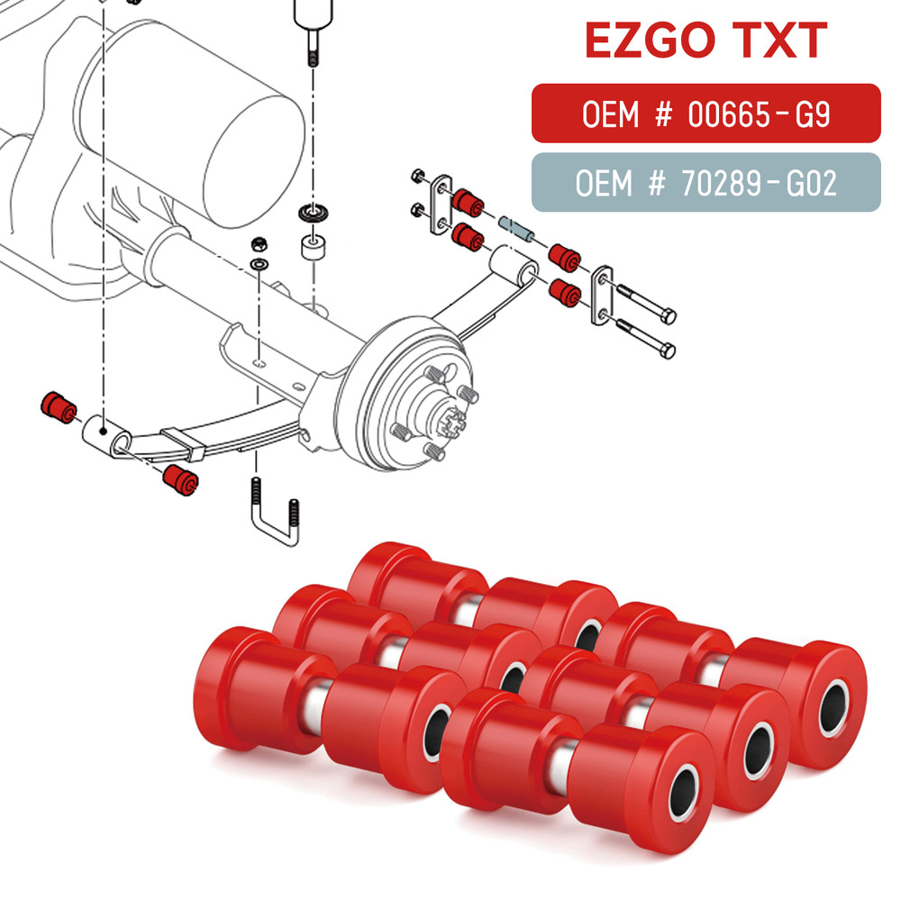 Product Description Brand: Hangkunnee Model: Golf Cart Rear Leaf Spring Bushing & Sleeve Kit for ezgo txt Apply For: Compatible with 1994-up EZGO TXT / Medalist, 1981-up Club Car DS gas and electric models(rear leaf spring) Size: You can find the more size detail from description picture Material: High Quality Polyurethane+Steel Function: This bushing kit will act as a buffer for your leaf springs and prevent metal-to-metal contact between the springs and shackles,will extend the life. Providing you better driving experience. Package List ezgo txt leaf springs bushings: Include 12pcs bushing, 6pcs sleeves and installation instructions. Replace spring bushing OEM# 70289-G02 1015583, spring sleeve OEM# 70291-G01 1012303. Install & Warranty 1. Easy Installation, this bench seat protectors includes some buckles to keep the seat covers in place. Very easy to install, only few minutes to be finished. If you meet trouble installing, please check our provide install manual 2. One month free return, replacement or maintenance if any quality problem within 1 year 3. If there any issue with it, don't hesitate to contact us via eBay message , and we will response and solve it within 24-48 hour