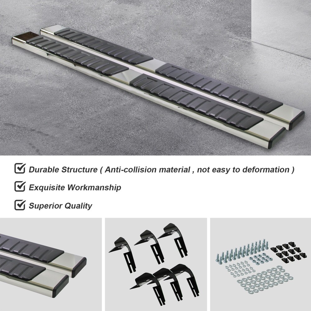Fitment: 1999-2016 Ford F-250 Super Duty 1999-2016 Ford F-350 Super Duty 1999-2016 Ford F-450 Super Duty 1999-2016 Ford F-550 Super Duty Package Include: 2x Running Boards (left&right) 1x Set Mounting Brackets and hardware 1x Installation instruction Features & Benefits : 1. High Strength Mounting Bracket: The Running Board features a high-strength mounting bracket that can hold up to 450 lbs, ensuring durability and stability during use. 2. Durable and Rust-Resistant: Constructed from durable, rust-resistant stainless steel and ABS, this Running Board is designed to withstand the test of time and harsh weather conditions. 3. Easy Installation: The Running Board boasts an easy bolt-on installation design, with most models requiring no cutting or drilling. An accurate screw hole ensures a hassle-free installation process. 4. Slip-Resistant: The Running Board is equipped with large slip-resistant step pads, providing a safe and secure stepping surface to prevent slips and falls. 5. Professional Installation Recommended: While the installation process is straightforward, professional installation is highly recommended to ensure the Running Board is correctly and securely fitted.