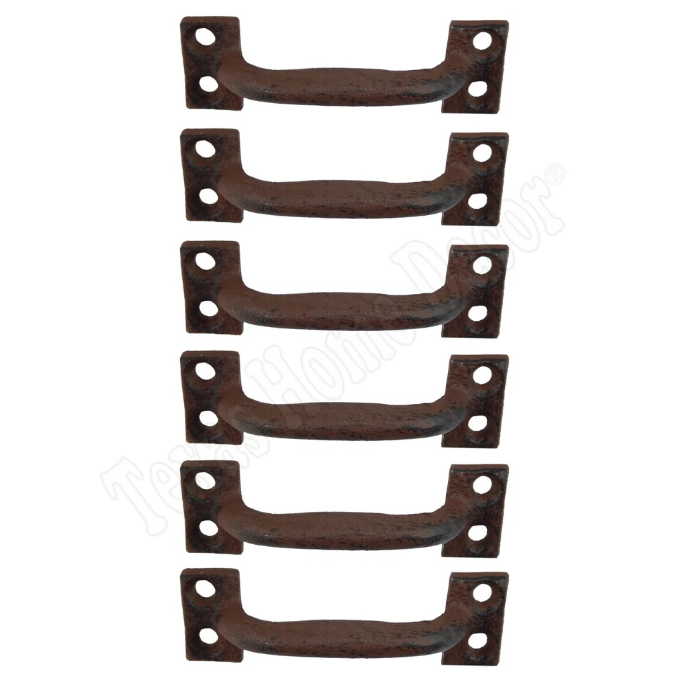 6 Small Antique Style 3 5/8" Door Handles #0016 Lot of 6 new handles Made of cast iron with a rustic brown finish Measures 3 5/8 inches in total length by 1 1/8 inch wide at the base Each handle comes with 4 mounting holes Mounting screws are 3 inches apart Has a finger space of 3/4 inches Great for rustic cabinetry or drawers Screws not included