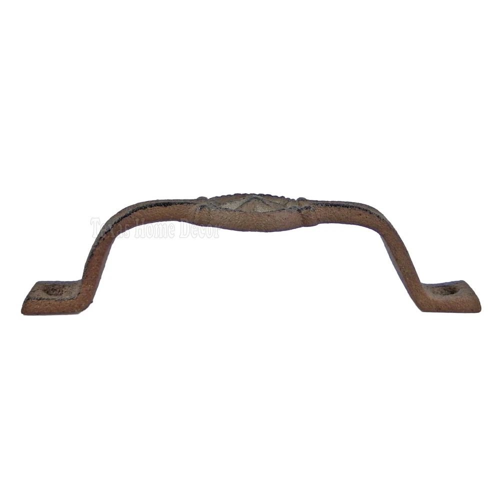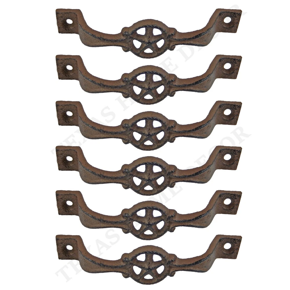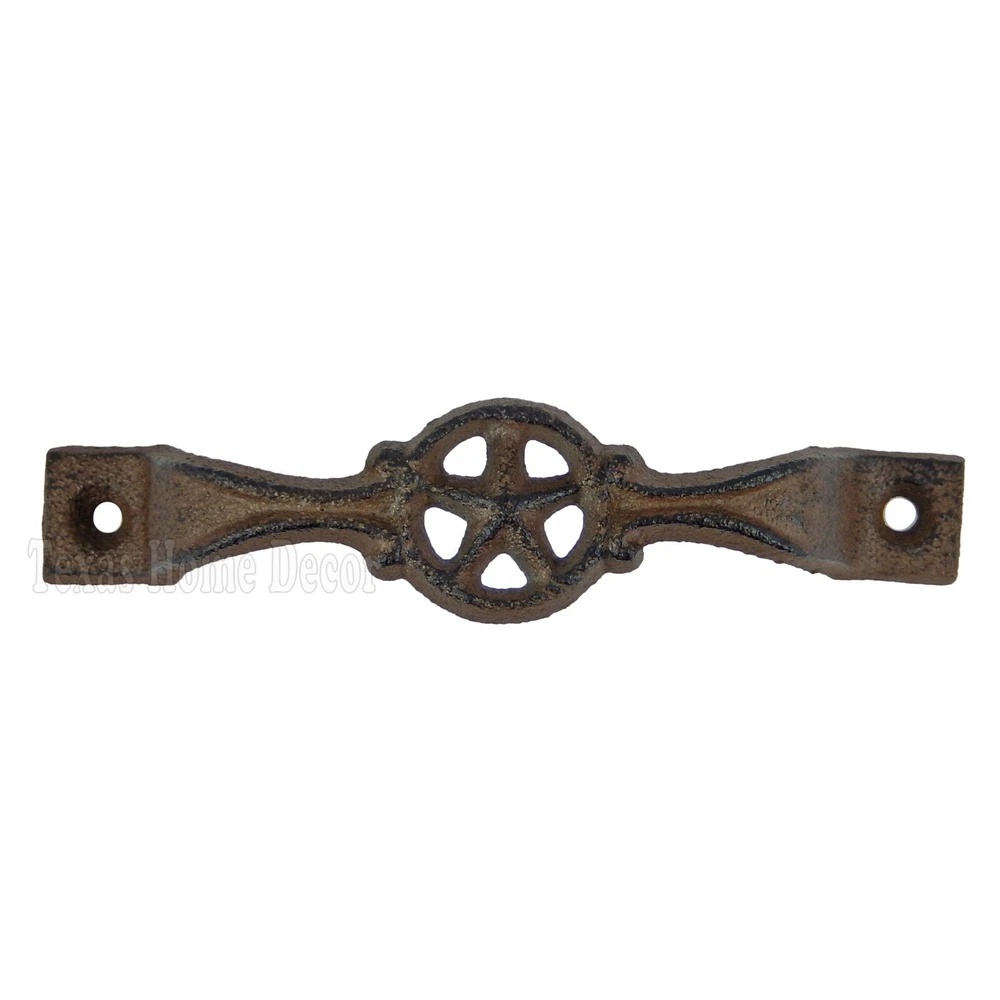 6 Star Cast Iron Handles #G071 Lot of 6 new handles Made of cast iron with a rustic brown finish Measures 6 1/4 inches in total length by 1 inch wide at the base Each handle has 2 predrilled holes Mounting holes are 5 3/8 inches apart The space between the mounting surface and the handle is 1 1/4 inches Great for rustic furniture, coolers, shed doors, drawers or cabinets Mounting screws not included