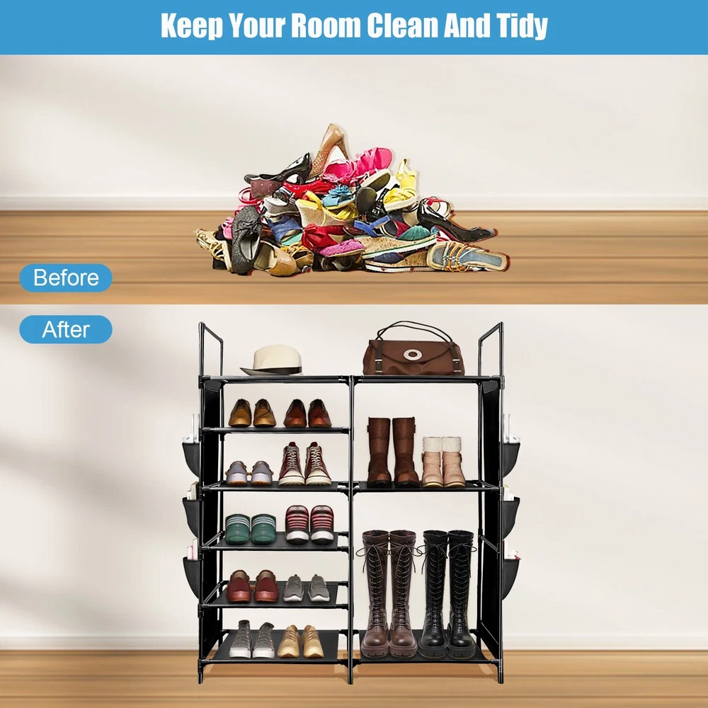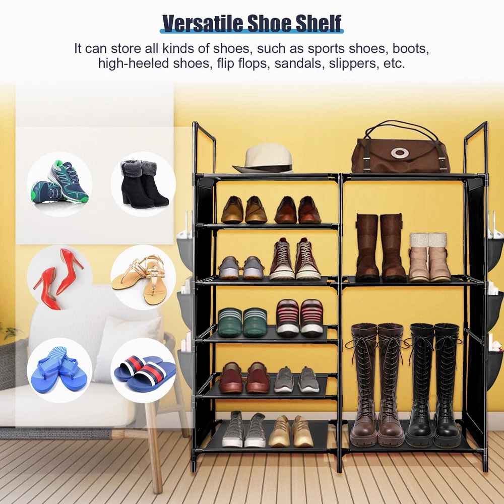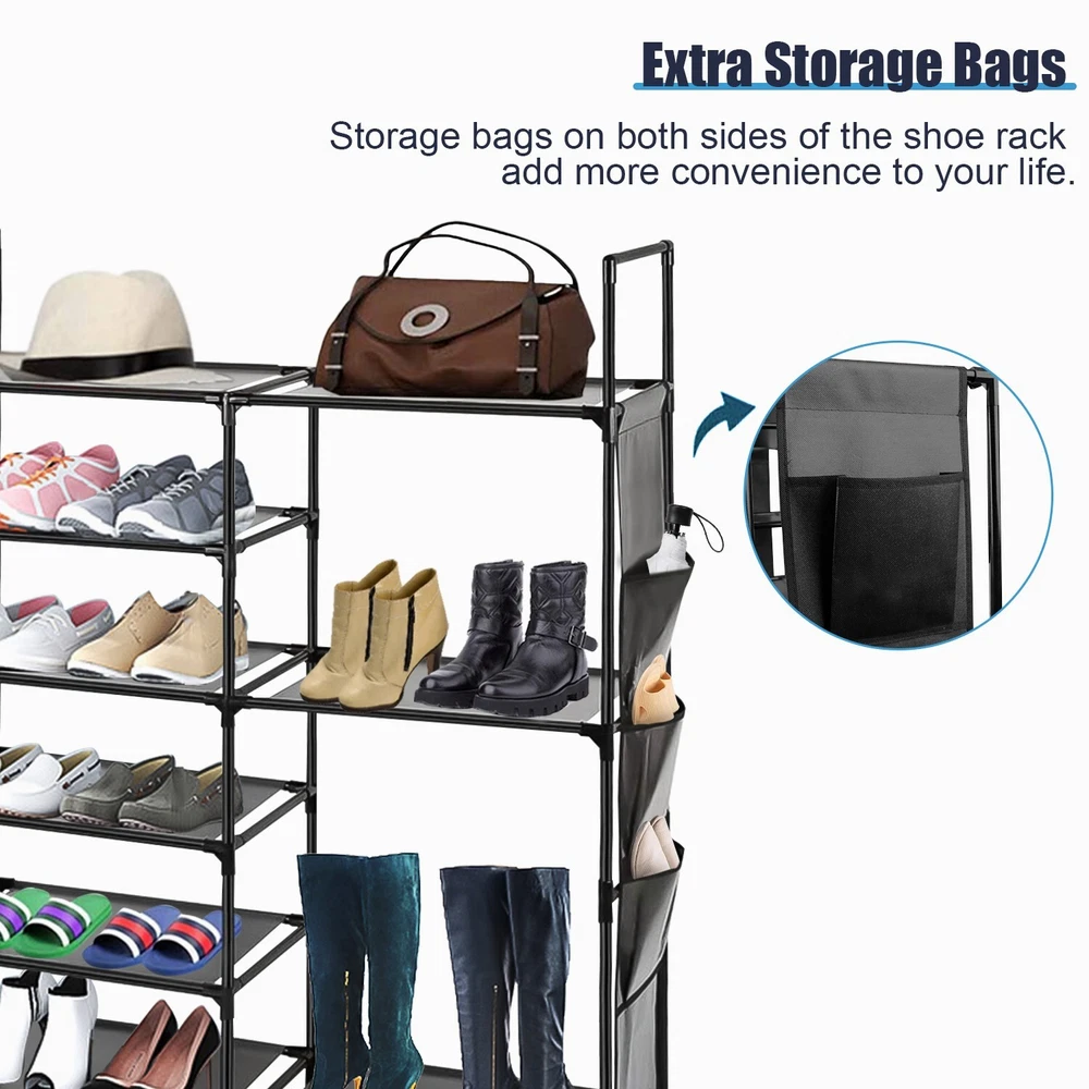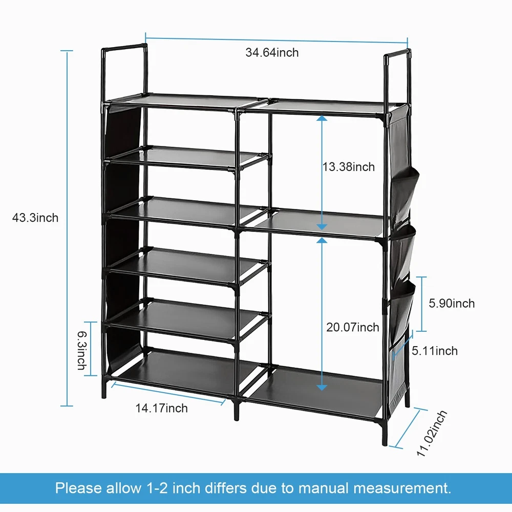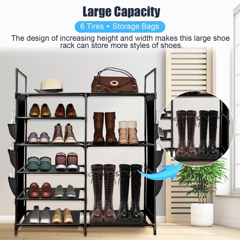 Features Durable & Sturdy Structure: Shoe rack is made of coated metal tubes and high quality PP parts, stable durable sturdy. Large Capacity: 6 Tires + Storage Bag, the design of increasing height and width makes this large shoe rack can store more styles of shoes. Extar Storage Bag: The side of the shoe rack is equipped with a storage bag to add more convenience to your life. Versatile Shoe Shelf: It can store all kinds of shoes, such as sports shoes, boots, high-heeled shoes, flip flops, sandals, slippers, etc. It is very suitable for your family and guests to tidy shoes. Specification Type: Shoe Rack Product Type: Assembled Material: Coated Metal Tubes, PP, Non-woven fabric Color: Black Size: 43.3*36.64*11.02in Package 1x Shoe Rack 、 On Jun 26, 2025 at 03:21:45 PDT, seller added the following information: