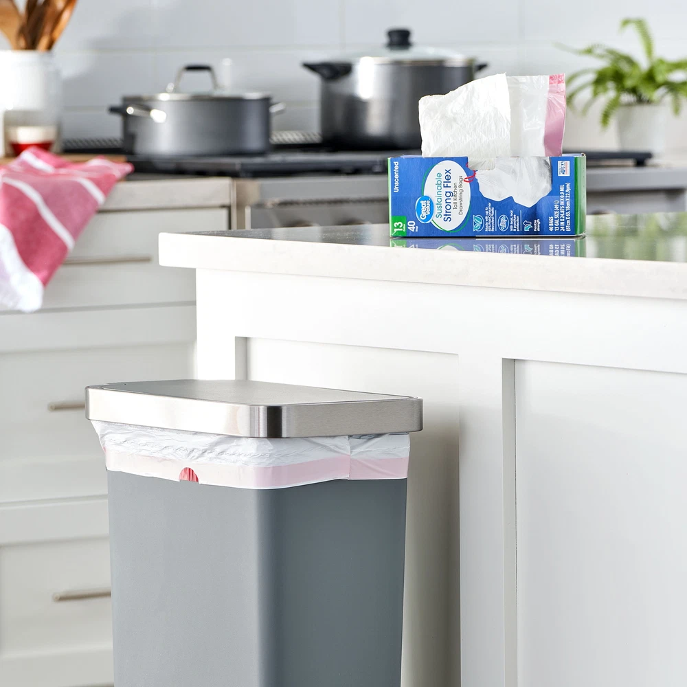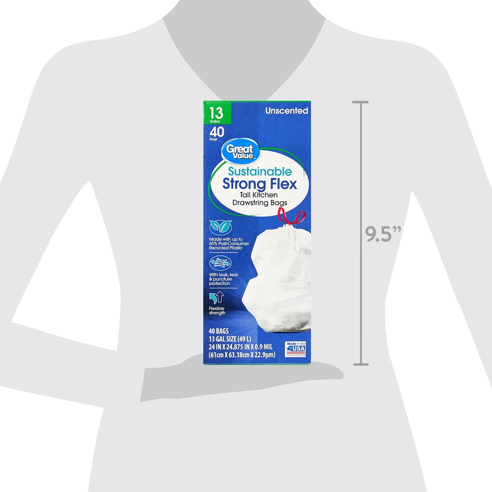 Take charge of daily household demands with Great Value Sustainable Strong Flex Tall Kitchen Drawstring Bags. These trash bags have a 13-gallon capacity and are designed to handle everyday trash loads around the house or in the workplace. They are made with 65% recycled strong, tear-resistant plastic, and the drawstring closure keeps makes the easy to lift, carry, and toss away. Each box comes with 40 bags, making for long-lasting trash control solutions. Check out other Great Value products for all of your cleaning and organizing needs. Take control of garbage with Great Value Sustainable Strong Flex Tall Kitchen Drawstring Bags. Great Value products provide families with affordable, high-quality grocery and household consumable options. With our wide range of product categories spanning grocery and household consumables, we offer you a variety of products for your family's needs. Our products are conveniently available online and in Walmart stores nationwide, allowing you to stock up and save money at the same time. On Nov 8, 2024 at 01:14:43 PST, seller added the following information: