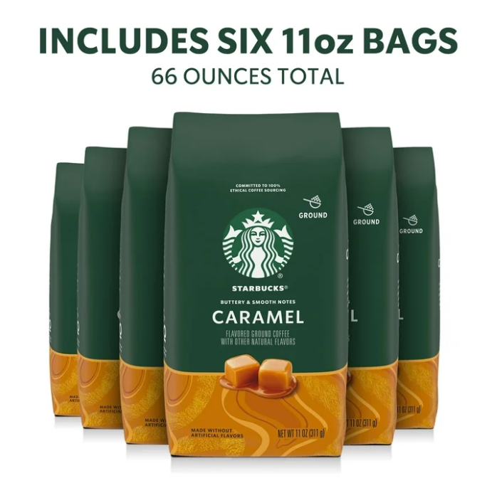 PREMIUM GROUND COFFEE: Enjoy the Starbucks coffee you love at home with six 11-ounce bags of Starbucks Caramel flavored roast ground coffee FLAVORED: Starbucks Caramel is an easy-drinking coffee, known for its light body with buttery and smooth notes—making it delicate, smooth and oh so delicious HOT OR ICED COFFEE: Enjoy your coffee your way—brew it hot or over ice for a refreshing pick-me-up. Add your favorite coffee creamer for a personalized touch, or enjoy balanced, black coffee for a satisfying sip any time of day BREW IT YOUR WAY: Enjoy the same delicious Starbucks taste, no matter how you make your cup—whether it’s a rich French press, classic drip brew or smooth pour-over CAFÉ QUALITY: Starbucks adheres to the highest quality standards—shipping you the same artfully crafted Arabica coffee beans brewed in Starbucks cafés