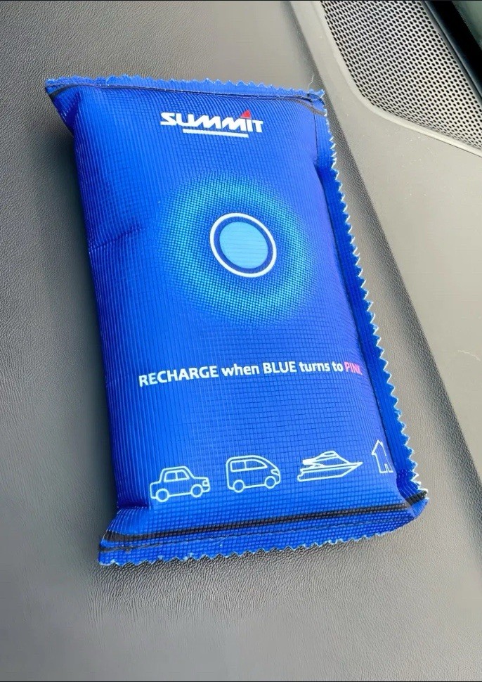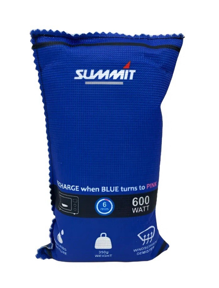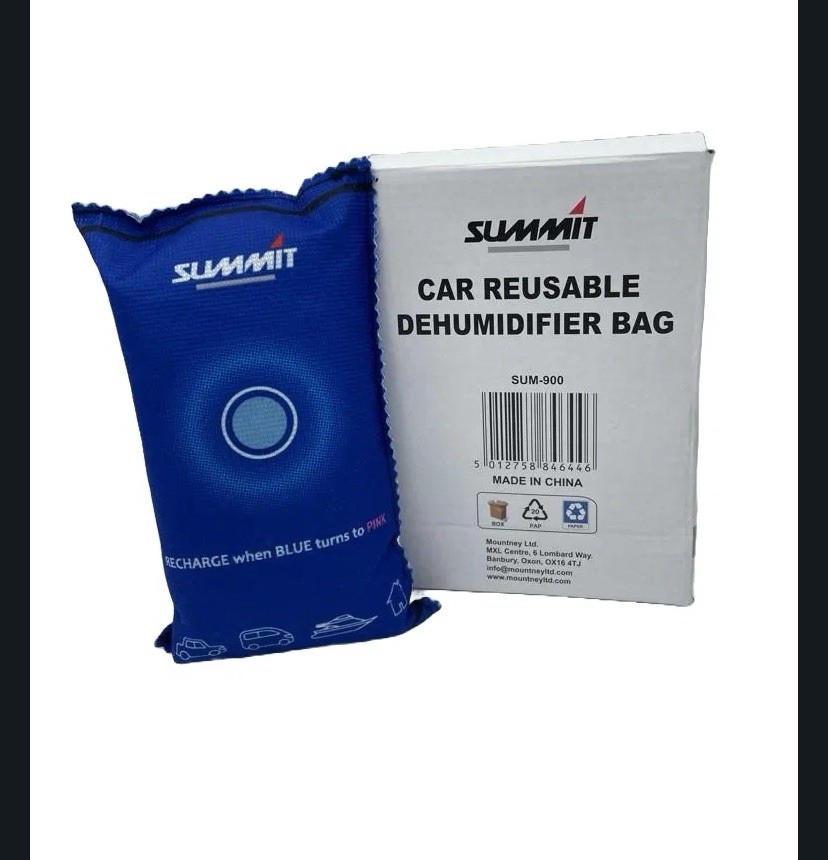 This sale is for :- 6 x summit dehumidifier bags each 350g The Summit Reusable Dehumidifier Bag keeps your windscreen clear as it absorbs excess moisture from the air and prevents the build-up of condensation. Using a dehumidifier is a cost-effective way of keeping the air dry in your car and stops mould, mildew, and musty smells. The bag is filled with approximately 350g of activated silica gel and absorbs up to 40% of its weight in moisture. It is RoHS compliant and made from high quality eco-friendly materials that act like a sponge and lock in moisture to keep your windows fog free. The dehumidifier bag does not need to be plugged in. When the bag needs charging the indicator on the front of the product will turn from blue to pink. Simply dry indoors on a radiator, in an airing cupboard or microwave following the instructions on the bag. The moisture will then dry out completely and you can store conveniently back in the car. Dehumidifiers can also be used in homes, sheds, caravans, and motorhomes all year round. Key Features: Absorbs excess moisture from the air & prevents condensation Cost effective way of keeping air dry & stops mould, musty smells & mildew Keeps windscreen clear & fog free Ideal to use all year round in cars, caravans & motorhomes Filled with 350g of activated silica gel, absorbs up to 40% of it's weight in moisture Recharge when blue indicator on the bag turns to pink Easily dried indoors on a radiator, in an airing cupboard or microwave Microwave at 600w or less for a maximum of 6 minutes RoHS compliant - made from high quality eco-friendly materials Store conveniently in car foot well, underneath a seat, in door storage etc Measures: H 200 X W 115 X D 35mm Suitable for CARS , VANS, CARAVANS, MOTORHOMES , BOATS also suitable for damp rooms in the house like BEDROOMS , KITCHENS, HALLWAYS ETC