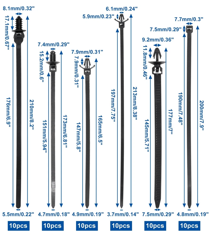 60 PCS Push Mount Zip Ties Nylon Car Mount Wire Ties Snap in Cable Zip Ties Bl Features: 【Assorted Size】You will get total 60pcs push mount cable zip tie Assortment in 6 styles. Universal size and shape can meet your different needs. These cable tie straps help to keep your car wireing and harnesses routed scurely and neatly. 【Premium Material】 Our automotive zip ties made of high qualtiy nylon plastic, which is great flame resistant, high-toughness, heat resistant, UV resistant, good insulation and not easy to aging. These black zip ties have Tie wraps working temprature is -40~285°F, is strong and durable. 【Perfect for Car】These zip tie clips fit for most of the car use, expecially for restorating your cars or replacing wiring of engine bay or electrical system. Our push mount zip ties are the great choice for anchoring wires, cables and small hoses in the engine bay, binding what you want to sort out, with its self-locking design. 【Strong Locking】 These nylon zip ties with deep locking teeth can bundle cables securely and tightly as its self-locking fastening strength design, making you securely wrap any group of cables or wires sturdily. Help you to sort out and organize the mess of wires, cables and cords! The push mount cable ties are perfect for anchoring wires, cables and small hoses in the engine bay. 【Wide Application】The cable tie mount wire ties are good for indoor and outdoor use, secure most of cables and items, such as thick or thin extension wires, ethernet cables, plant branches, fences, packages, etc. Screw zip ties will be great helper for your home, garden, office, workshop, garage, household, electronic industry,auto industry, construction industry, packaging and shipping, etc. SHIPPING We are always working hard to ensure your package arrives as soon as possible. Please understand that some factors like weather, high postal traffic, and the performance of shipping companies are outside of our control. We offer free shipping to the lower 48 states and ship within 3 business days of payment, usually sooner. We do not accept P.O. Boxes. Please provide a physical address.