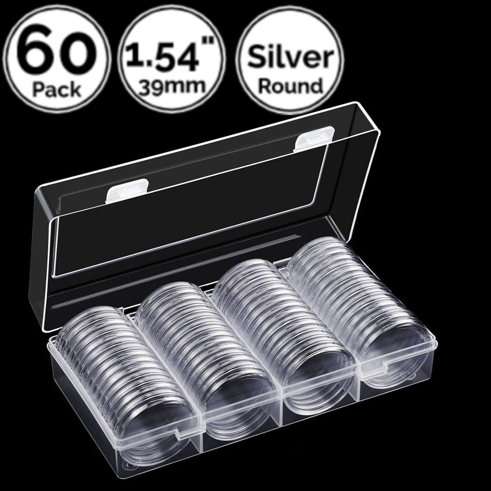 60 Pack 1.54 IN 39 mm Coin Capsule Holders w/ Storage Case Fit For Silver Round #Free Shipping in the United States #Free Return #SPECIFICATIONS Capsule Inside Diameter 1.54" (39 mm) x 0.12" (3mm) Pack of 60 Pieces Capsules with Plastic Storage Case Case Dimension 7.9" x 4.1" x 2.0" (200mm x 105mm x 52mm) Fit For Silver Round/ Crown Size Dollar and Coins that Have Similar Diameter Brand New #PRODUCT DETAILS Easy Opening and Closing with Crescent Design Tight Seal Scratch Resistant Anti Oxidation High Transparency Premium PS Material, PVC Free Always Coins Not Included Satisfaction & 30-Day Free Return Guaranteed