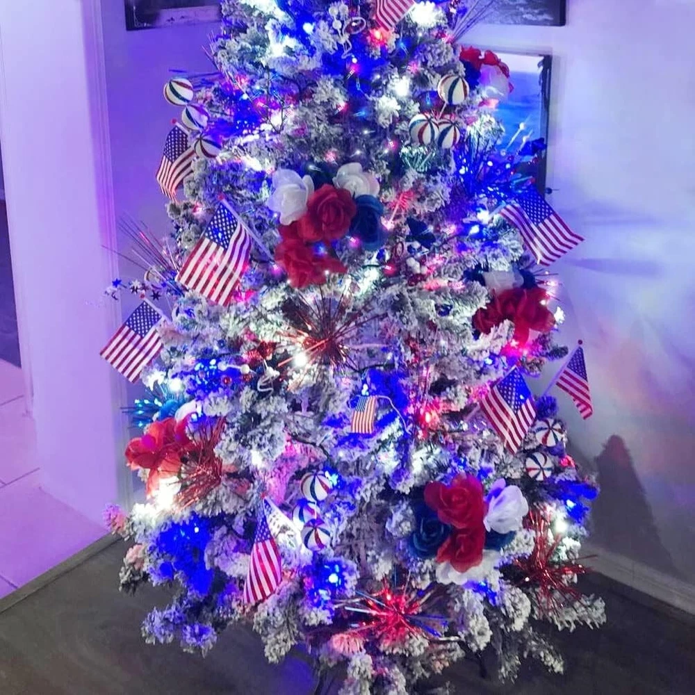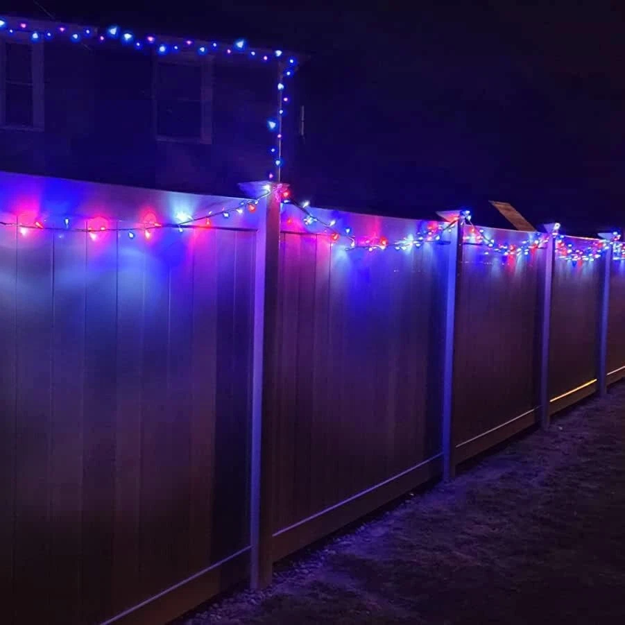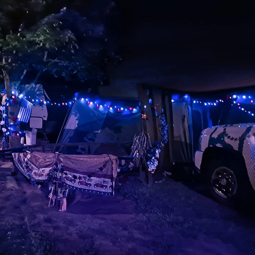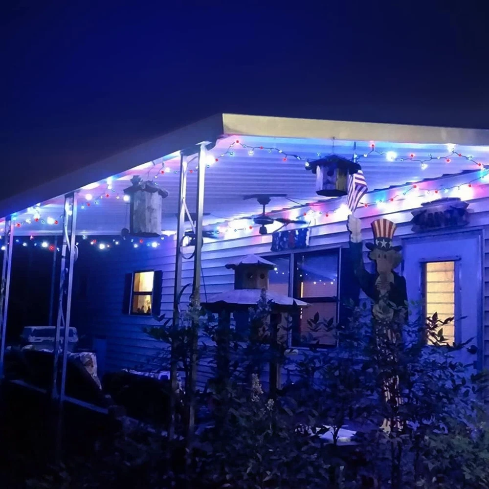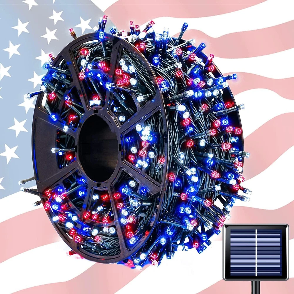 600 LED 4th of July Decorations Solar Lights, Red White and Blue Lights Outdoor Waterproof, 8 Modes Patriotic Solar String Lights for Independence Day Tree Camper Party Patio Decor SUPER LONG RED WHITE AND BLUE SOLAR LIGHTS - The solar string lights include one reel, a total of 600 LEDs with one super large battery capacity solar panel. Total Length: ft. Light Length: feet. Lead wire Length: Space between LEDs: inches. 4TH OF JULY SOLAR LIGHTS - Want to make your home more festival on the 4th of July? Then don't miss out on the red white and blue string lights. 600 premium LEDs emit all-around light, soft, and brilliant lights, wrap them in the tree, or bush, just like stars twinkling inside, and hang them on the patio to create a festival atmosphere. To add a charm to your home, make those places look very popular and catch one's eye. Happy 4th of July! 8 MODES & MEMORY FUNCTIONS - These solar string lights have 8 lighting modes(combination, in a wave, sequential, slo glo, chasing/flash, slow fade, twinkle/flash, and steady on). A built-in memory chip saves your last mode setting without having to reset the mode every day. You could press the button till the mode you like, so the lights will stay on the specified mode. WIDELY USED SOLAR PATRIOTIC LIGHTS - Our outdoor solar lights can charge during a sunny, and 8 hours of automatic work in the dark. Solar panels with ground stakes that you can place in a sunny place. The solar string light is perfect for wrapping in a tree or anywhere you want to decorate. It creates a warm, joyful and festive atmosphere for Independence Day decorative passageways, gardens, terraces, yards, lawns, fences, porches, roofs, Christmas, weddings, holidays, parties, etc. WATERPROOF AND SAFE - The outdoor solar string lights can withstand various weather (IP44), including heavy rain and snow, and are very suitable for indoor and outdoor decoration(Do not soak). No heat(The insulated copper wire keeps the lights at a low temperature so they are safe to touch after many hours of use), no radiation, low consumption, high safety.