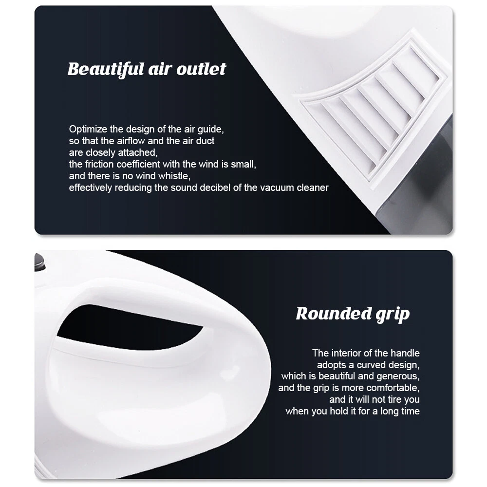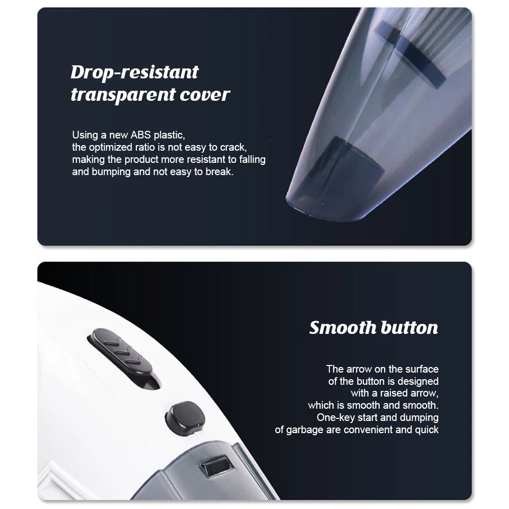 A:6000Pa Vacuum Cleaner Features: 6000Pa strong suction power, with rotating speed up to 39 000rpm. Dry wet amphibious & Strong suction. Easy to vacuum dust, debris, hair, liquid, paper... etc. D ifferent vacuum nozzles to work on any desired area. Portable, light-weight, easy to store and carry. USB charging, convenient and fast. Specifications: [product name]: hand held vehicle vacuum cleaner [product color]: black Vacuum degree: about 6 000kpa Rated power: 120W Product noise: less than 70db Rated voltage: 7.4V Product battery: built -in 1500 mAh*2 lithium battery Rating speed: 39000 (R/min) Packa ge Included: 1 x Cleaner 1 x Brush nozzle 1 x extension hose 1 brush head 1 x User Manual ============================================ B:Mini Vacuum Cleaner Describe : 1. Material: Using high-quality ABS material + electronic components, upgraded temperature control technology, no heat after long-term use, effective and fast suction of stubborn dust 2. Design: Lightweight design, change the gravity design, as light as 213g, you will not get tired when holding it for a long time, making cleaning a kind of enjoyment 3. Reuse: Nano dust-locking filter is used, which can be washed repeatedly, breathable and dust-proof, and more environmentally friendly after repeated use 4. Bass operation: Acoustic noise reduction design, sound <68 decibels, comfortable operation without disturbing, cleaning without worrying about affecting family rest 5. Charging method: smart USB charging interface, compatible with a variety of charging methods, notebooks, charging treasures, computers, etc., charging and using 6. Long-lasting battery life: built-in large-capacity lithium battery, 2000 mAh battery, can be used continuously for more than 30 minutes, easy to deal with daily cleaning 7. Applicable to: gaps in the car, sofa carpets, desks, computer keyboards, bookshelves, hair on the bed, drawers, pianos, etc. can be used in various scenes that cannot be cleaned Specific ation : Name: Wireless Vacuum Cleaner USB Rechargeable Handheld Mini Car Vacuum Cleaner Colour: Black Rated voltage: 7.4V Rated power: 120W Rated speed: 2000 (r/min) Vacuum suction: about 6000 Pa Dust cup capacity: 0.1L Charging method: Type-C charging Battery: built-in rechargeable lithium battery Battery capacity: 2000mAh Charging time: 3.5h Battery life: about 15minutes Product size: 18.5*5.5cm Product net weight: 213g Packa ge list: 1*vacuum cleaner 1*suction nozzle 1*hair brush 1*blowing hole 1×filter 1*charging cable 1*manual Instr uctions for use: 1. Check whether the charging is sufficient, and the filter must be installed when using it 2. Just turn on the switch, the front cover cannot be removed when the motor is rotating 3. Replace different suction nozzles according to different usage occasions 4. If the vacuum cleaner is dirty or the suction is not strong, please clean the filter in time to ensure the normal operation of the vacuum cleaner 5. Do not expose to direct sunlight, and do not use in places with high temperature and high pressure