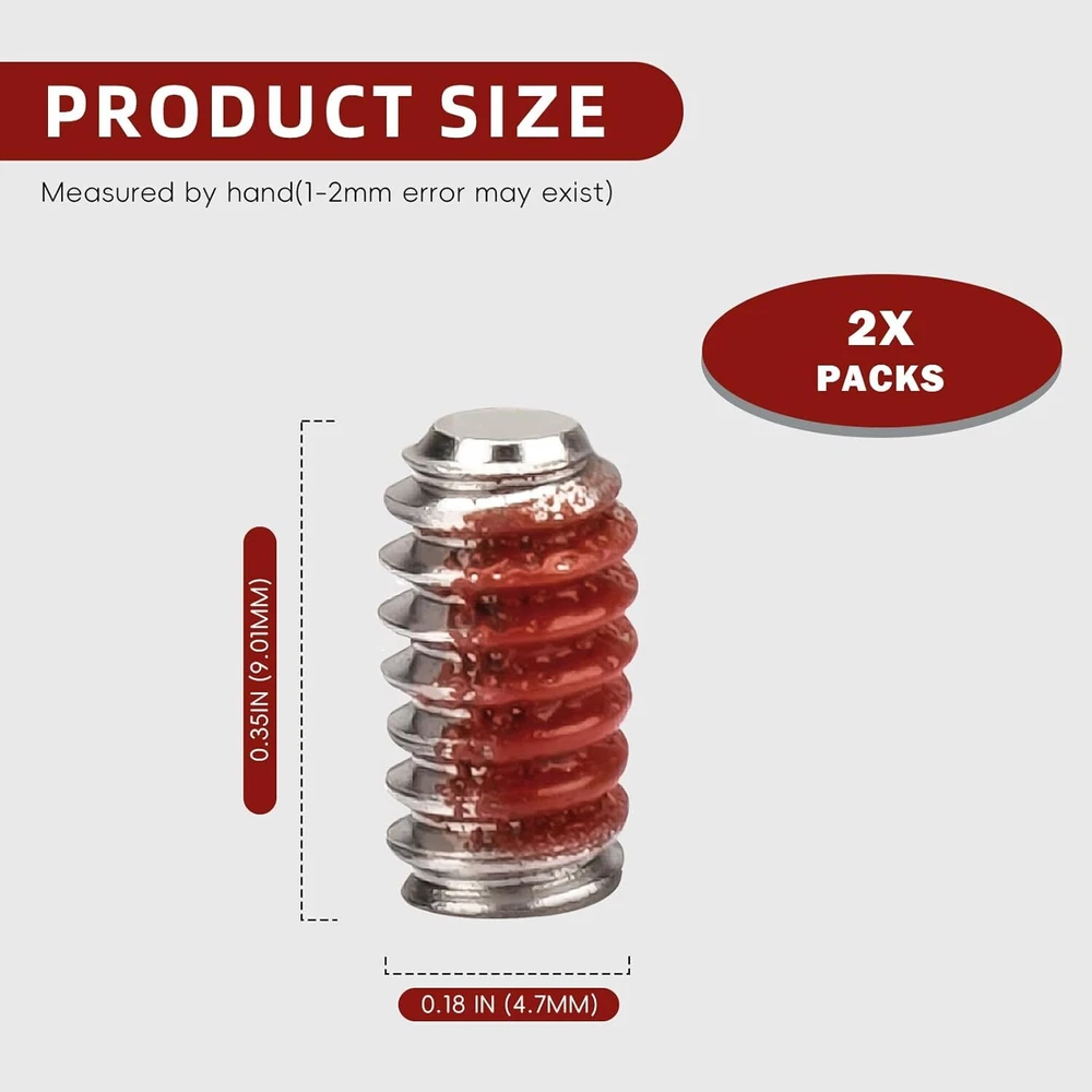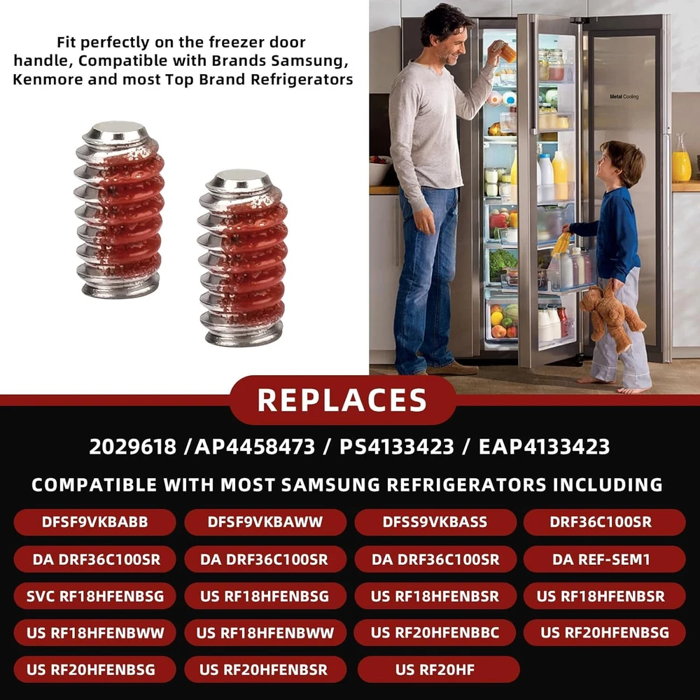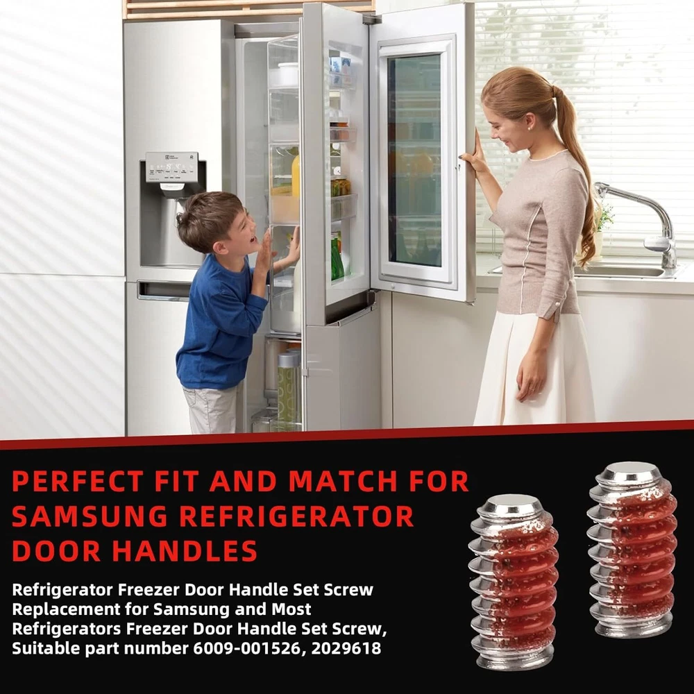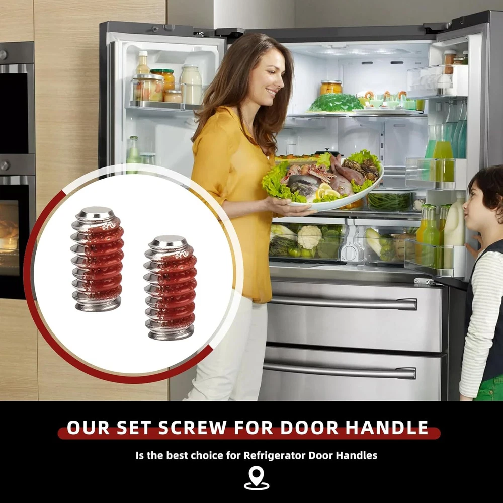 6009-00Refrigerator Freezer Door Handle Set Screw Red Product Details Material: Stainless Steel Brand: Adabuing Color: Red Product Dimensions: 2.36"L x 1.57"W Exterior Finish: Stainless Steel Handle TypeFinish Type: Pull HandlePolished Metal TypeHandle Material: Stainless SteelStainless Steel Set Screw for Door Handle Easy to Install : Easily installed a with a #10 hex key, Screw fits, easy to install, holds well, No issues with stripped thread or not tightening, Secured the handle without any jiggle or wiggle, It is important to disconnect your appliance from the power supply before servicing. Compatible : Fit perfectly on the freezer door handle, Compatible with Brands Samsung, Kenmore and most Top Brand Refrigerators, Replaces 2029618, AP4458473, PS4133423, EAP4133423, Compatible With Most Samsung Refrigerators including DFSF9VKBABB DFSF9VKBAWW DFSS9VKBASS DRF36C100SR/DA DRF36C100SR/DA DRF36C100SR/DA DRF36C100SR/DA REF-SEM1/SVC RF18HFENBSG/US RF18HFENBSG/US RF18HFENBSR/US RF18HFENBSR/US RF18HFENBWW/US RF18HFENBWW/US RF20HFENBBC/US RF20HFENBBC/US RF20HFENBSG/US RF20HFENBSG/US RF20HFENBSR/US RF20HF, Please Check Description for Model Compatibility. High Quality : Our Set Screw for Door Handle Made of high-quality materials and precision processing technology to ensure its high strength and wear resistance, and durability, Is the best choice for Refrigerator Door Handles . Good Service : Please rest assured to buy, If you have any questions about our Samsung Refrigerator Set Screw for Door Handles any questions can feel free to contact us, we will reply within 24 hours, to provide you with good after-sales service.