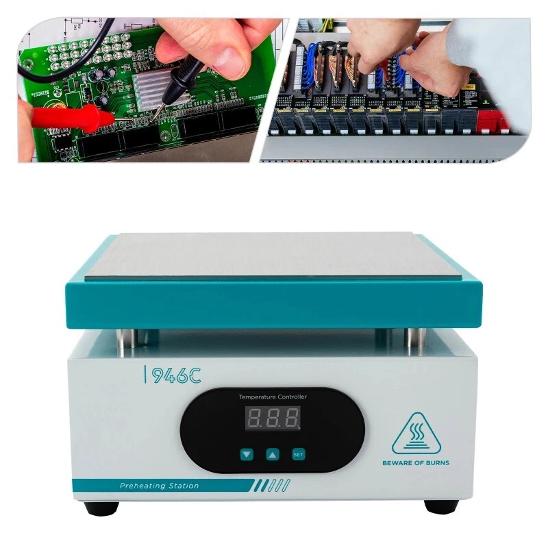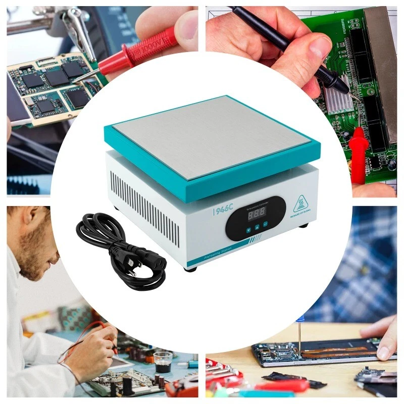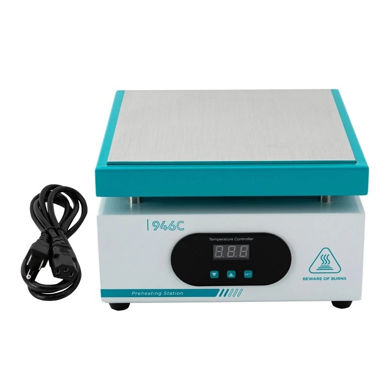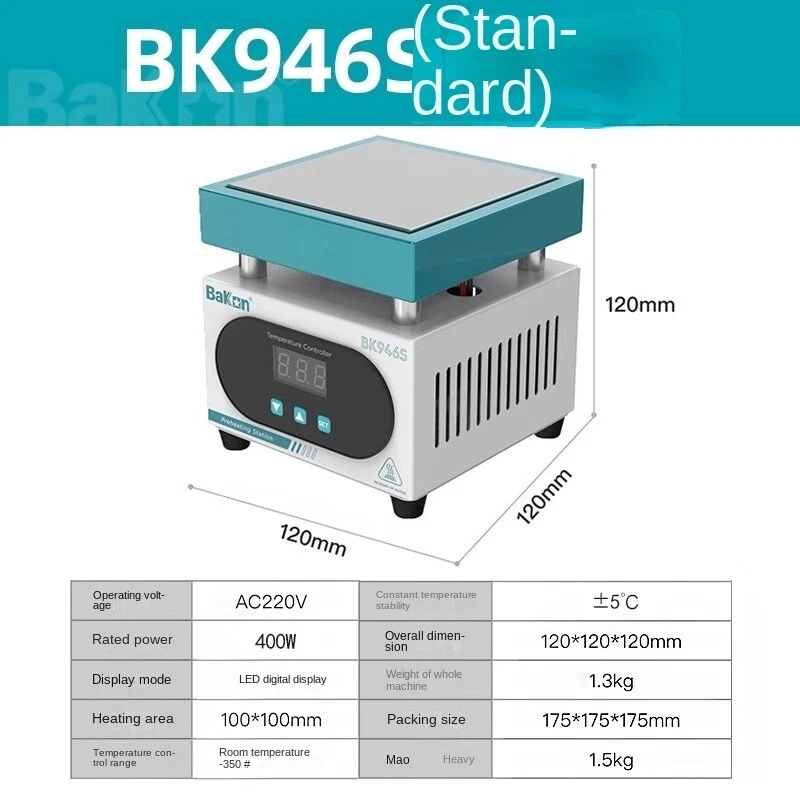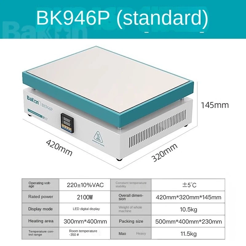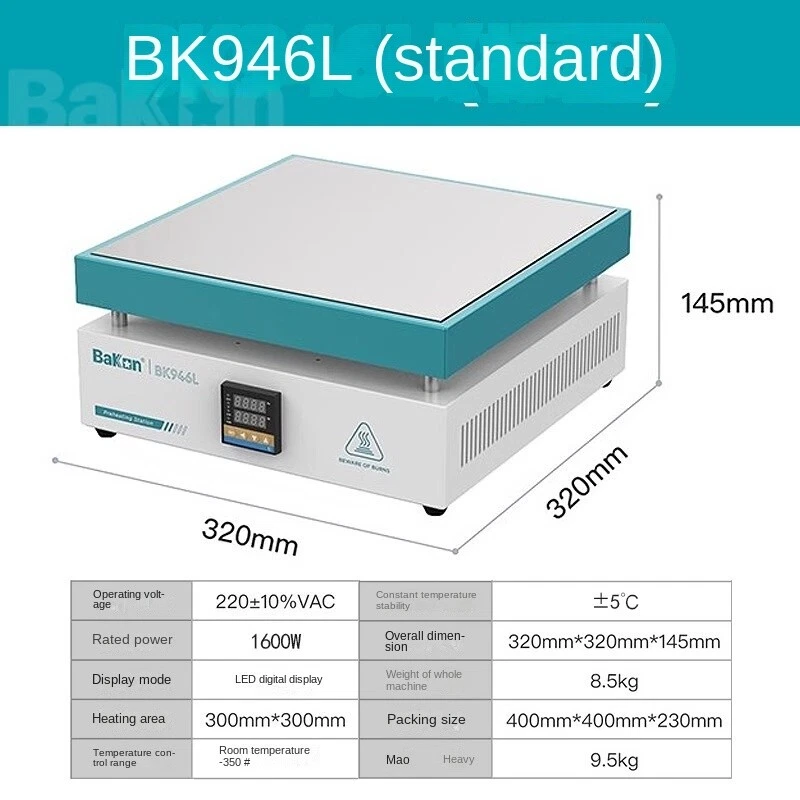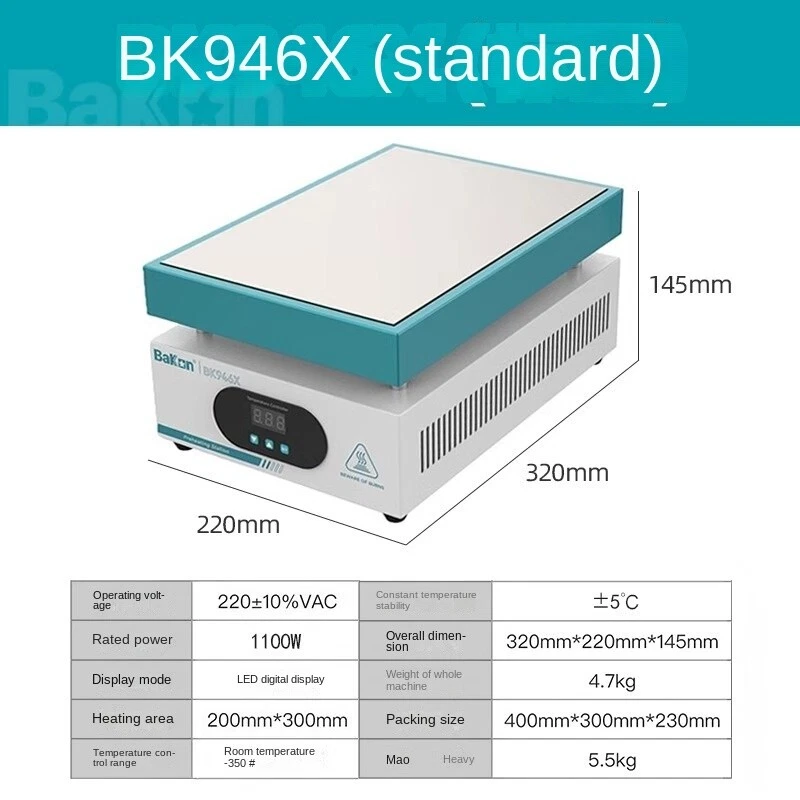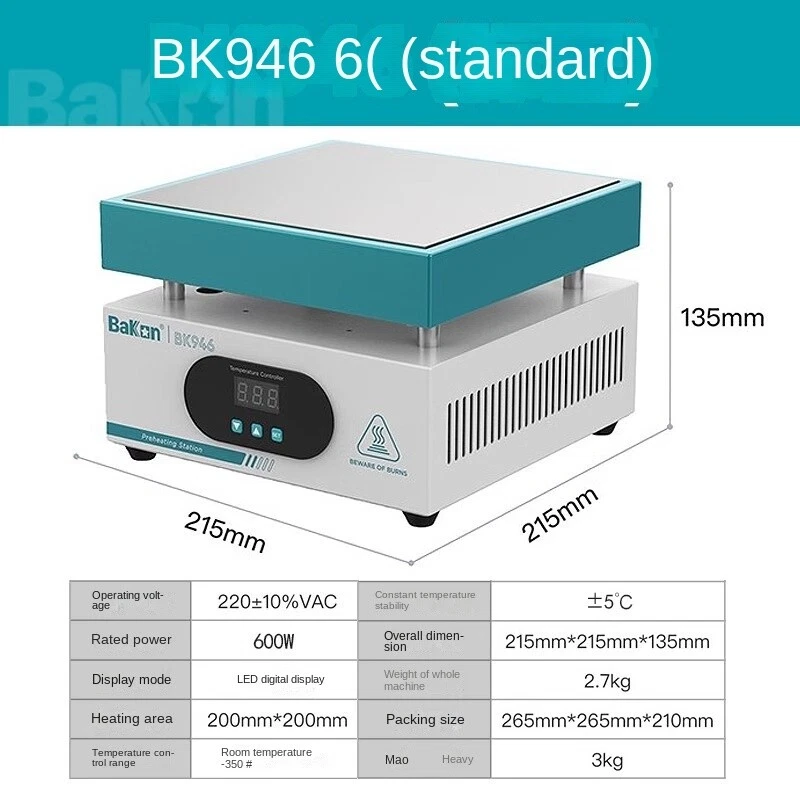 White thermostatic heating station adjustable temperature digital display cell phone dismantling screen preheating station LED heating desoldering station repair tools Operating voltage 220±10%VAC Constant temperature stability ±5℃ Rated power 600W Dimension 215mm*215mm*135mm Display mode LED digital display Weight 2.7kg Heating area 200mm*200mm Packing size 265mm*265mm*210mm Temperature control range room temperature-350C Gross weight 3kg