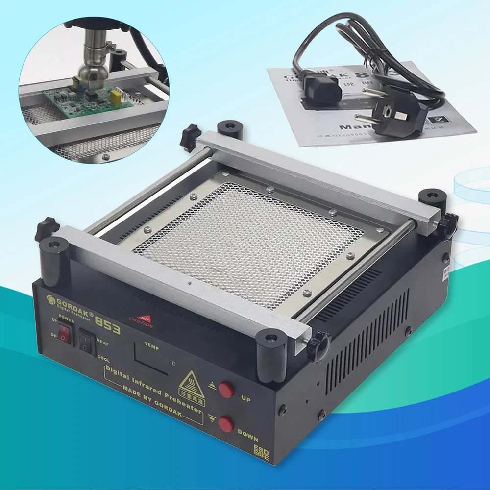 Gordak 853 Bottom Heating Preheating Station PCB Preheater Soldering Station BGA Rework Station Phone Repair Tools Feature: 1. ESD safe by design, wide temperature area design de-soldering system, high precision intelligent control circuit, LED display, easy operate. 2. Use big power 120mm*120mm far infrared heater, rapid heating. 3. Original heat insulation by design, increase the temperature erea greatly. 4. Could remove could soldering, fit for deal with big area BGA and computer mainborad extend groove's knock down and fix. Technical Specifications Technical Parameter: Brand: Gordak Model: 853 Rated voltage: AC230V Maximum power: 605W Heating method: Infrared heating plate Temperature range: 100 -500 Celsius Heating size: 120x120mm Dimensions: 221x251x112mm Weight : 3.5KG