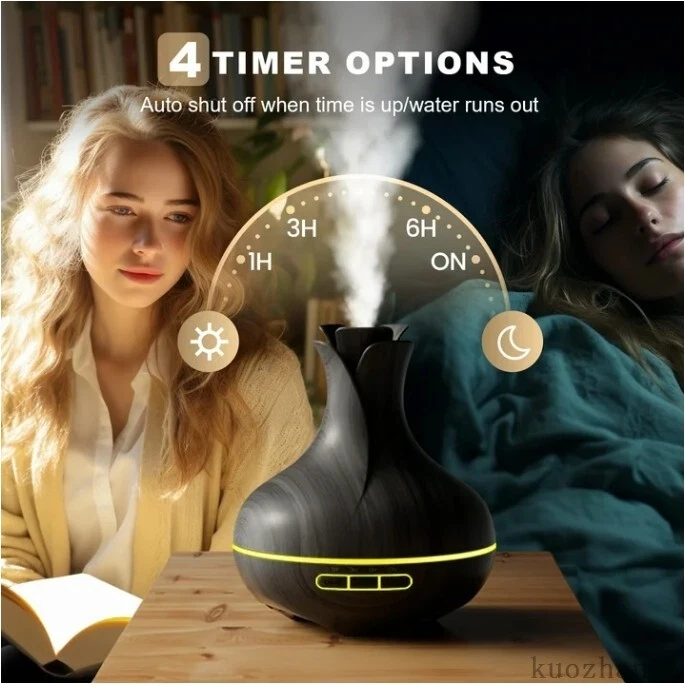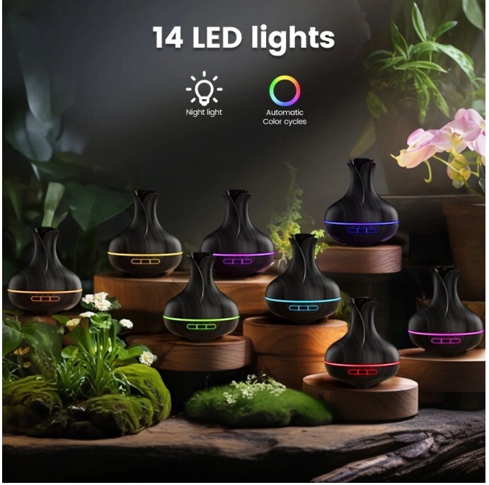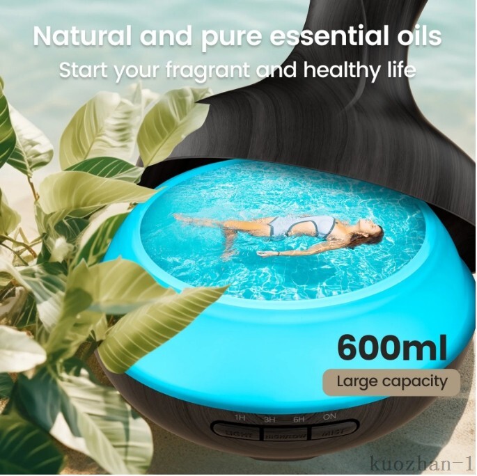 🌹Aromatherapy Transform your home or office into a soothing oasis with the Noahstrong Essential Oil Diffuser. This powerful aromatherapy diffuser combines the charm of a wood grain finish with advanced ultrasonic technology, creating the perfect ambiance for relaxation and wellness. Designed to aid in aromatherapy, it efficiently disperses your favorite essential oils to promote a sense of calm and relief from anxiety and stress. 🌿8 Essential Plant Oils 8x10ml 100% natural pure organic oils including Lemon, Lavender, Mint, Rose, Orange, Tea tree, Vanilla, and Jasmine, which are extracted from native plants from multiple countries. With premium quality, each drop is 100% pure with no additives, fillers, bases or carriers added. ♨️2 Misting Modes Our humidifier with essential oil diffusers has 2 mist modes. Strong mist mode can last up to 6 hours, while weak mist mode can last up to 10 hours, it's suitable for extended use in any setting. The quiet operation at just 30dB ensures your tranquility remains undisturbed. 🌈14 Modes 7 Color Mood Light The Essence diffuser includes 7 ambient light modes with 2 intensity settings for 14 different light combinations. Enhance your aromatherapy experience with the tranquil glow, doubling as a gentle nightlight. Dimensions: 6.7x6.7x7.7 inches. This space-saving design complements any decor making it not only a utility but also a stylish addition to your surroundings. ⏳4 Timer & Waterless Auto Shut-off The aroma oil diffusers come with 4 built-in timer setting modes: 1 / 3 / 6 Hours/ ON which can be set via the "MIST" button on the aroma oil diffusers or with the remote control. It is easy and convenient to use. Also, this fragrance oil diffuser will automatically shut off when water runs out. 🧘♀️Applicable Occasions The aromatherapy oil diffusers feature a large and easy-to-clean 600ml water tank which is ideal for large rooms, bedrooms, living rooms, offices, bathrooms, or cars, it effectively covers spaces ranging from 269 to 368 square feet. This fragrance aroma diffuser doubles as a humidifier, it adds essential moisture to the air, improving sleep and elevating your environment's comfort. 💝Perfect Gift The oil diffuser is made of BPA-free plastic with a beautiful vase design. As aromatherapy gifts for women or men. Whether it's Mother's Day, Father's Day, Valentine's Day, Christmas, Thanksgiving, or Birthday, this diffuser is an ideal present to show care and thoughtfulness. Gift a moment of peace. Specifications: Capacity: 600ml Material: ABS+PP Mist Output: 45-60ml/hr Timer: ON/1 H/ 3 H/6 H Applicable Area: 269-368 square feet Noise Level: ≤30dB Mist Modes: High / Low Lights: 7 Color GRB lights Packing list: 1*600ml diffuser 8*10ml essential oil 1*remote control 1*adapter 1*User manual Instructions: Move the top cover. Find the adapter in the tank. Add water and essential oil to the aroma diffuser (0.1ml-0.15ml of essential oil per 100ml of water). Electrify the LED light diffuser and turn it on. Adjust the light, mist, and time to your personalized needs. Note: Do not add water beyond the water level line to produce the best fogging effect. When the water is exhausted in the water tank, the Oil Diffusers will automatically enter the shutdown state that giving you peace of mind.