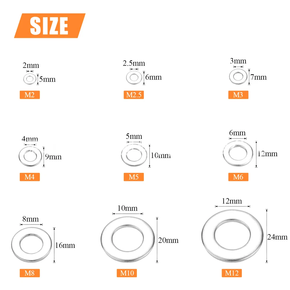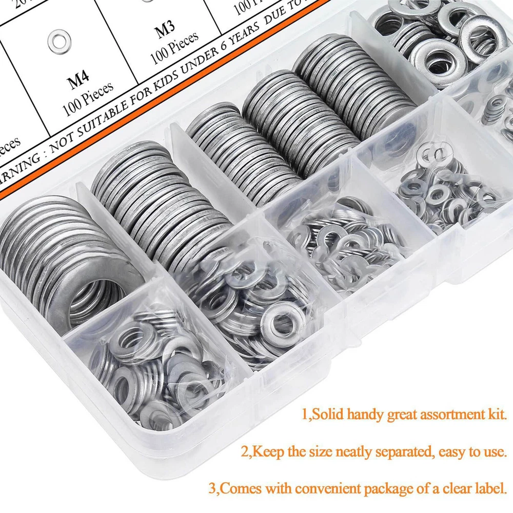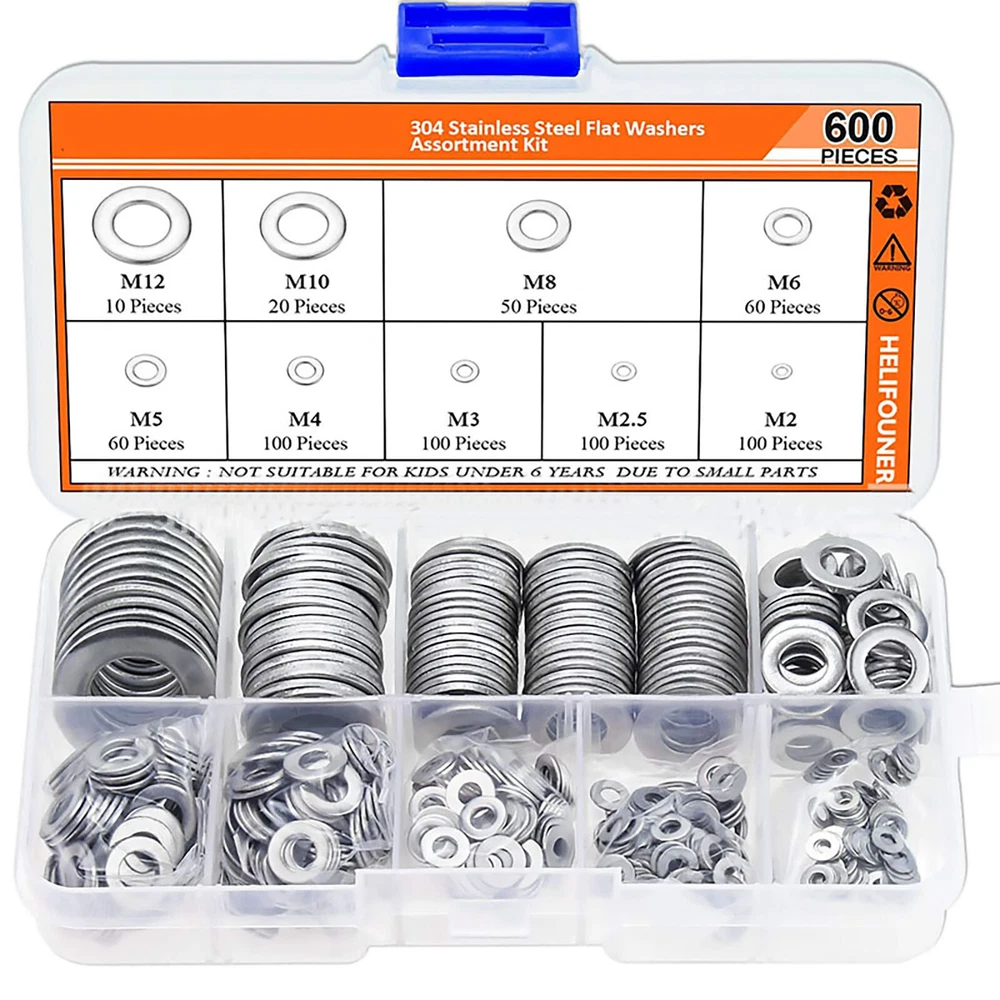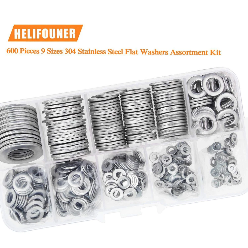 Product Description 600pcs 304 Stainless Steel Flat Washer Washers Assortment Set M2-M12 Features: Stainless steel panels are carefully processed. The material is robust and durable. stainless steel is resistant to moisture and seawater, mild acids and much more and can therefore be used in many different areas. Perfect for electrical connections to home and commercial equipment, automotive and marine applications, metal or power plants. Here you can choose between different diameters and thickness for different requirements. Specifications: Color: Silver Type: Flat Washer Material: 304 stainless steel Size: M2 M2.5 M3 M4 M5 M6 M8 M10 M12 Package includes: 100pcs M2x5x0.3mm 100pcs M2.5x6x0.5mm 100pcs M3x7x0.5mm 100pcs M4x9x0.8mm 60pcs M5x10x1.0mm 60pcs M6x12x1.5mm 50pcs M8x16x1.5mm 20pcs M10x20x1.5mm 10pcs M12x24x2.0mm Notes: 1. Please allow 0-1 inch error due to manual measurement. Thanks for your understanding. 2. Monitors are not calibrated same, item color displayed in photos may be showing slightly different from real object. If you have any questions, please feel free to contact us via ebay. We usually respond within 24 hours. Payment Shipping Returns Contact Us We accept all verified payments from ebay. Orders will be shipped after receiving cleared payment. Payment due within 7 days after auction ends and for buy it now listings. We ship most of our orders within 24 hours, and may up to 48 hours for. If you want faster shipping way. Please contact us before making payment. Sometimes due to problems with our transportation company system, your shipping information may be delayed to update. We recommend that you try again after 3-4 days. If you still haven't checked the shipping information, you can contact us by ebay message. Always believe we can figure things out with communication, if it comes to return, the pacakge must be intact and the same as you receive. If you have any questions, please feel free to email our service specialists 24 Hours a Day, 7 Days a Week. We will reply you ASAP. Return/refund is accepted within 30 days after the buyer receives the item. NO exchange will be accepted after 30 days from the date when the item is received. Please contact us first before returning your product!!! If you have any questions, our Customer Service staffs welcome you to email us. We strive to answer all questions and resolve any problems as quickly as possible. You can contact us 7*24, we will reply at the first time, and we will surely solve your problems. Note: 1.We try our best to reply to your emails as soon as possible, however, due to high volume of daily incoming emails and time zone difference, we may not be able to reply your emails immediately. Please allow 1 business days for us to response. If you do not receive any reply from us, please check your email ensuring your mailbox has not reached full size. 2.Due to some ISP SPAM filter settings, you may not be able to receive our replies; if you have problems receiving our emails, you may need to use a different email account to contact us. 3.Please give us the opportunity to resolve any problem. We understand the concerns and frustrations you might have, and will try our best to resolve the issues. Please email us before leaving any negative feedback or open any dispute on PayPal. 4.We care about our valued customers, and will always try to help you. So if you have any problems, please e-mail us immediately. Payment We accept all verified payments from ebay. Orders will be shipped after receiving cleared payment. Payment due within 7 days after auction ends and for buy it now listings. Shipping We ship most of our orders within 24 hours, and may up to 48 hours for. If you want faster shipping way. Please contact us before making payment. Sometimes due to problems with our transportation company system, your shipping information may be delayed to update. We recommend that you try again after 3-4 days. If you still haven't checked the shipping information, you can contact us by ebay message. Returns Always believe we can figure things out with communication, if it comes to return, the pacakge must be intact and the same as you receive. If you have any questions, please feel free to email our service specialists 24 Hours a Day, 7 Days a Week. We will reply you ASAP. Return/refund is accepted within 30 days after the buyer receives the item. NO exchange will be accepted after 30 days from the date when the item is received. Please contact us first before returning your product!!! Contact Us If you have any questions, our Customer Service staffs welcome you to email us. We strive to answer all questions and resolve any problems as quickly as possible. You can contact us 7*24, we will reply at the first time, and we will surely solve your problems. Note: 1.We try our best to reply to your emails as soon as possible, however, due to high volume of daily incoming emails and time zone difference, we may not be able to reply your emails immediately. Please allow 1 business days for us to response. If you do not receive any reply from us, please check your email ensuring your mailbox has not reached full size. 2.Due to some ISP SPAM filter settings, you may not be able to receive our replies; if you have problems receiving our emails, you may need to use a different email account to contact us. 3.Please give us the opportunity to resolve any problem. We understand the concerns and frustrations you might have, and will try our best to resolve the issues. Please email us before leaving any negative feedback or open any dispute on PayPal. 4.We care about our valued customers, and will always try to help you. So if you have any problems, please e-mail us immediately. powered by