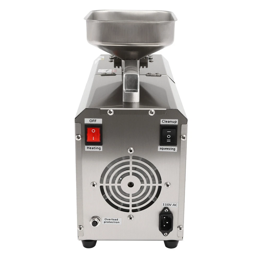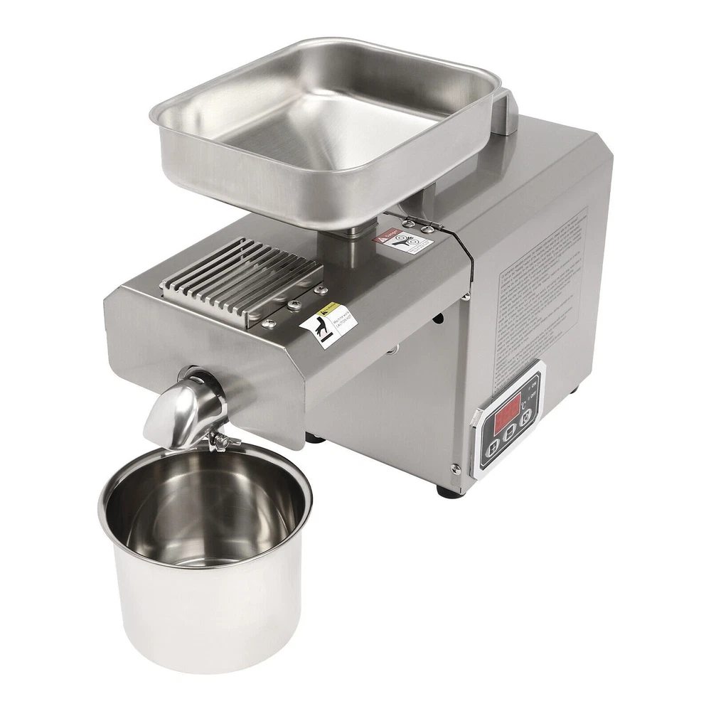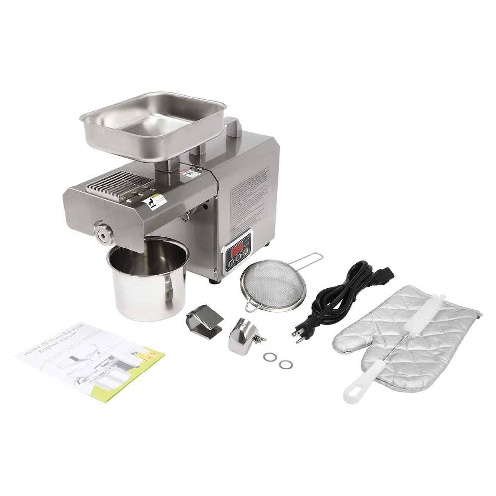 Nowadays, More and More Swill-cooked Dirty Oil Exists in the Market, Which Seriously Affects Our Health. If You Want to Consume High-quality and Healthy Oil, Then Come and Take a Look at Our Oil Press Machine. It Allows You to Extract Your Own Oil at Home, Which Is Not Only Healthier but Also More Economical than the Ones in the Market. Let the Pregnant Women, the Elderly, or the Children in Your Family Live a Healthier and More Reassuring Life! 603 Intelligent Stainless Steel Oil Press Cereals Hot Cold Oil Extractor Machine ❤Welcome❤ Description Nowadays, More and More Swill-cooked Dirty Oil Exists in the Market, Which Seriously Affects Our Health. If You Want to Consume High-quality and Healthy Oil, Then Come and Take a Look at Our Oil Press Machine. It Allows You to Extract Your Own Oil at Home, Which Is Not Only Healthier but Also More Economical than the Ones in the Market. Let the Pregnant Women, the Elderly, or the Children in Your Family Live a Healthier and More Reassuring Life! Key Features Build to Last: Made of Stainless Steel and Adapts a Polish and Heat Treatment, Which Resists Corrosion , Wear, Rust, and Deformation Well, so It Can Withstand the Test of Time. High Efficiency: the 250w Pure Copper Motor, 600w Total Power, 12-Stage Physical Propulsion Type Fine Pressing, and Thickened Squeezing Chamber Make Its Heat Conduction Faster with Stable Pressure and Clear Oil Rate, to Maintain the Food's Rich Nutrition to the Greatest Extent, and It Can Work Continuously for 5-6 Hours, Greatly Improving Your Work Efficiency with Low Power Consumption. Convenient and Nutritious: the Convenient Touch Buttons and Clear Display Are Helpful for You to Control the Oil Yield Accurately and Make You Handy for Every Operation. It Can Directly Squeeze Raw Materials Without Frying and Pressing, and with an Intelligent Constant Temperature Heating Function, It Can Make the Nutrition Not Easily Lost During the Pressing Process. Multi-functional Use: It Is Adjustable from 32-572°F and Supports Both Hot and Cold Presses. for Hot Pressing, Heating at High Temperature First and Then Pressing, It Can Produce a Rich Aroma with a High Oil Yield. for Cold Pressing, Direct Pressing at Low Temperatures, It Can Produce Oil with a Low Loss of Nutrients. High-safety: the Machine Comes with Air-cooling System, Overheat Protection and Overload Protection That Can Timely Reduce the Temperature of the Product During Operation, Prolonging Its Service Life and Ensuring Safety in Use. Details Smooth Handle: the Top Handle Is Insulated Against Heat and Makes It Easy for You to Move the Machine. Foot Pads: the Four Foot Pads Can Help You Put the Product Firmly on the Table and Will Not Easily Slip off. Long Power Cord: It Comes with a Long Electrical Cord(4.92-5.94ft) for Added Convenience and Extraordinary Mobility. Protective Glove: a Protective Glove Is Included in the Package to Keep Your Hands Free from Oil Stains and Enhance Safety During Use . Application It Can Be Used in Restaurants, Food Markets and Homes,Etc. and It Can Press Varieties of Materials Can Be Pressed , Including but Not Limited to Peanuts, Sunflower Seed, Walnut, Soybean, Shelled Hemp Seed, Flax Seed, Camellia Seed, Rapeseed, Black Sesame, White Sesame, Almond, Pepper Seeds, Pumpkin Seeds, Pine Nuts, Licorice, Etc. How to Use 1. Keep the Heating Switch on and Preheat for 10 Mins. 2. Make Sure the Fresh Raw Material Is Dry Enough for a Higher Oil Yield! 3. Turn on the Press Switch and Add a Small Amount of Raw Material to the Hopper First. 4. After Observing the Normal Flow of Oil and Residue, Add a Large Amount of Material to the Hopper. Specification M aterial: Stainless Steel Process: Polish, Heat Treatment Model: 603 Color: Silver Motor: Pure Copper Motor Assembly Required: Yes Mount Type: Countertop Product Care Instructions: Hand Wash Only Control Mode: Intelligent Control Type: Oil Extractor Plug: Us Standard Work Time: 5-6h Power: 600w Voltage: 110v Frequency: 60hz Adjustable Temperature Range: 0-300°C/32-572°F Preheating Time: 10 Minutes or More Power Cord Length: About 1.5-1.8m/4.92-5.91ft Package Size: 53*35*27cm/20.87*13.87*10.63in Overall Size: 46*16*32cm/18.11*6.3*12.6in Gross Weight: 13kg/28.66lb Net Weight: 10.8kg/23.81lb Package Includes 1*Oil Press Machine 1*Power Cord 1*English Manual 1*Oven Glove 1*Brush 1*Filter 1* Container Other Accessories for Installation Notes Freshly Pressed Oil Contains Protein and Is Not Suitable for Direct Use. It Needs to Be Filtered or Left for 1-2 Hours Before Use. Please Do Not Discharge Material During Preheating, and the Press Chamber Should Be Cleaned Before Use. It Is Not Recommended to First Feed Raw Materials and Then Start Pressing. the Material Should Not Be Too Hard, Too Fine, or Free of Oil. If the Oil Backflow During Pressing, It Is Usually Caused by the Blockage of the Oil Outlet. Please Clean the Oil Outlet with the Brush in Time to Keep the Oil Outlet Smooth. Please Strictly Follow the Instructions for Installation and Operation, and Pay Attention to the Safety Matters Inside. When Not in Use for a Long Time, Please Apply a Little Vegetable Oil to the Main Parts of the Machine, Such As the Press Chamber and the Press bar, and Place Them in a Dry and Ventilated Place. Please Preheat for 10 Minutes or More Before Use and Please Pay Attention to Continuous Heating During Use. After Use, the Product Needs to Cool down for a While. Oil Origin, Storage Time, Etc. Will Affect the Rate of Oil Yield, Select the Full Grain of High-quality Oil Extracted Before Buying Oil, the Oil Will Also Be of Higher Quality, and Improve the Oil Yield. Please Note That Dry Materials Can Be Directly Extracted, While Wet Materials Need to Be Fried Dry Before Extracting Oil, in Addition, the Product Cannot Be Used to Extract Olives or Corn, Etc. Please Allow the Slight Color Difference Caused by the Shooting Light and 1-3 Cm Error Due to Manual Measurement, and Make Sure You Do Not Mind Before Ordering