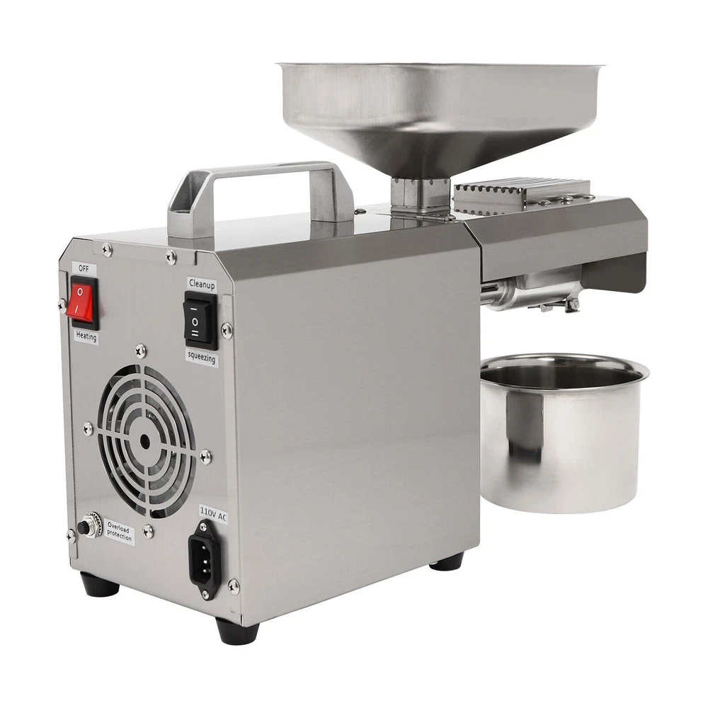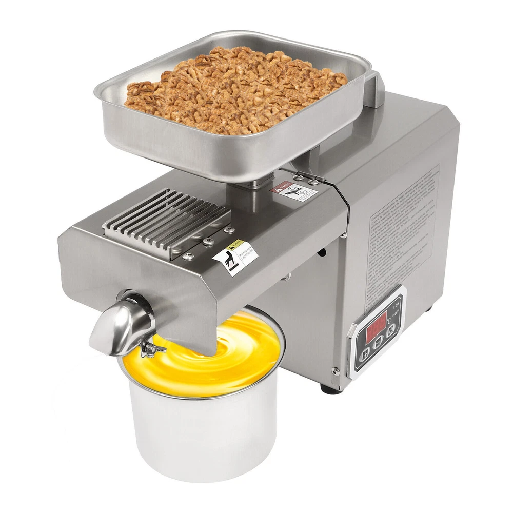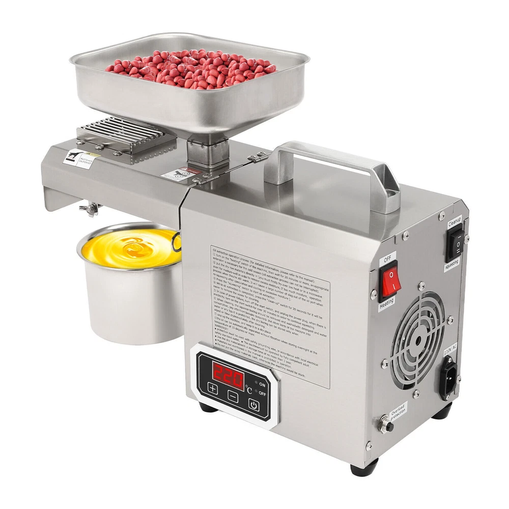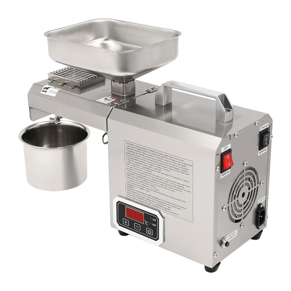 Nowadays, More and More Swill-cooked Dirty Oil Exists in the Market, Which Seriously Affects Our Health. If You Want to Consume High-quality and Healthy Oil, Then Come and Take a Look at Our Oil Press Machine. It Allows You to Extract Your Own Oil at Home, Which Is Not Only Healthier but Also More Economical than the Ones in the Market. Let the Pregnant Women, the Elderly, or the Children in Your Family Live a Healthier and More Reassuring Life! 603 Intelligent Stainless Steel Oil Press Cereals Hot Cold Oil Extractor Machine ❤Welcome❤ Description Nowadays, More and More Swill-cooked Dirty Oil Exists in the Market, Which Seriously Affects Our Health. If You Want to Consume High-quality and Healthy Oil, Then Come and Take a Look at Our Oil Press Machine. It Allows You to Extract Your Own Oil at Home, Which Is Not Only Healthier but Also More Economical than the Ones in the Market. Let the Pregnant Women, the Elderly, or the Children in Your Family Live a Healthier and More Reassuring Life! Key Features Build to Last: Made of Stainless Steel and Adapts a Polish and Heat Treatment, Which Resists Corrosion , Wear, Rust, and Deformation Well, so It Can Withstand the Test of Time. High Efficiency: the 250w Pure Copper Motor, 600w Total Power, 12-Stage Physical Propulsion Type Fine Pressing, and Thickened Squeezing Chamber Make Its Heat Conduction Faster with Stable Pressure and Clear Oil Rate, to Maintain the Food's Rich Nutrition to the Greatest Extent, and It Can Work Continuously for 5-6 Hours, Greatly Improving Your Work Efficiency with Low Power Consumption. Convenient and Nutritious: the Convenient Touch Buttons and Clear Display Are Helpful for You to Control the Oil Yield Accurately and Make You Handy for Every Operation. It Can Directly Squeeze Raw Materials Without Frying and Pressing, and with an Intelligent Constant Temperature Heating Function, It Can Make the Nutrition Not Easily Lost During the Pressing Process. Multi-functional Use: It Is Adjustable from 32-572°F and Supports Both Hot and Cold Presses. for Hot Pressing, Heating at High Temperature First and Then Pressing, It Can Produce a Rich Aroma with a High Oil Yield. for Cold Pressing, Direct Pressing at Low Temperatures, It Can Produce Oil with a Low Loss of Nutrients. High-safety: the Machine Comes with Air-cooling System, Overheat Protection and Overload Protection That Can Timely Reduce the Temperature of the Product During Operation, Prolonging Its Service Life and Ensuring Safety in Use. Details Smooth Handle: the Top Handle Is Insulated Against Heat and Makes It Easy for You to Move the Machine. Foot Pads: the Four Foot Pads Can Help You Put the Product Firmly on the Table and Will Not Easily Slip off. Long Power Cord: It Comes with a Long Electrical Cord(4.92-5.94ft) for Added Convenience and Extraordinary Mobility. Protective Glove: a Protective Glove Is Included in the Package to Keep Your Hands Free from Oil Stains and Enhance Safety During Use . Application It Can Be Used in Restaurants, Food Markets and Homes,Etc. and It Can Press Varieties of Materials Can Be Pressed , Including but Not Limited to Peanuts, Sunflower Seed, Walnut, Soybean, Shelled Hemp Seed, Flax Seed, Camellia Seed, Rapeseed, Black Sesame, White Sesame, Almond, Pepper Seeds, Pumpkin Seeds, Pine Nuts, Licorice, Etc. How to Use 1. Keep the Heating Switch on and Preheat for 10 Mins. 2. Make Sure the Fresh Raw Material Is Dry Enough for a Higher Oil Yield! 3. Turn on the Press Switch and Add a Small Amount of Raw Material to the Hopper First. 4. After Observing the Normal Flow of Oil and Residue, Add a Large Amount of Material to the Hopper. Specification M aterial: Stainless Steel Process: Polish, Heat Treatment Model: 603 Color: Silver Motor: Pure Copper Motor Assembly Required: Yes Mount Type: Countertop Product Care Instructions: Hand Wash Only Control Mode: Intelligent Control Type: Oil Extractor Plug: Us Standard Work Time: 5-6h Power: 600w Voltage: 110v Frequency: 60hz Adjustable Temperature Range: 0-300°C/32-572°F Preheating Time: 10 Minutes or More Power Cord Length: About 1.5-1.8m/4.92-5.91ft Package Size: 53*35*27cm/20.87*13.87*10.63in Overall Size: 46*16*32cm/18.11*6.3*12.6in Gross Weight: 13kg/28.66lb Net Weight: 10.8kg/23.81lb Package Includes 1*Oil Press Machine 1*Power Cord 1*English Manual 1*Oven Glove 1*Brush 1*Filter 1* Container Other Accessories for Installation Notes Freshly Pressed Oil Contains Protein and Is Not Suitable for Direct Use. It Needs to Be Filtered or Left for 1-2 Hours Before Use. Please Do Not Discharge Material During Preheating, and the Press Chamber Should Be Cleaned Before Use. It Is Not Recommended to First Feed Raw Materials and Then Start Pressing. the Material Should Not Be Too Hard, Too Fine, or Free of Oil. If the Oil Backflow During Pressing, It Is Usually Caused by the Blockage of the Oil Outlet. Please Clean the Oil Outlet with the Brush in Time to Keep the Oil Outlet Smooth. Please Strictly Follow the Instructions for Installation and Operation, and Pay Attention to the Safety Matters Inside. When Not in Use for a Long Time, Please Apply a Little Vegetable Oil to the Main Parts of the Machine, Such As the Press Chamber and the Press bar, and Place Them in a Dry and Ventilated Place. Please Preheat for 10 Minutes or More Before Use and Please Pay Attention to Continuous Heating During Use. After Use, the Product Needs to Cool down for a While. Oil Origin, Storage Time, Etc. Will Affect the Rate of Oil Yield, Select the Full Grain of High-quality Oil Extracted Before Buying Oil, the Oil Will Also Be of Higher Quality, and Improve the Oil Yield. Please Note That Dry Materials Can Be Directly Extracted, While Wet Materials Need to Be Fried Dry Before Extracting Oil, in Addition, the Product Cannot Be Used to Extract Olives or Corn, Etc. Please Allow the Slight Color Difference Caused by the Shooting Light and 1-3 Cm Error Due to Manual Measurement, and Make Sure You Do Not Mind Before Ordering