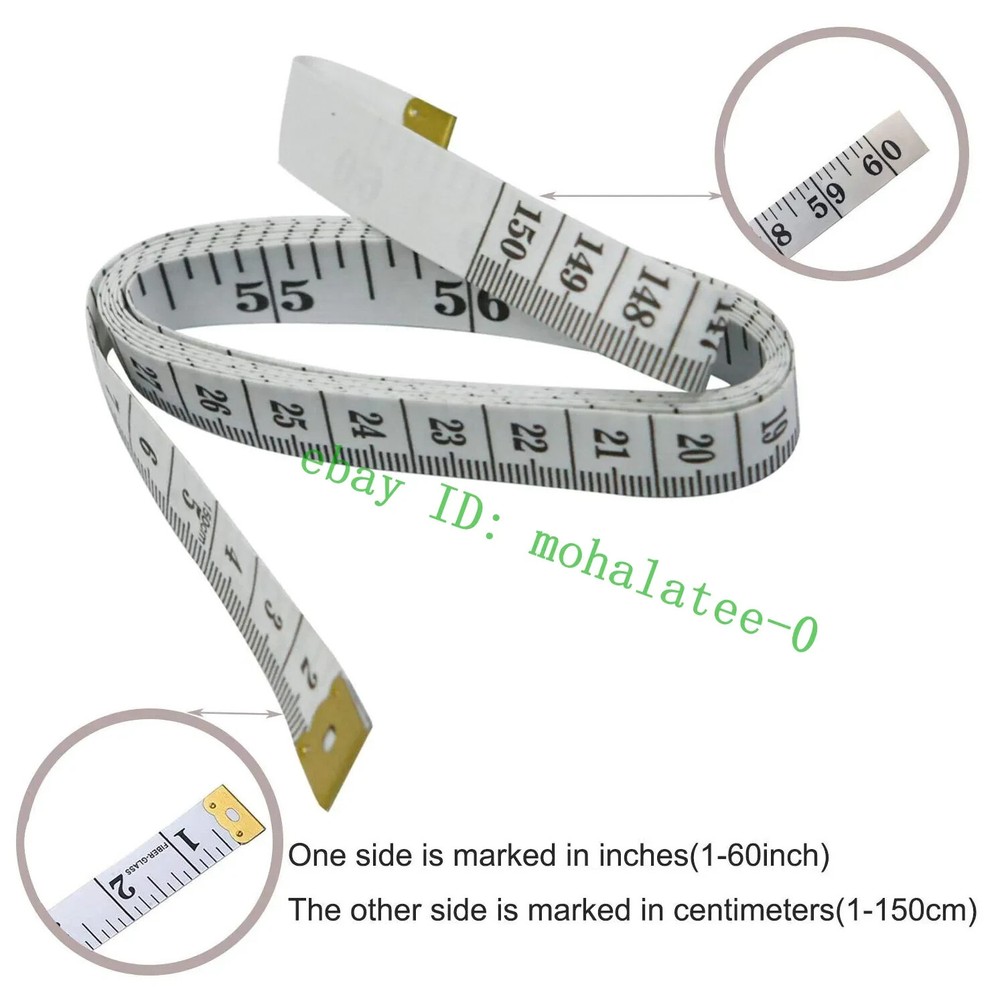About this item Measuring range: 0 to 60 inches and 0 to 150 centimeters. There is a centimeter scale on the back, which is accurately printed in inches and centimeters. Both sides can be measured according to your requirements. You can put one in your pocket or backpack without taking up too much space Great Material: Tailor Vinyl tape measure won't stretch or deform, provides superior measurement consistence; Soft tape measure, a flexible and portable tape measure, made from soft plastic material, white color Operate and Read: Black markings on bright white tape is big enough for you to read, the tape has metal tabs on each end of the cloth tape measure to butt-up against the item your measuring; The metal ends also can prevent fraying Wide Application: Cloth tape measure; body tape measure,sewing tape measure,measuring tape tailor. Good sewing tool, accurate tape measuring for sewing, tailoring, body, waist measurement or measuring any curved surface. can provide you accurate measurements, suitable for a seamstress, a crafter, a quilter or whoever just need a flexible measuring tape