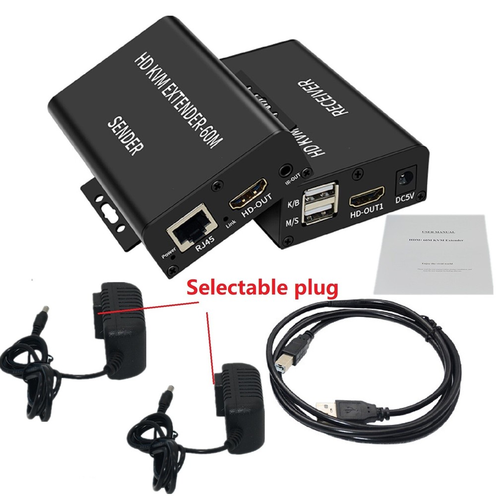 SAFE & SECURE SHOPPING 100% SATISFACTION GUARANTEED FAST SHIPPING Store Categories Store Categories You may also like 60M Video Extension Adapter HDMI KVM USB-A Keyboard RJ45 Lan Ethernet Extender C Product Description 1080P 60m USB HDMI KVM Extender with Dual HDMI Out Over Rj45 Ethernet Cable Video Converter Support HDMI Loop Laptop PC Keyboard Mouse Specifications: Maximum single link range: 1920*1080, 1080p Support output video: HDMI Support synchronous transmission of audio and video Mouse/Keyboard Interface: USB DTV/HDTV: 1080p/1080i/720p/576p/480p/576i/480i Transmission distance: Up to 60m(using CAT6 cable) Operating temperature: 0 ~ +70℃ Operating humidity: 10% ~ 85%RH(no condensation) Storage temperature: -10℃ ~ +80℃ Storage humidity: 5% ~ 95%RH(no condensation) External power supply: DC5V 1A Support POE function: Single ended power supply Color: Black Size: 130x100x27mm Features: This Extender has many features that enable it to perform in superior manner: 1. One pair as a full functional module, no need of setting. 2. CAT-5e/6 cable can substitute HDMI cable to achieve long distance transmission. 3. CAT-5e/6 follow the standard of IEEE-568B 4. Transmission distance can be up to 60 meters for 1080p while using CAT6 cable. 5. Support USB Keyboard/mouse extension,more convenient 6. One HDMI output in the sender side. 7. Two channel HDMI output from the receiver,so,in total 3 monitor can be displayed at the same time 8. HDCP1.2 1.2 compatible 9. Plug and play,easy to use Package Content: 1x Sender 1x Receiver 2x Selecteable Power Adapter 1x USB A-B cable 1x User Guide Shipping Returns Contact Us Payment Shipping We ship most of our orders within 24 hours, and may up to 48 hours. If you want faster shipping way, please contact us before making a payment. Sometimes due to problems with our transportation company system, your shipping information may be delayed to update. We recommend that you try again after 3-4 days. If you still haven't checked the shipping information, you can contact us via ebay message. Returns 1. 30 days warranty from the purchased date. Please contact us via email before returning the defective item. 2.Our warranty does not extended to any product that are physically damaged or that are not under normal operating conditions as result of misuse or improper installation on the buyer/user's part. 3.Return items should include the original packaging and all accessories. buyers MUST contact us for the returning address. 4.In all cases, buyers pay shipping fees at their own cost to return products for exchange or refund. We will be responsible for the postage of replacements. Refund will be made upon receipt of the returned item. Contact Us Pls contact us if you have any problems,we will try our best to solve for you Payment We accept all verified payment from eBay. Copyright © 2022 Tongtool