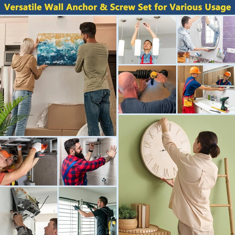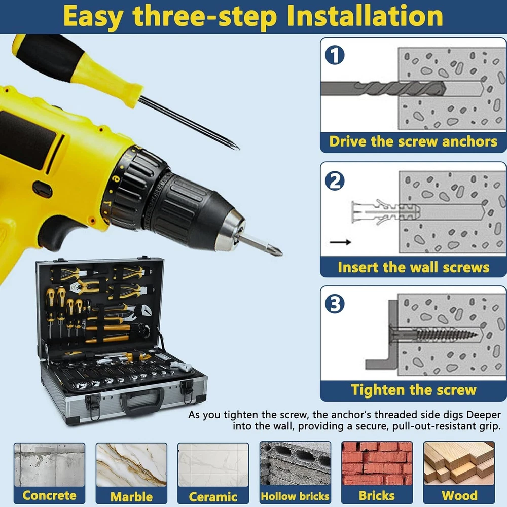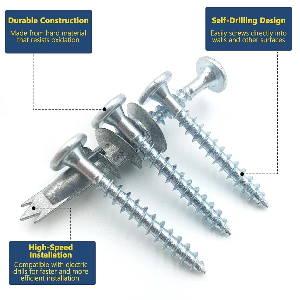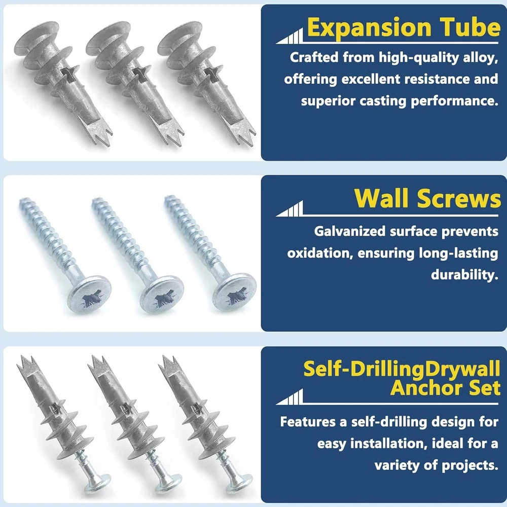60PCS #8 Self-Drilling Drywall Anchors and Screws Kit, Heavy One Size, Silver Product Details Product Dimensions : 1.38 x 0.31 x 0.02 inches; 6.74 ounces Manufacturer : FJCTER Size: One Size Color: Silver Material: Zinc Alloy Brand: FJCTER Item dimensions L x W x H: 1.38 x 0.31 x 0.02 inches PREMIUM QUALITY & STRENGTH: Crafted from high-quality zinc alloy, these drywall anchors are built for strength and durability. Paired with galvanized screws, this drywall anchor kit offers exceptional rust resistance and can support up to 75 lbs. Perfect for wall anchors for drywall heavy duty applications STABLE INSTALLATION DESIGN: Our dry wall anchors and screws kit features deep-cut threads that securely grip drywall, providing a firm hold. These wall screws and anchors drywall heavy duty are designed to ensure a stable, pull-out resistant installation for your home projects HASSLE-FREE INSTALLATION: These self drilling drywall anchors are easy to install without pre-drilling. Simply use a screwdriver or screw gun to secure them into the drywall. This drywall anchor kit minimizes dust and ensures the anchors wedge tightly, providing a strong grip VERSATILE & RELIABLE: Ideal for medium to heavy-duty applications, these drywall anchors and screws kit is perfect for hanging shelves, light fixtures, and more. The quality zinc alloy construction makes these wall anchors for drywall a reliable choice for various installations around your home COMPLETE ANCHORS AND SCREWS KIT: This drywall screws and anchors set includes zinc self drilling drywall anchors paired with high-quality galvanized screws. The anchors are designed to easily penetrate drywall, making this drywall anchor kit a must-have for any DIY enthusiast FJCTER is committed to providing high-quality hardware solutions that simplify your home improvement projects. FJCTER Zinc Self-Drilling Drywall Anchors and Screws Kit is designed for those who seek durability and ease of installation in their wall-mounting needs. PRODUCT FEATURES: High-Quality Zinc Alloy Construction - Made from premium zinc alloy, these drywall anchors are built to last, offering high strength, scratch resistance, and rust protection for reliable long-term use. Heavy-Duty Galvanized Screws - The included screws are made of heavy-duty carbon steel with a galvanized finish, ensuring they resist corrosion and maintain their integrity, even in challenging environments. Deep Thread Design for Stability - The wall anchors feature deep-cut threads that penetrate drywall effectively, providing a secure grip that resists pull-out and holds up to 75 lbs. Effortless Installation - Designed for easy use, these self-drilling drywall anchors can be installed without the need for pre-drilling, reducing installation time and minimizing dust production. Wide Application Range - Perfect for medium-duty applications, these anchors are ideal for hanging shelves, light fixtures, mirrors, curtain rods, and other household items on drywall. Enhanced Holding Power - The large thread design maximizes the holding power of these wall anchors, ensuring your items stay securely in place. Corrosion Resistance - Both the zinc alloy anchors and galvanized screws are resistant to corrosion, making them suitable for use in humid or damp areas like bathrooms and kitchens. SPECIFICATIONS: Material: Zinc Alloy Anchors, Galvanized Carbon Steel Screws Anchor Size: 1/2" x 1-1/4" Screw Size: #8 x 1-3/8" Capacity: Up to 75 lbs Quantity: 30 Anchors & 30 Screws