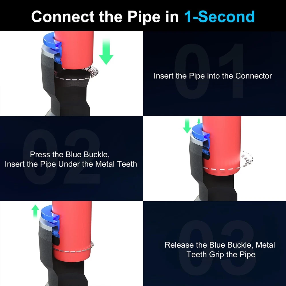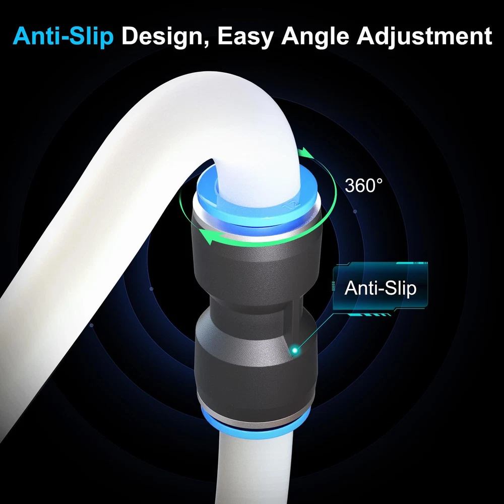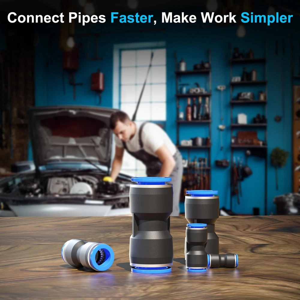 Push connect air fittings Description:This product is a high-performance air line quick connects, renowned for its quick connectivity and lightweight characteristics. Available in five different sizes, the air line push to connect fittings can be effortlessly integrated into your everyday lifestyle and professional work. The air push fitting is extensively used in refrigerator, truck, outdoor sprayer, ship deck, car repair. Quick connect air fittings Features: Lightweight and Strong: The air push is made of high-strength, wear-resistant premium plastic, ensuring a lightweight and long-lasting product. 360-Degree Rotating Cap Design: Quick release fitting Equipped with a high-quality cap that can rotate 360 degrees, it allows for the connection and disconnection of the air tube at any angle. Quick Installation: The pneumatic quick connect features a plug-and-play, quick-connect design. no tools are required. Push connect air fittings:Pneumatic quick connect Air push fitting Broad Application: The can be used as a hose connector for refrigerator, truck, ship, and car repair. Air line fittings Sizes: 5/32” (12 pcs), 1/4” (12 pcs), 5/16” (12 pcs), 3/8” (12 pcs), 1/2” (12 pcs) Pneumatic quick connect Compatible Hose Materials: PU/PA/PE/PVC Air push Medium: Air, water, steam (non-freezing) Air push fitting Color: Black and blue Quick connect air fittings Material: Plastic, stainless steel slot Push connect air fittings Shape: Straight Air line push to connect fittings Set: Five sizes, 60 pieces per box 🧰Lightweight Material and High Sealing:Straight Push Connectors,is constructed from high-strength, wear-resistant quality plastic on the outside,while the inside features stainless steel snap rings and a unique groove design.This provides an excellent balance of lightweight convenience,durability,and airtight sealing.With its anti-aging properties,air push fitting can withstand harsh environments without deforming or breaking. 🧰Versatility and Compatibility:Air line push to connect fittings comes in a variety of sizes to meet the needs of different equipment.Its universal interface design makes it compatible with a wide range of devices and various outer diameter air tubes.The interfaces at both ends of fit snugly,making it suitable for small household appliances and industrial work alike. 🧰360° Rotating Cap:Quick air connector fitting is equipped with a high-quality cap that rotates 360°,allowing you to connect and disconnect the air tube at any angle.This free-rotating design enhances work efficiency,reduces wear and tear on the air tube,and minimizes the risk of twisting or damage. 🧰1-Minute Quick Installation:Push to connect tube fittings kit employs a plug-and-play,quick-connect design.Simply insert the hose directly into the connectors at both ends for a secure connection.When you need to disassemble,just press the blue lock cap and pull it out.Air push quick connect simplifies the process of connecting hoses and reinstalling your equipment,saving you time and effort,and optimizing your workflow. 🧰Broadly Applicable Tool:With its quick-connect design,air line push connectors allows for rapid installation and replacement of air tubes.Its leak-proof design and wear-resistant high quality ensure stability and reliability.Pneumatic quick connect is suitable for everyday evices and industrial applications alike.It can be used with refrigerators,sprayers,small home fountains, trucks,outdoor sprinklers,automotive repair,and dental equipment.Experience the convenience and efficiency of quick air connector fitting today!