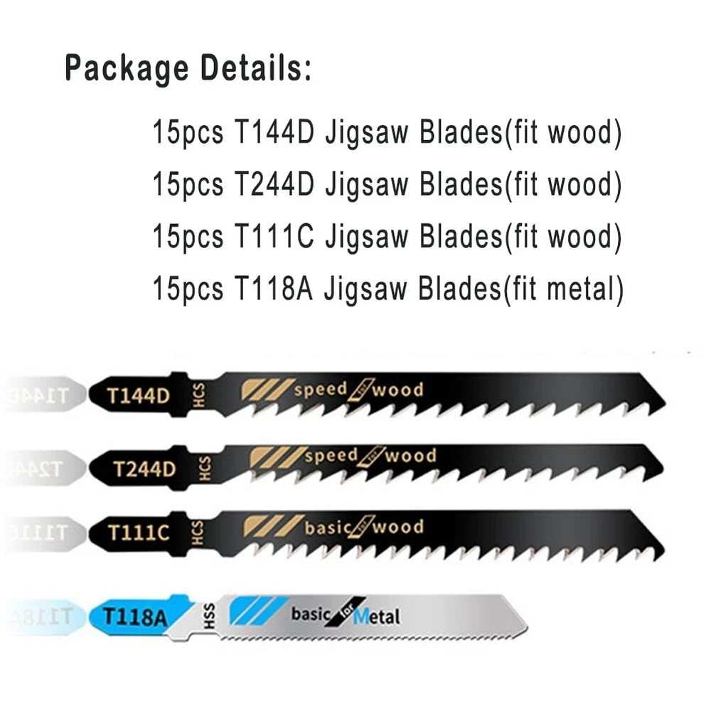 60Pcs Jigsaw Blades Set, Contractor Assorted T Shank Jig Saw Blades, Multi-Purpose HCS/HSS Saw Blades for Cutting Wood, Plastic, PVC and Metal (T144D, T244D, T111C, T118A, Each 15pieces) 60Pcs Jigsaw Blade Set -- 60 Pieces Set includes 15pcs T144D, 15pcs T244D, 15pcs T111C, 15pcs T118A, which with paper box package, widely meet your different needs(T144D, T244D and T111C fit wood, T118A fit metal). Compared with the single and high-priced other saw blades , we have enough cost-effective. Premium Quality HCS/HSS Material -- These jigsaw saw blades are made of high-quality carbon steel, which can improve cutting quality and precision. These Excellent material ensure a longer life and ensures wear tolerance. Convenient -- Jig saw Blades maximizes grip and stability, T shape shank design is stable to grip in the jigsaw and easy to install and remove, it is also help reduce chance to break your device as the T shape shank design does not need to set the screw in a mounting hole. Compatibility -- Jig saw Blades fits most current jigsaw brands and models, are compatible with Bosch , DEWALT , BLACK+DECKER , TACKLIFE , Makita , SKIL , Porter Cable , Ryobi and Rockwell BladeRunner. Fit for most T-Shape Jigsaw blades, the jigsaws is a versatile addition to any toolset. Wide Application -- It's suitable for a variety of occasion, jigsaw blades for Clean and precise straight cutting, Aluminum profiles, metals, copper, wood, plastic, thin metal can be cut effortlessly. 60Pcs Jigsaw Blade Set -- 60 Pieces Set includes 15pcs T144D, 15pcs T244D, 15pcs T111C, 15pcs T118A, which with paper box package, widely meet your different needs(T144D, T244D and T111C fit wood, T118A fit metal). Compared with the single and high-priced other saw blades , we have enough cost-effective. Premium Quality HCS/HSS Material -- These jigsaw saw blades are made of high-quality carbon steel, which can improve cutting quality and precision. These Excellent material ensure a longer life and ensures wear tolerance. Convenient -- Jig saw Blades maximizes grip and stability, T shape shank design is stable to grip in the jigsaw and easy to install and remove, it is also help reduce chance to break your device as the T shape shank design does not need to set the screw in a mounting hole. Compatibility -- Jig saw Blades fits most current jigsaw brands and models, are compatible with Bosch , DEWALT , BLACK+DECKER , TACKLIFE , Makita , SKIL , Porter Cable , Ryobi and Rockwell BladeRunner. Fit for most T-Shape Jigsaw blades, the jigsaws is a versatile addition to any toolset. Wide Application -- It's suitable for a variety of occasion, jigsaw blades for Clean and precise straight cutting, Aluminum profiles, metals, copper, wood, plastic, thin metal can be cut effortlessly. Shipping from the USA All of our products are shipped from the USA, ensuring quick delivery to your destination. Payment We offer the following payment methods: PayPal, credit card, bank transfer, and eBay's secure payment system. Free Shipping & Free Returns Shipping within the USA is FREE. Additionally, any return is absolutely free for you. Risk-Free Purchase You have the option to return an item within 30 days without any justification. We cover the return shipping costs! Fast Shipping We ship immediately upon receipt of payment. Generally, the package is delivered within 2-3 days in the USA. If it takes longer, we will contact you. Quality and Costs Made in Europe, USA, China No customs fees or additional charges Total satisfaction guarantee Invoice with declared VAT available upon request in .pdf format Feedback Your feedback is very important to us. After you pay for your purchase, you will automatically receive positive feedback from us.