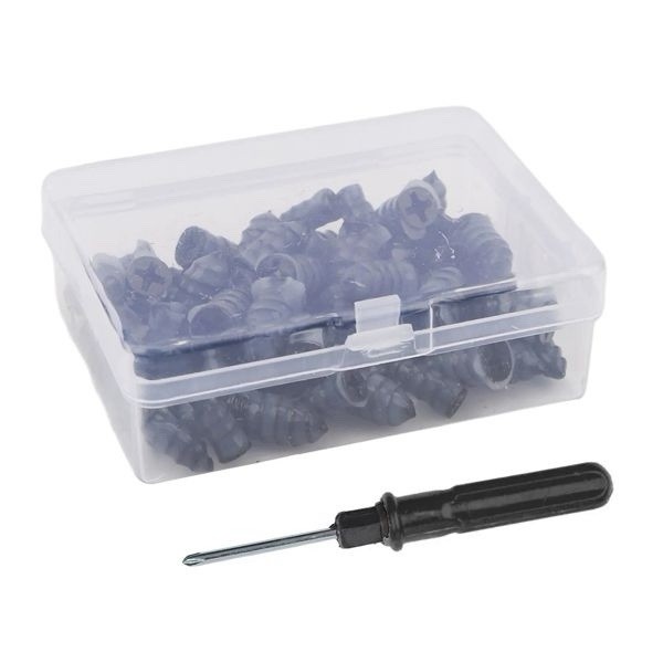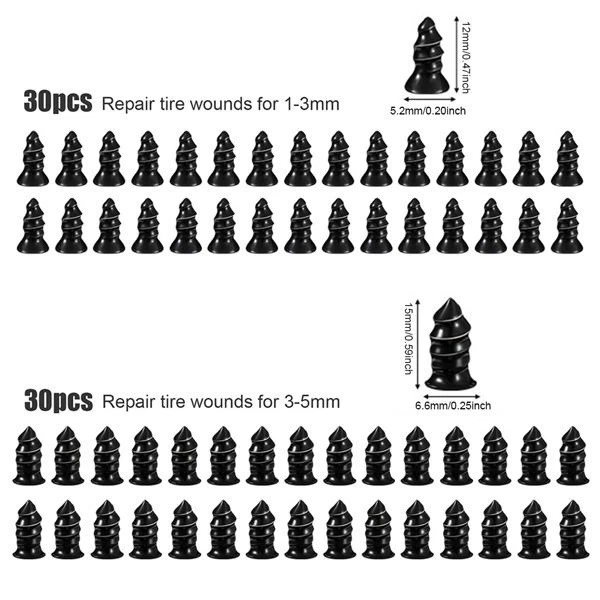 Product Feature: - Easy To Use: The simplest way to repair tires, Simply to insert the nail into the tire wound for a simple and efficient patching job. Repair your tire by yourself, and save your time. Emergency repair tools, easily repair punctures without removing the tire from the rim. - 2 Sizes: 60PCS total and we provide 2 sizes of tire repair nails for you, smaller one is approx. 5.3 x 12mm/0.2 x 0.47 inch and larger one is about 6.6 x 15mm/0.26 x 0.59 inch. - Premium Material and Good Seal: These rubber tire screws are made of high-quality materials rubber and iron, wear-resistant and durable. The middle thick thread can Effectively enhance the bite force between the screw and the tire, with a good sealing effect. - Easy Carrying: Compact package, easy for you to store and carry while traveling, driving, biking and so on. Repair tires by yourself! - Widely Application: These motorcycle tire repair tools have a wide range of usage, suitable for cars, mountain bikes, electric bikes, motorcycles, trucks, and other tubeless vehicles. Specification: Type: Tire Repair Kit Material: Rubber Small Size: about 0.2 x 0.47 inch Large Size: about 0.25 x 0.59 inch Package Included: 60 x Screw tire plugs 1 x Screwdiver