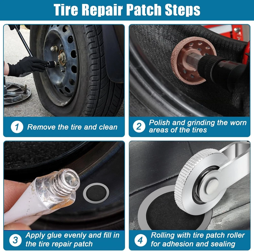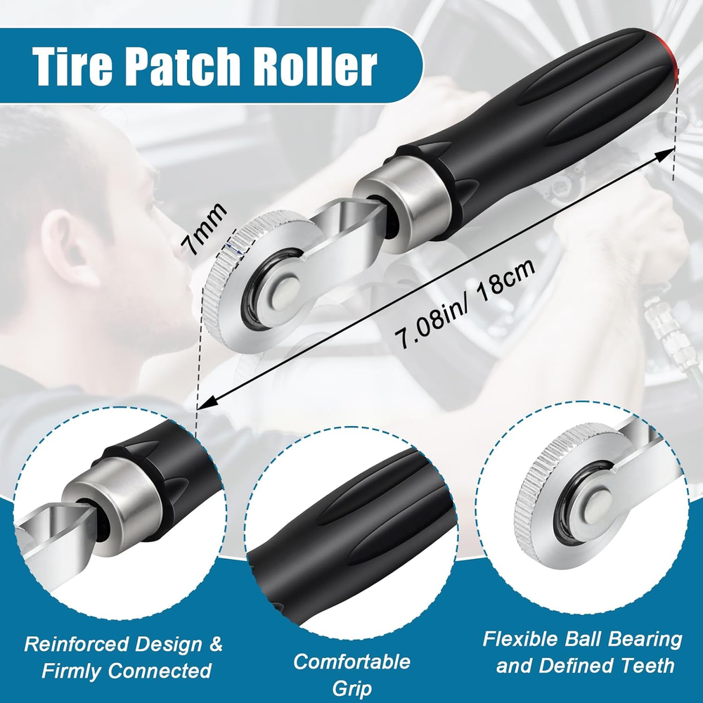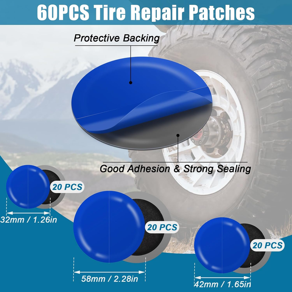 【Thick and Strong Sealing】: The car tire patch is made of thickened natural rubber, good wear resistance, high elasticity, and a protective film on the surface to prevent dust, extending the service life of the tire patch 【60 Patches in 3 Sizes】: The package includes 60 tire repair patches in 3 sizes 1.26 in/ 32 mm, 1.62 in/ 42 mm, and 2.28 in/ 58 mm, 20 sheets of each size. 1 tire repair roller (7.08 inches/18 cm long), a rich number of sizes to meet a variety of tire repair needs 【Heavy-duty】: The long rubber handle of the tire repair roller is ergonomic, labor-saving and light. Its bearing gear is made of high-quality alloy steel, which is strong, grinds smoothly, and effectively removes the air between the tire patch and the tire 【Easy to Use】: First clean the tire surface, then polish and grind the damaged part, evenly apply glue(not included), tear off the protective film of the tire patch tool and stick it on, and roll it back and forth with the tire repair roller to ensure adhesion and sealing 【Widely Used】: Use the tire repair patch plug kit to repair, polish, and grind tires, repair minor damage, and reduce waste tires. It is suitable for different types of tires such as cars, trucks, and bicycles Product Description