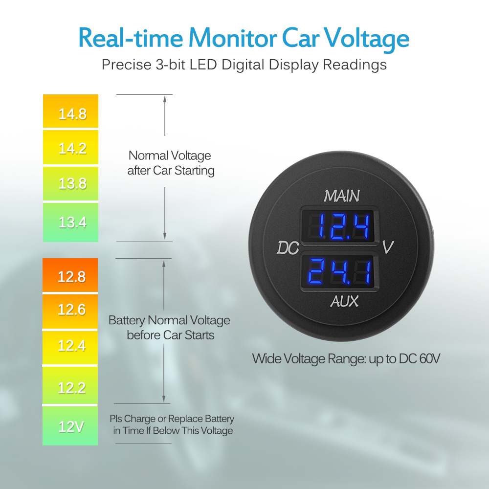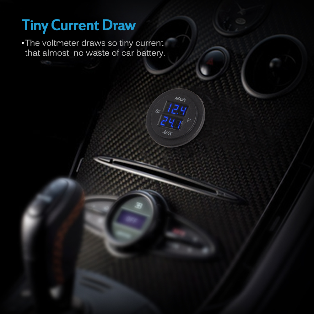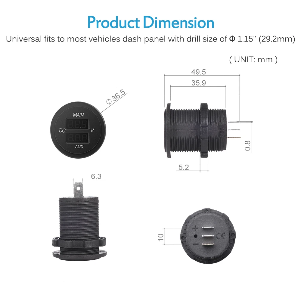 Specification Input Voltage: 10-60V Display: blue led digital display Product Material: durable ABS Surface Size: Φ 36.5mm / 1.44 inch Size of Drill: Φ 29.2mm / 1.15 inch Fit: 12V-24V Car Motorcycle Boat Marine ATV RV Vehicles, etc DC 0-60V Blue LED Digital Display Car Dual Voltmeter Panel for Monitor Pickup RV Specification Input Voltage: 10-60V Display: blue led digital display Product Material: durable ABS Surface Size: Φ 36.5mm / 1.44 inch Size of Drill: Φ 29.2mm / 1.15 inch Fit: 12V-24V Car Motorcycle Boat Marine ATV RV Vehicles, etc About the Item MICTUNING [ Exclusive ] Round Double Voltmeter, real time monitoring 2 battery packs of vehicles, remind you of charge or replacement in time, better avoid emergent dead battery at starting car engine! Embedded in 3-bit Blue LED digital display, Clearly shows you the current precise readings of working volts, better helps you to early notice your car voltage condition Super large input of up to DC 60V with Over-current, Over-volt and Short Circuit Protection, well protects the whole circuit, fits for most 12-24V Car Motorcycle ATV UTV RV Vehicles and Marine Boat Made of Eco-friendly & flame retardant durable ABS plastic and good conductivity pins with black matte surface treatment, wear and tear resistant for long lasting durability Panel Flush Mount and Easy to Install, drill size of 1.15" diameter, with Twist & Lock fastener for stable mounting, Fits to almost all panel locations you desired! LED Digital Dual Voltmeter - Clearly show you precise volts! - Feel upset when you start the vehicle with dead battery? - No idea when to charge or replace your battery? - Have a difficulty to select a voltmeter? MICTUNING NEW version of LED Digital Round Double Voltmeter is the Bright Choice, for Safe and Fun! Input large volts of DC 10-60V, it is suitable for most 12-24V vehicles with 2 battery pack,one for main battery and the other for auxiliary one. With dual led digital display, specially designed to check up real-time voltage for 2 electrical appliances at the same time, which clearly shows you the voltage readings and helps you to better monitor car voltage condition. Say Goodbye to Exhausted Battery Before Each Drive! Reliable Safety Protection Built in over current, over voltage and short circuit protection, it well protects the whole circuit. While made of eco-friendly and flame retardant ABS plastic shell and good conductivity connecting pins, it is super sturdy and lasts for a long long time. Surface Mount, Breeze Install Molded in compact round shell with black matte surface treatment and drill size of 1.15" diameter to fit for most almost all dashboard panels, this double voltmeter is universal fitted to most RVs, Campers, Pickups, Vans, Trucks, Trailers, Marine Boats, etc. Get One for Your Vehicle, Well Know of Car! Payment Delivery details Pay attention Returns Contact us Payment We accept internet transfer, bank deposit and all major credit cards through Payoneer. If buyer want to delay the payment because of financial problem, please contact us via ebay message within 1 days. If buyers have any problem in payment, feel free to contact us or ebay customers service. Delivery details We ships to worldwide. Shipment will be triggered within 1-2 business days, only after payment is received in full. We do not offer same day or overnight delivery service at this stage. Delivery time is estimated by shipping carrier and may vary depends on the size, location, and natural environment by the time of the delivery. Please understand, we cannot guarantee delivery time and cannot be held responsible for any delay outside of our control. Please contact us for estimated delivery time. Economy shipping: We ship to Order Address Only . Please make sure your address in Payment account is matched with your shipping address before placing an order. We ship worldwide via Air-Mail, 95% of tracking number is available. Expedited shipping: Express Mail Service is available. You need to contact us about this service. Pay attention International Buyers – Please Note: Import duties, taxes and charges are not included in the item price or shipping charges. These charges are the buyer's responsibility. Please check with your country's customs office to determine what these additional costs will be prior to bidding/buying. When you receive item damaged, Defective, not as describe or wrong one, please email us pictures within 24 hours to resolve any problem better and fater: 1. All labels with clear words on the package; 2. The real goods you receive; 3. Different angles of the products and package to show the problem clearly. Returns In case the item is defective, please inform us within 30 days of receipt, we will arrange reship or refund. Buyers have to pay for the return cost and we will pay the cost for resend. Please note we do not accept International Return (For customer who purchase via Global Shipping Program) Contact us If you are unsatisfied with our item or service, please contact us before leaving any feedback. We are committed to resolve all issues in a friendly and satisfactory manner. We always reply to messages within 2 business days (off-duty at weekends). If you do not get a response from us, then please check your junk or spam mailbox.