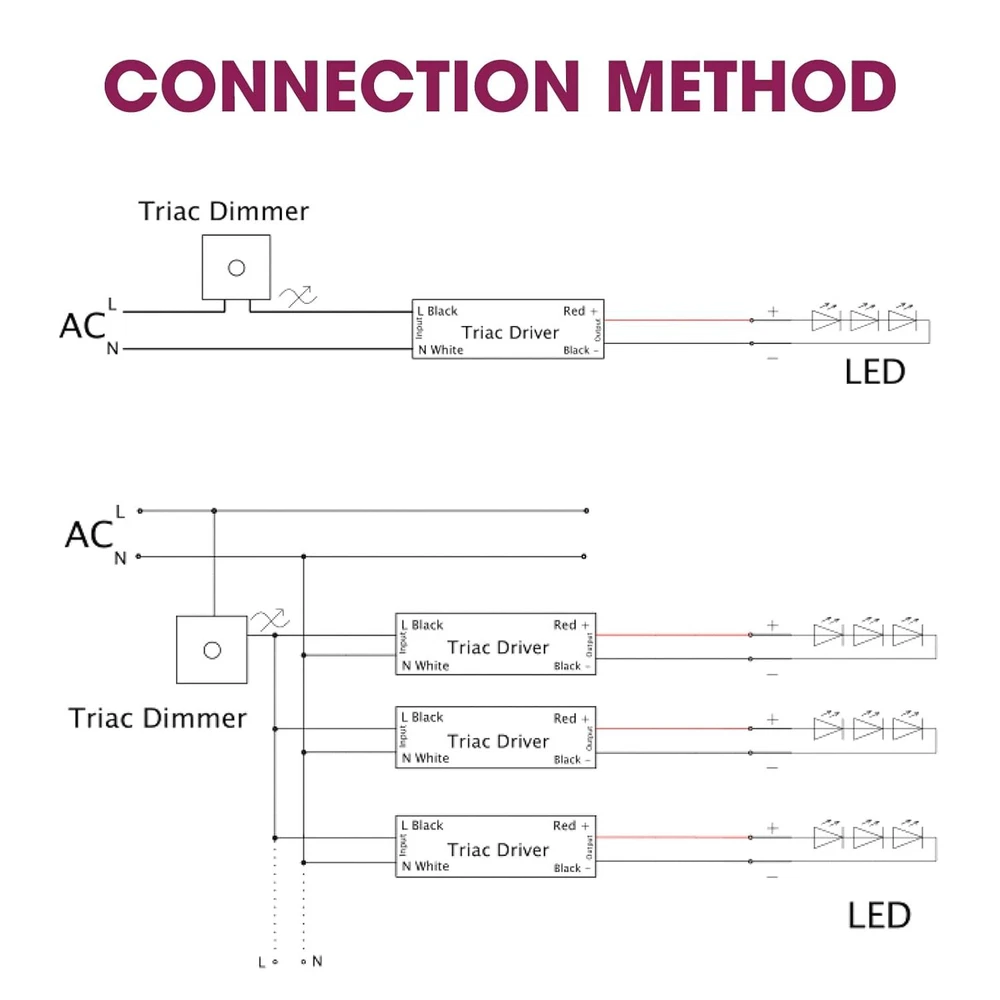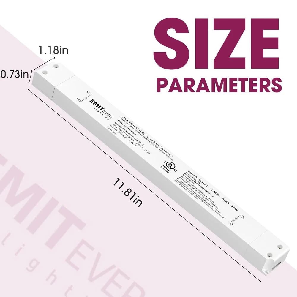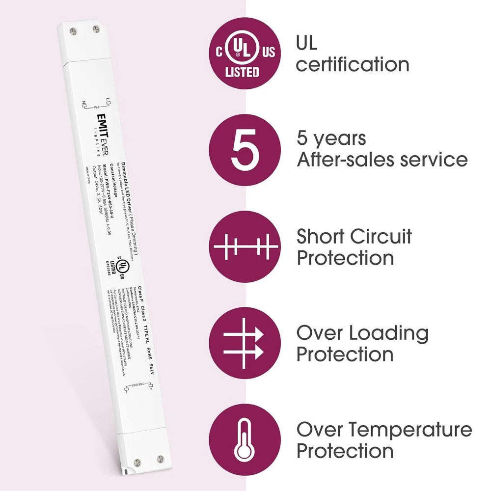 Product Description 60W Slim Triac Dimmable LED Driver,100-277V AC to 24V DC Power Supply,0-100% Dimming Transformer for LED Lights,Compatible with Lutron and Leviton Dimmers,Class 2,UL Listed Stable output:PWM output, does not change the color index.0-100% smooth and full range flicker-free dimming.Newly upgraded exterior design better for DC 24V LED Lighting such as LED strips, modules, light bars, puck, under cabinet and other LED accent lights. Triac Dimmable:Compatible with Forward phase, Reverse phase, Triac, MLV, ELV Dimmers.For Lutron,Leviton,Legrand,Cooper AH and most Triac dimmer. Easy to install:The red and black wires are correctly connected to the LED device, refer to the specific connection method in the image. Premium Construction:Built-in protection includes short circuit,over loading,over temperature(100℃±10℃ shut down o/p voltage, automatically recover after cooling.).Power factor up to 0.99,more efficient dimmable driver runtime system,high efficiency up to 86%,lower cost of use. Specifications:cUL us listed, Class 2, Class P, Type HL, FCC compliant.Full protection plastic case,for dry and damp locations.IP30,5-Year After-Service. About Us We are a reputable seller with many years of experience selling on eBay. Our goal is to provide high-quality products and excellent customer service. Shipping Items will be shipped within 1-3 business days when we received payment. (Orders are not processed on weekends & holidays) Tracking information will be sent once item is shipped. Delivery time depends on destination and other factors Item is shipped to ebay address. Leaving correct address can minimize delay. For international shipping and shipping to Guam, Hawaii and Alaska, Please contact us before placing the order. International buyers please note: Import duties, taxes and charges are not included in the item price or shipping charges. These charges are buyer’s responsibility. We will try our best to reduce the risk of the custom duties. Local pick-up is unavailable at the moment. Contact Us We reply any email messages within 1 business / working days(off-duty at weekend). If you do not get a response from us, then please check your junk or spam mailbox. Our Business hours: Mon-Fri 9:00-18:00, UTC/GMT +8 hours. Please contact us either by clicking "contact seller" in the "purchase history" section or simply click "ask a question" at the bottom of this page. If you are unsatisfied with our item or service, please contact us before leaving any feedback. We are committed to resolve all issues in a friendly and satisfactory manner.