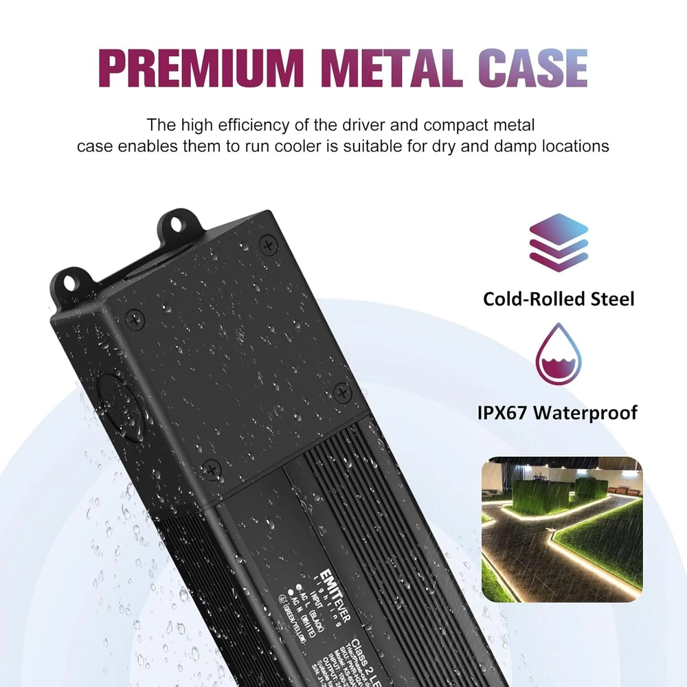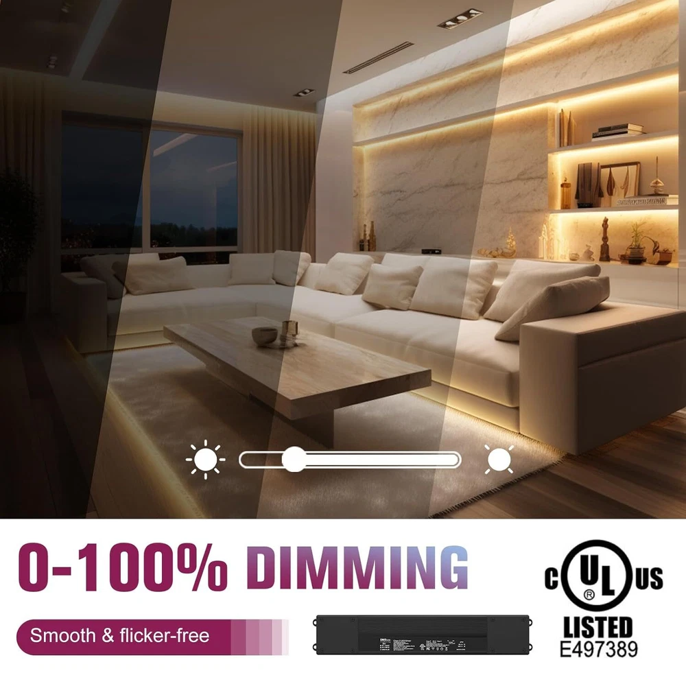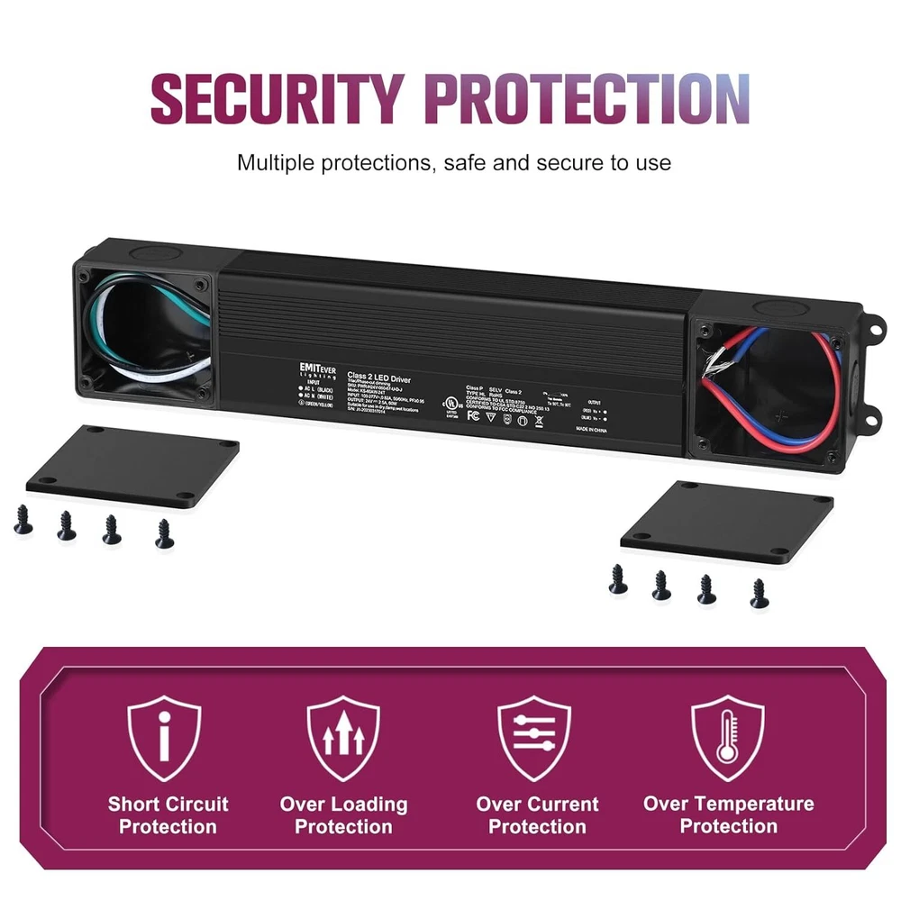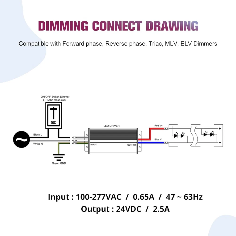 Product Description 60W Triac Dimmable LED Driver, 100-277VAC to 24VDC Dimmable Power Supply,Waterproof IP67 Transformer for Indoor Outdoor LED Lights,Compatible with Lutron and Leviton Dimmers,Class 2,UL Listed Triac Dimmer:Dimmable LED driver is class 2 rated and designed to compatible with Forward phase, Reverse phase, Triac, MLV, ELV Dimmers. Waterproof IP67:This AC to DC Transformer is suitable for dry and damp locations, ideal for indoor and outdoor use.Standard built-in protections include against input surge, over current, output over voltage, short circuit, and over temperature. Stable Output:Dimmable power supply works for DC24V LED Lighting such as LED strips, modules, light bars, puck, under cabinet and other LED accent lights.0-100% smooth and full range flicker-free dimming. Easy to install:The red and black wires are correctly connected to the dimmable LED device, refer to the specific connection method in the image. Specifications:cUL us Listed, Class 2, Class P, Type HL, FCC compliant, damp location rated,It is incredibly robust and includes a 5-Year After-Service. .If you have any questions about produce,our customer service team is always available to help. About Us We are a reputable seller with many years of experience selling on eBay. Our goal is to provide high-quality products and excellent customer service. Shipping Items will be shipped within 1-3 business days when we received payment. (Orders are not processed on weekends & holidays) Tracking information will be sent once item is shipped. Delivery time depends on destination and other factors Item is shipped to ebay address. Leaving correct address can minimize delay. For international shipping and shipping to Guam, Hawaii and Alaska, Please contact us before placing the order. International buyers please note: Import duties, taxes and charges are not included in the item price or shipping charges. These charges are buyer’s responsibility. We will try our best to reduce the risk of the custom duties. Local pick-up is unavailable at the moment. Contact Us We reply any email messages within 1 business / working days(off-duty at weekend). If you do not get a response from us, then please check your junk or spam mailbox. Our Business hours: Mon-Fri 9:00-18:00, UTC/GMT +8 hours. Please contact us either by clicking "contact seller" in the "purchase history" section or simply click "ask a question" at the bottom of this page. If you are unsatisfied with our item or service, please contact us before leaving any feedback. We are committed to resolve all issues in a friendly and satisfactory manner.