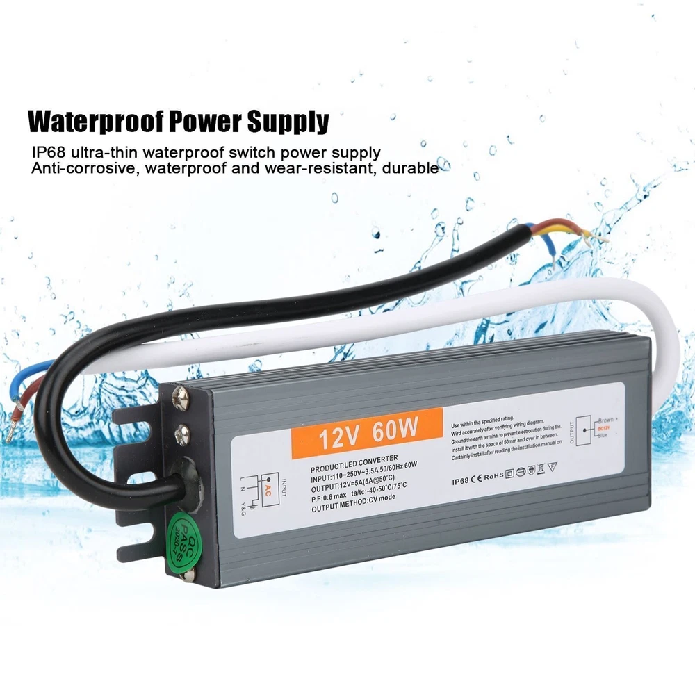 Feature: 1. IP67 ultra‑thin waterproof switch power supply, safe and reliable. 2. The surface is anodized, anti‑corrosive, waterproof and wear‑resistant, durable. 3. Low DC ripple, high efficiency, easy and convenient for installation. 4. Excellent insulation and high dielectric strength, 60W output power. 5. High efficiency, long life and high reliability, wiring installation mode. Specification: Condition: Brand New Item Type: Waterproof Power Supply Material: Aluminum alloy Model: 60W Output Power: 60W Input Voltage: AC110-250V (50/60Hz) Protection Level: IP67 Output Voltage Accuracy: 98 (%) Output Ripple Noise: 100MVP-P Installation: Wiring Package List: 1 x Waterproof Power Supply