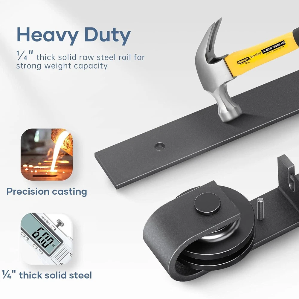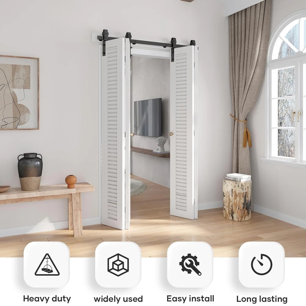 Store category Sign Up Now ! You may also like Product Description Safe Design: Improve your home's elegance with our Barn Door Hardware that provides a safe and secure design for children, making it ideal for a wide range of applications including home and business. Its folding feature adds functionality and saves ample space. Long-Lasting Performance: Featuring wear-resistant nylon wheels rollers and robust carbon steel, our barn door hardware promises long-lasting strength and a smooth sliding motion. Effortlessly Install: Intuitively designed bi-fold sliding barn door kit ensures easy installation, saving time with detailed instructions for any total width. Versatile & Complete: This barn door hardware complete set is made for versatile preferences and needs, allowing effortless sliding for doors with thickness ranging from 35mm to 45mm. Door not included, all accessories provided. Widespread Use: Upgrade your home with our Barn Door Hardware. Perfect for living rooms, restaurants, and various living situations, it ensures a noiseless and seamless slide that maximizes privacy and style. Transform your home with our sliding door hardware. Equipped with durable nylon wheels rollers, it meets all your different needs. With our detailed instructions, installation is quick and easy, ensuring smooth operation for years. Specification: Name: Barn Door Hardware Colour: Black Material: Carbon steel Track Size: about 60 inches/152cm Track Splicing Method: 2 pieces Scope of Application: Door panel thickness 0.5-50mm Packing List: 2* FT Track 4* Roller 4* Roller Swivel Stand 2* Roller Holder 3* Spacers 6* Hinge 2* Ground Guide Fixings 2* Sealing Strip 1* Screw Pack 1* Instruction Manual 5* Pipe Clamp 35mm 5* Wood Screws M8*90 8* External Hexagonal Machine Wire M10*60 8* Cover M10 Notes: 1. Due to the different monitor and light effects, the actual color of the item might be slightly different from the color which is showed in the pictures. 2. Please forgive a slight measuring deviation due to manual measurement. 3. Door is Not Included. Payment Delivery details Terms of sales About us Feedback & DSRs Payment Before you palce an order, please kindly make sure that you have a paypal account. We accept PAYPAL payment only. Payment should be completed within 2 days after auction closed, or unpaid dispute will be filed for an closing auction. An unpaid case will be filled after 4 days. Delivery details We ship to your eBay address. Each package will be shipped to US by UPS Regular Parcel with tracking number. Please check your shipping address carefully before checkout, it can't be changed if order completed. All items will be shipped within 1-2 business day upon receipt of payment.Orders placed on weekend will be shipped within 3 days. If you do not receive your item in 7-10 business days.please contact us immediately for further assistance. We will be responsible for any damages or losses incurred in the shipping process. About us We maintain high standards of excellence FIVE STAR and strive for 100% customer satisfaction! Positive Feedback is very important to us. We hope that you contact us immediately Before you give us neutral or negative feedback, so that we can satisfactorily address your concerns. We promise to offer the lowest price and high quality produce. Our working time: From Monday to Friday(9:30 am to 18:00pm), we don't working on holidays ,hope you can understand and know that , thank you. Please always talk to us via ebay Message. We appreciate your business and look forward to growing our e-Bay sales with satisfied customers. Feedback Contact us If you have any questions, please feel free to contact with us by ebay Message during our business hours ( 9:30a.m. to 5:30 p.m.), or email us through eBay, we will try our best to help you to resolve it. For any presale or after-sale questions,please do feel free to email us! Due to the time difference, each email will be replied within 1 working day,and weekend will be delayed a bit. Feedback