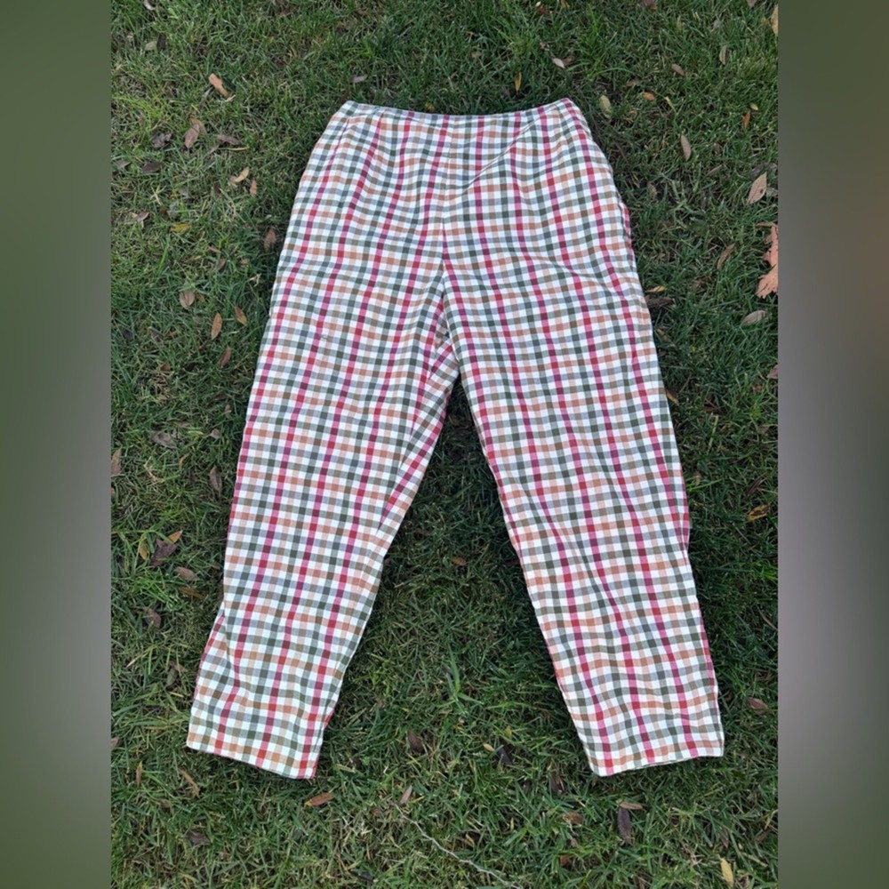 These 1960s pants are a preppy dream. Made of a white, red, green, and yellow gingham plaid cotton, they are high waisted and zip at the back. They have a cropped capri style skinny leg. Overall in good vintage condition - a small hole on one knee and some seam stress - see last two photos. Has no size tag, handmade. See measurements in photos for best fit.