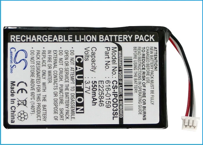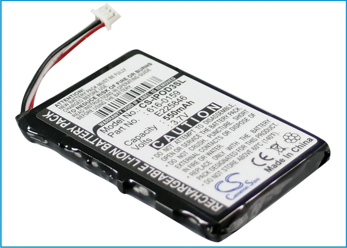 Product Photos Description # Type: Li-ion # Capacity: 550mAh # Dimension: 47.85 x 31.61 x 5.35mm # Voltage: 3.7V # Condition: New, with 12 months wty # Certificate: ISO9001, RoHS & CE Please make sure you select the correct battery model for your devices. Please make sure your original battery model is same as the replacement battery. If the battery you look for is not in the description, please email us. We are always here for providing best service. (*^▽^*) # Part Number: Apple 616-0159 E225846 Compatibility Apple iPOD 3th Generation iPOD 20GB M9244LL/A iPOD 15GB M9460LL/A iPOD 30GB M8948LL/A iPOD 10GB M8976LL/A iPOD 40GB M9245LL/A Terms & Conditions Tips you need to consume all electricity of the battery when you use it at the beginning, then charge it . Repeat this practice 2-3 times,it can extend the battery 's life Shipping Policy BatteryCentre offers a FREE USPS SHIPPING on all domestic orders. Express Shipping options are also available at additional cost. All orders take 48 hours (Mon-Fri) to process before being shipped. In most cases, your order is shipped out at the same business day when you place the order. This Processing Time is completely separate from the Shipping Time, therefore, to estimate Delivery Time, please consider the following: Processing Time + Shipping Time = Delivery Time Please note that the Delivery Time doesn't count the weekends and USA national holidays. Return Policy We make the returns without pain. Within 14 days after receipt of products, you may choose to return the product(s) for a full refund, exchange or replacement. After 14 days of receipt, you can return the product(s) only for replacement due to defective (excluding wear-down effect) if your warranty has not expried. Taxes California sales tax of 7.5% will apply to orders shipped to an address in the State of California. we promise 1. All Products are Certificated with ISO9001, RoHS, and CE.A grade quality, 100% new, durable and practical.Cameron Sino 12 years experience in battery. 2. 100% New Manufacturer, factory direct supply and best price, works as genuine parts, Grade A cells ensure fast charges and low power consumption; Built-in circuit protection ensures both safety and stability. 3. This is a for you to save money, save time, high capacity of circular function, perfect to replace the original battery, can according to need to charge or discharge, without loss of capacity. 4. Warranty: Your Repeat Business Is Important for Us, Any Question, Please Feel Free to Contact Us. We Promise that We Will Help You to Solve Questions.24 x 7 Email Support. 5.Need more battery! You can contact us ~~(*^▽^*)~~ Feedback We strive to provide the best products and services. Your positive feedback 5 stars DSR help us do better . If anything about your transaction did not meet expectations, please CONTACT US and give us the opportunity to make things right. We are always here to help.