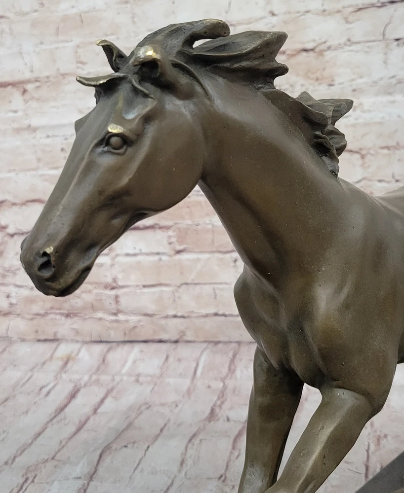 Condition : This sculpture is in perfect condition Bronze Dimensions with Marble Base: Height 15" X Width 24" Marble Dimensions:20" X 6.5" Height without base:14" Weight:35 LBS Inventory:18Y55210581 This captivating bronze sculpture captures the essence of a feral horse standing solemnly in a peaceful valley. The horse's demeanor exudes calmness and tranquility, with its long mane and untamed appearance symbolizing its wild nature. The lean body of the horse adds to its natural grace and beauty, making it an ideal piece for equestrian enthusiasts or anyone who appreciates the majestic beauty of horses. Resting on a sturdy black marble base, this sculpture is meticulously crafted using the lost wax method, a traditional technique that ensures the finest details are preserved with exceptional accuracy. The artist's signature, Mene, adds quality and value to the artwork, reflecting the skill and expertise behind its creation. Whether displayed in a home, office, or gallery, this sculpture serves as a timeless tribute to the untamed spirit of horses and the artistry involved in capturing their essence. It invites viewers to connect with the beauty of nature and the awe-inspiring presence of these magnificent animals, making it a cherished addition to any collection. Horse Lover Gift Equestrian Art Bronze Sculpture Statue Collector Artwork Gift Video will open in a new window Using the eBay App? Paste link into a browser window: [isdntekvideo]