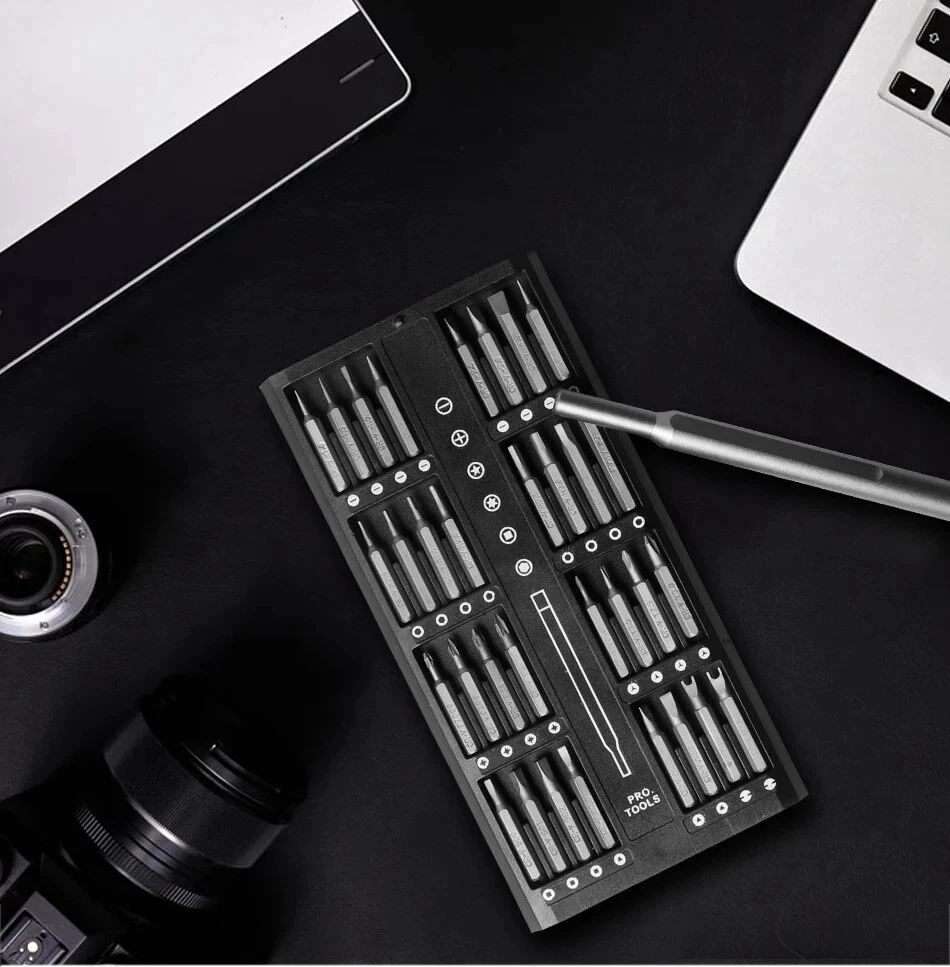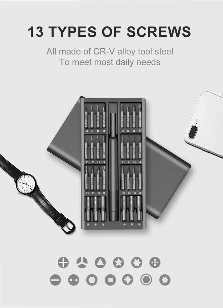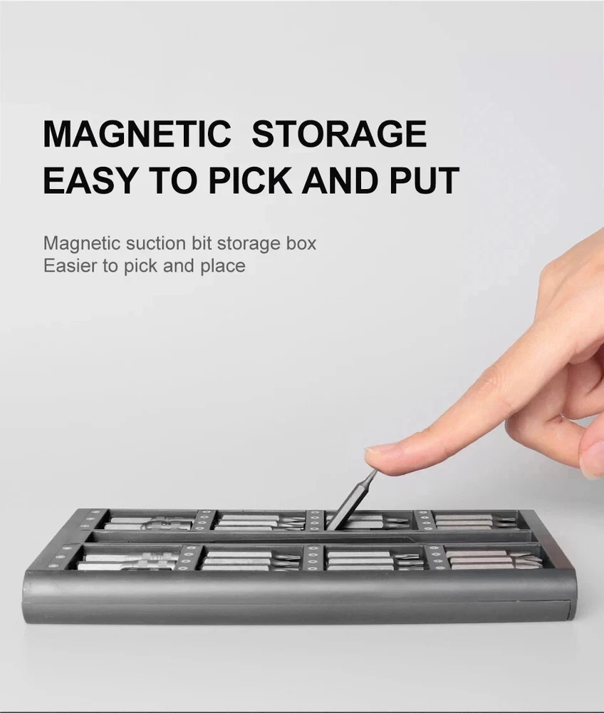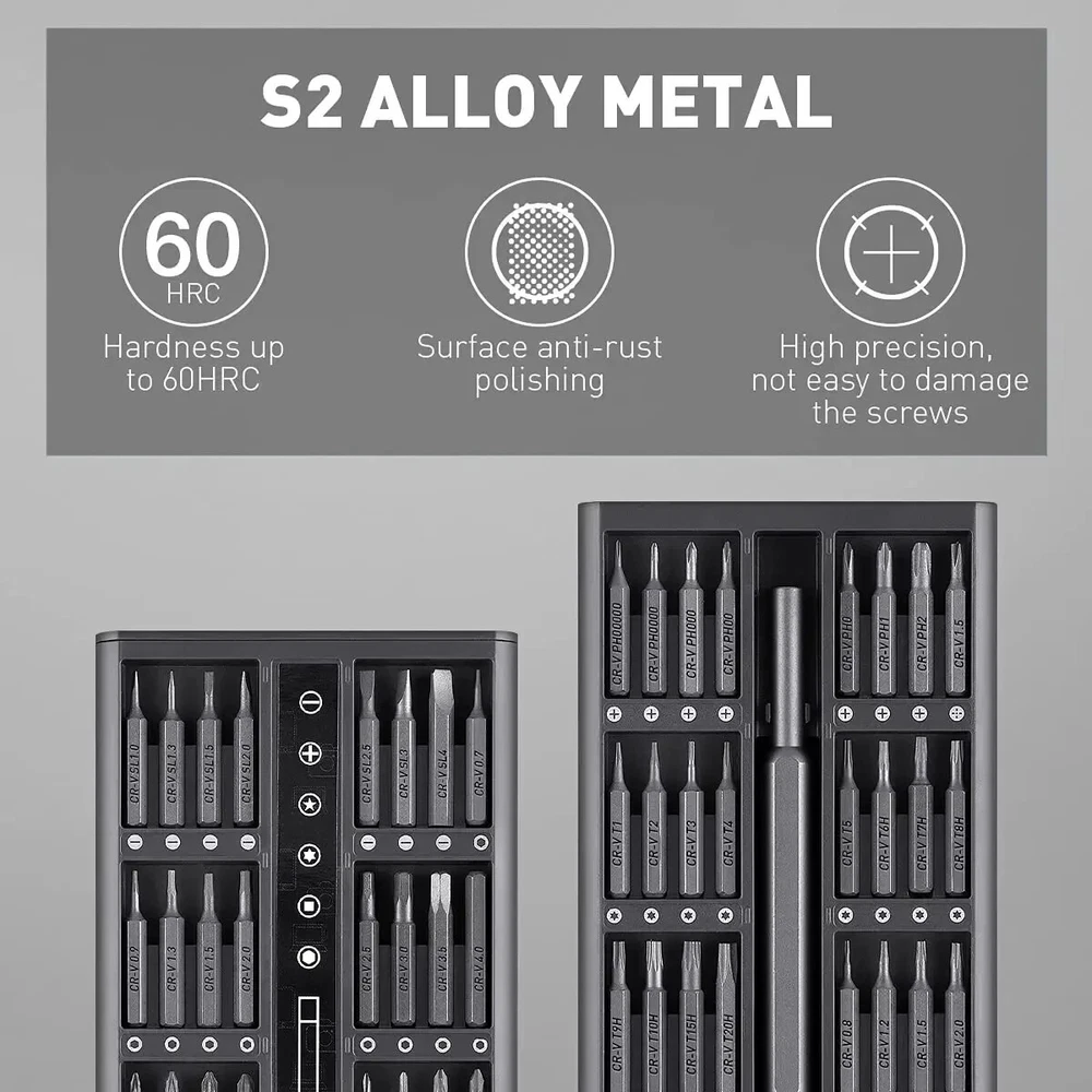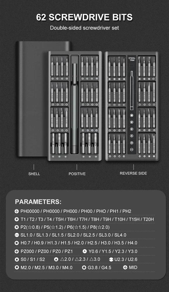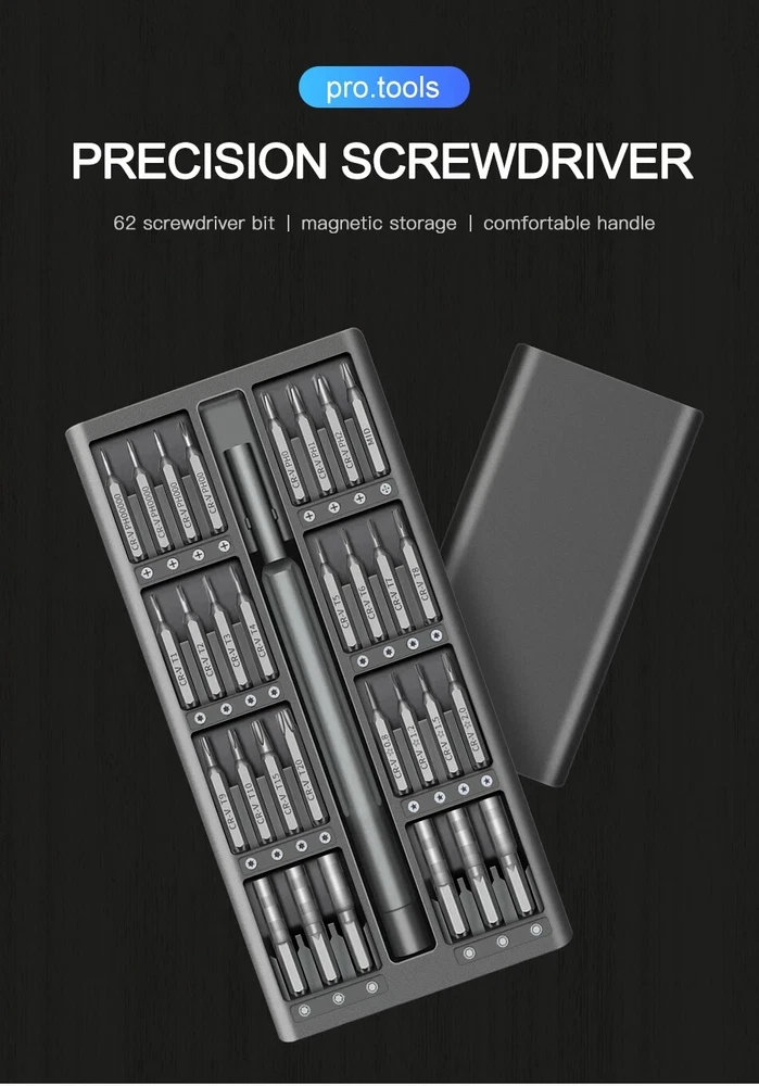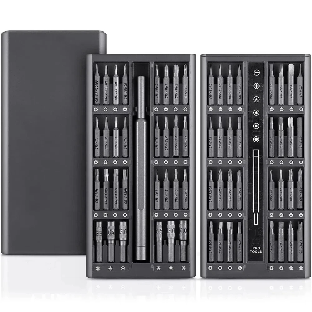 Today we introduce a brand new and powerful 【63-in-1 precision screwdriver Set】Believe in your choice, you won't regret buying it. 【Super High-Quality CR-V Metal】Mini screwdriver set is made of CR-V Alloy, which is impact-resistant, wear-resistant, sturdy and durable. All bits are well made with strict quality control with high precision to make sure all your repairing work precisely and reliable. 【High Precision Screwdriver Set】Multi-magnetic driver Specially used for electronic equipment products.This screwdriver set includ of 62pcs screw bits(phillips, pentalobe, torx,hex, slotted, triangle, square and other sizes).It has a wide range of applications. 【Rotatable Light Handle&Strong Magnetic Head】: The precision screwdriver aluminum handle is light and portable in a ergonomically design. The handle will not hurt your hands during a long-lasting work. On the contrary, it is suitable for long-term professional use. There is a strong Magnetic design on the top of the screwdriver , which can be firmly hold and make your work more efficient. 【Easy to Carry】 Precision screwdriver set have storage space is designed reasonably, the screwdriver bits placement position and the size of the accessories are consistent, and the parts are not easy to fall out, which is convenient for your work. 【Simple Design】 The screwdriver set box has, a perfect compact design, a magnetic bit position, and a portable size. Just gently squeeze, you can easily pop out. 63 bits in the following sizes: Flathead sizes: 1.0, 1.3, 1.5, 2.0, 2.5, 3, 4 JIS sizes: PZ000, PZ00, PZ0, PZ1 Hex sizes: 0.7, 0.9, 1.3, 1.5, 2.0, 2.5, 3.0, 3.5, 4.0 Phillips sizes: PH00000, PH0000, PH000, PH00, PH0, PH1, PH2 Torx sizes: T1, T2, T3, T4, T5, T6H, T7H, T8H,T9H, T10H, T15H, T20H Y0.6, Y1.5, Y2.5, Y3.0 Mainboard size: 1.5 Triangle size: 2, 2.3, 3.0 U2.3, U2.6 Star sizes 0.8, 1.2, 1.5, 2.0 Square sizes SQ0, SQ1, SQ2 Nut Driver sizes 2.0, 2.5, 3.0, 3.8, 4.0, G4 specifications product name:63 in 1 Precision Screwdriver Set SIze:20*10*3.3 cm material quality:CRV Handle material:Aluminum alloy handle Shell material: ABS Note: Please allow 1-2cm measuring deviation due to manual measurement Due to various monitors and lighting conditions, colors may be slightly different from listed photos